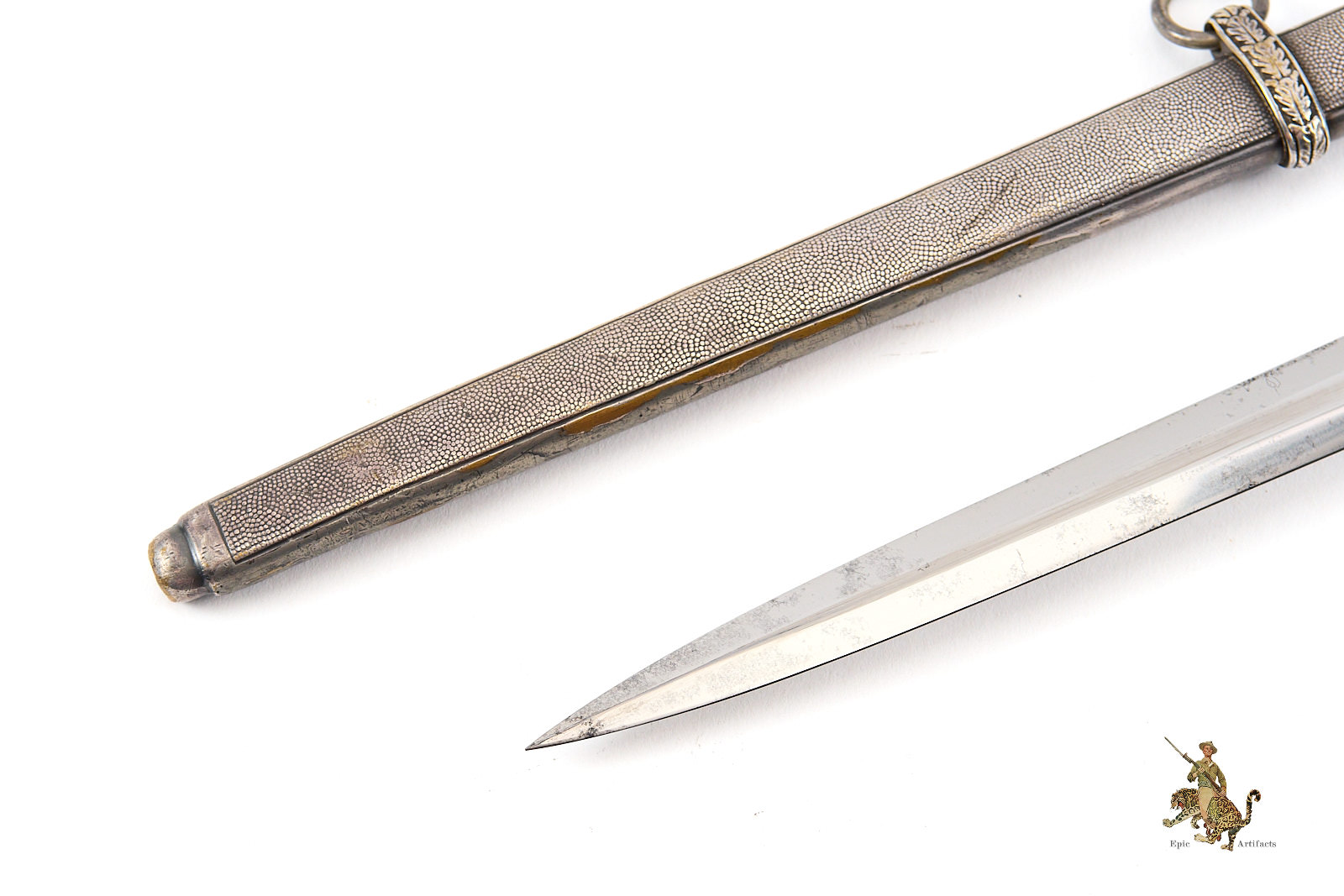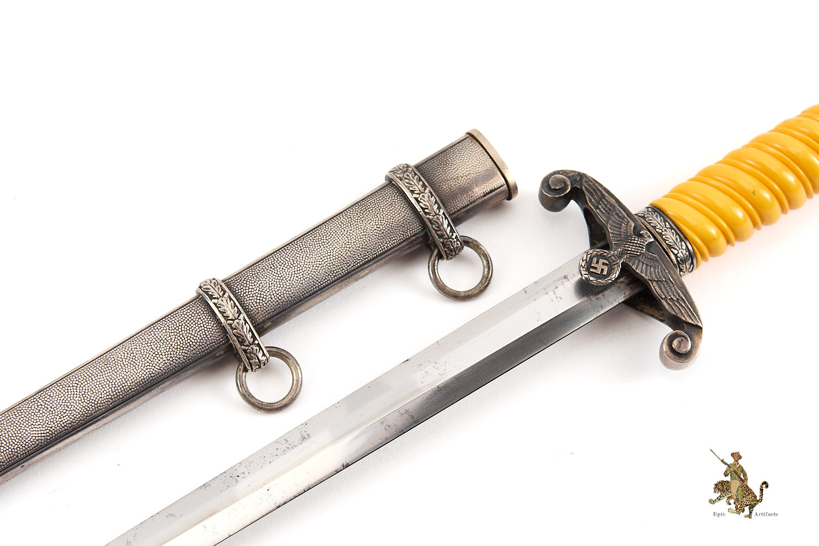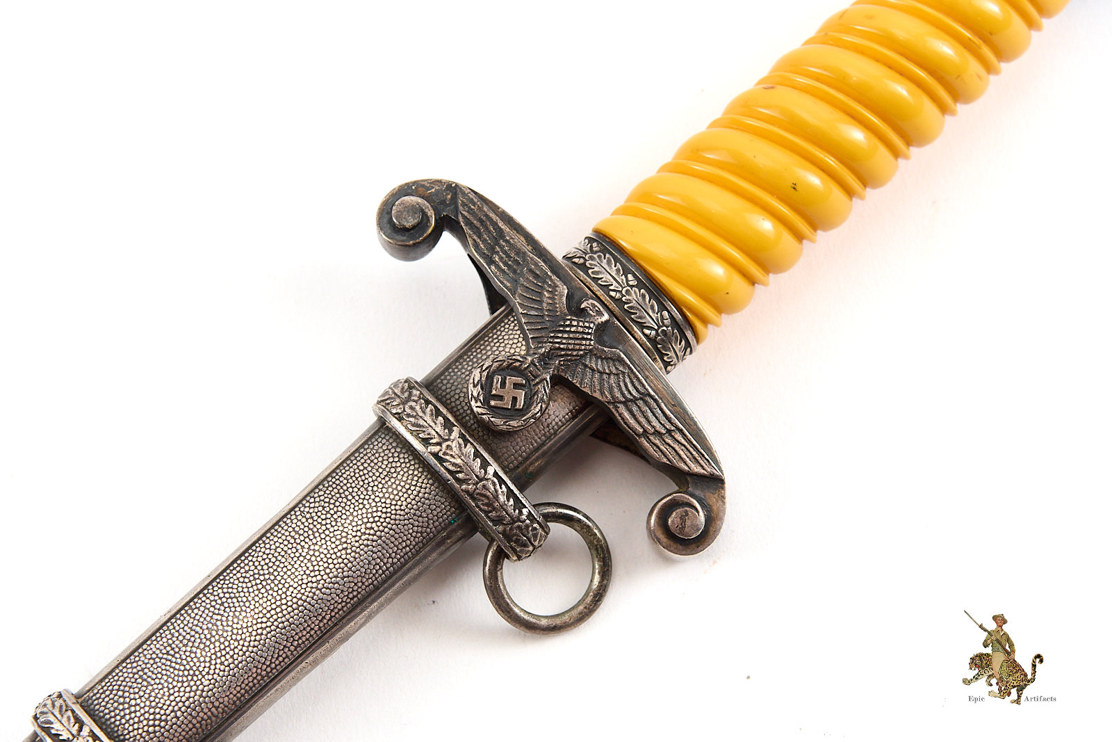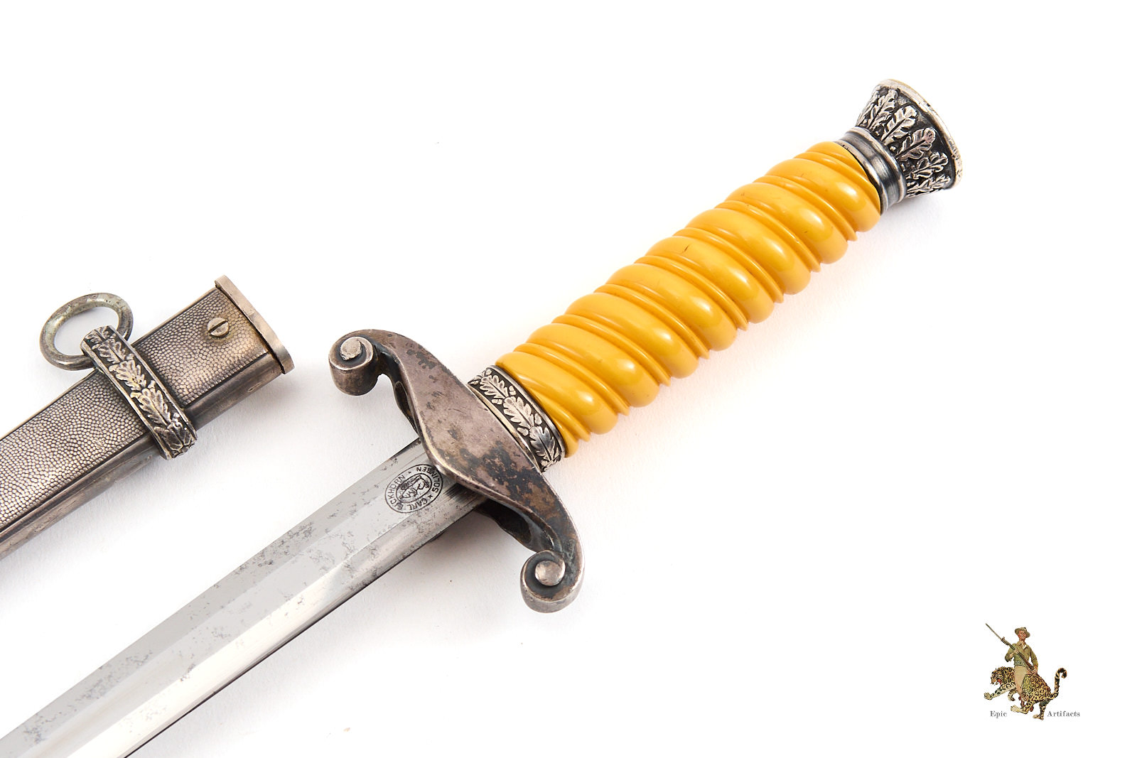 Historical Description: After WWI, the German military, known as the Reichswehr, was restricted to a relatively small force. Hitler changed this in 1935, reintroducing universal military conscription, and creating a new German Armed Forces- the Wehrmacht. Within the Wehrmacht, the German Army was known as the Heer, and a new dagger was designed and introduced for the officers of this new German Army in May 1935. As with all German Army officer uniforms and accoutrements, they were not issued; rather, the officer had to purchase them. These were ceremonial and decorative pieces of regalia, that were worn on occasions that did not call for carrying a sword. The overall pattern and design of the dagger remained consistent throughout the production run, but the large number of individual manufacturers created a wide variety in detail, especially regarding the handle fittings. There were approximately 42 different manufacturers of the blades. There were construction changes over time as well. Early German Army daggers generally featured plated brass alloy handle fittings. Later, zinc was used. Wartime type scabbards were generally unplated, with a gray finish. Production of German Army daggers ceased around 1943. The German Army was a huge organization, and large numbers of these daggers were produced. But there were many specific variants that were produced in low numbers, especially the highest quality, luxury type pieces for well-heeled officers. Some daggers were personalized, and customized, and are unique. The striking and attractive design of the German Army dagger was well-received by officers at the time, and these are very sought-after by collectors today.