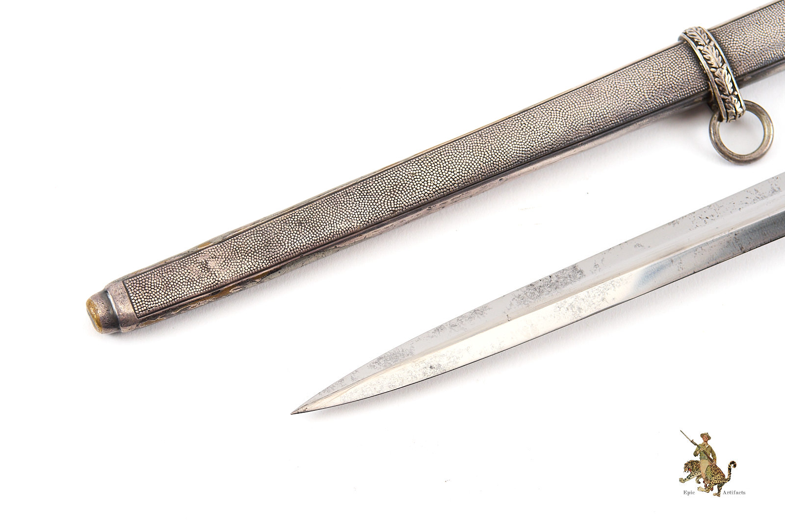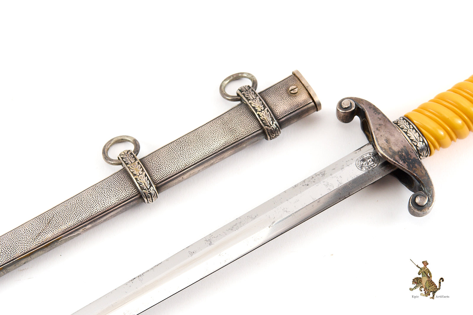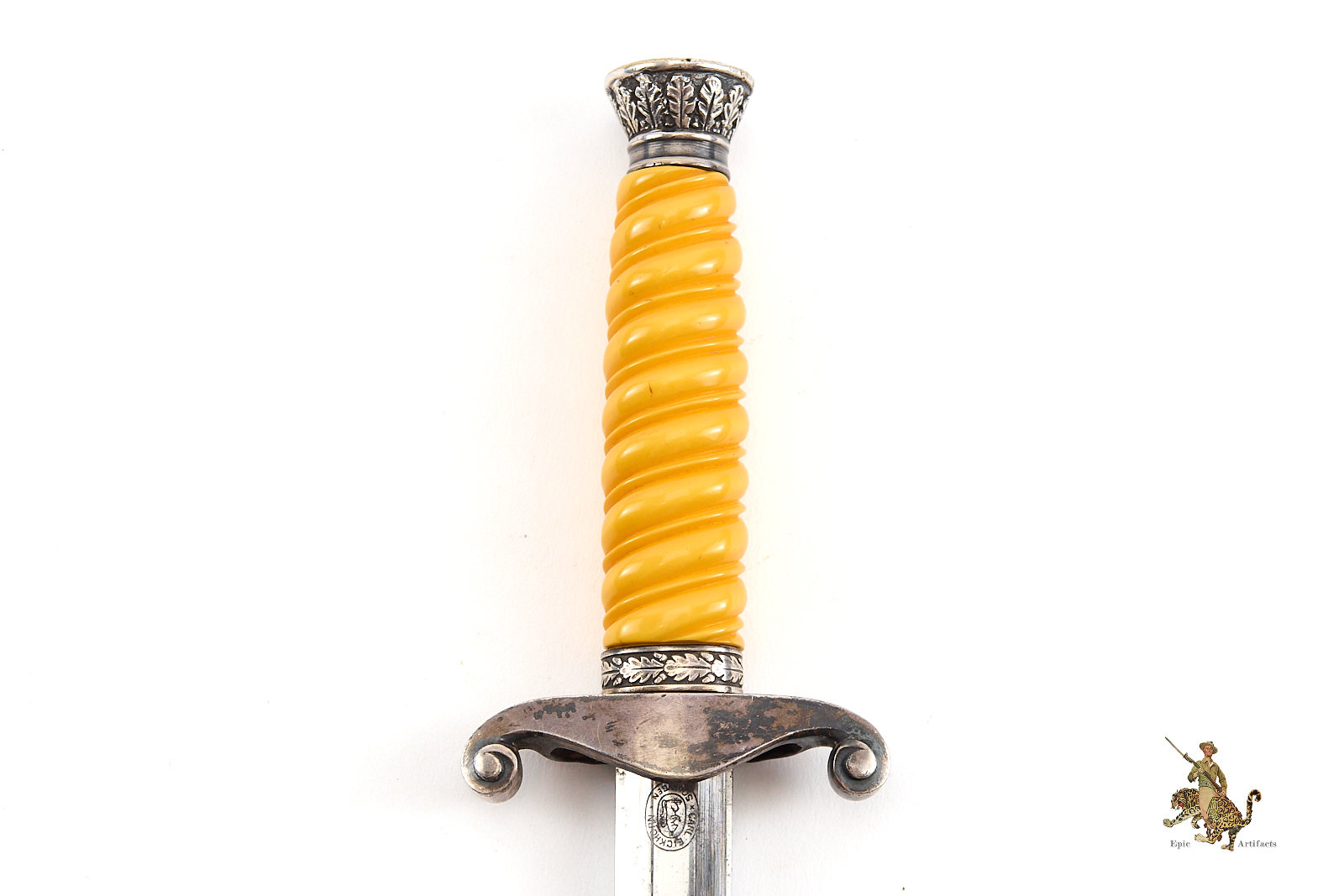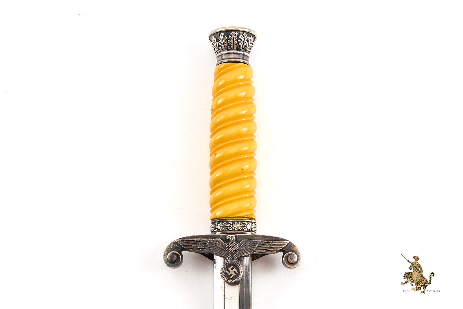 Historical Description: After WWI, the German military, known as the Reichswehr, was restricted to a relatively small force. Hitler changed this in 1935, reintroducing universal military conscription, and creating a new German Armed Forces- the Wehrmacht. Within the Wehrmacht, the German Army was known as the Heer, and a new dagger was designed and introduced for the officers of this new German Army in May 1935. As with all German Army officer uniforms and accoutrements, they were not issued; rather, the officer had to purchase them. These were ceremonial and decorative pieces of regalia, that were worn on occasions that did not call for carrying a sword. The overall pattern and design of the dagger remained consistent throughout the production run, but the large number of individual manufacturers created a wide variety in detail, especially regarding the handle fittings. There were approximately 42 different manufacturers of the blades. There were construction changes over time as well. Early German Army daggers generally featured plated brass alloy handle fittings. Later, zinc was used. Wartime type scabbards were generally unplated, with a gray finish. Production of German Army daggers ceased around 1943. The German Army was a huge organization, and large numbers of these daggers were produced. But there were many specific variants that were produced in low numbers, especially the highest quality, luxury type pieces for well-heeled officers. Some daggers were personalized, and customized, and are unique. The striking and attractive design of the German Army dagger was well-received by officers at the time, and these are very sought-after by collectors today.