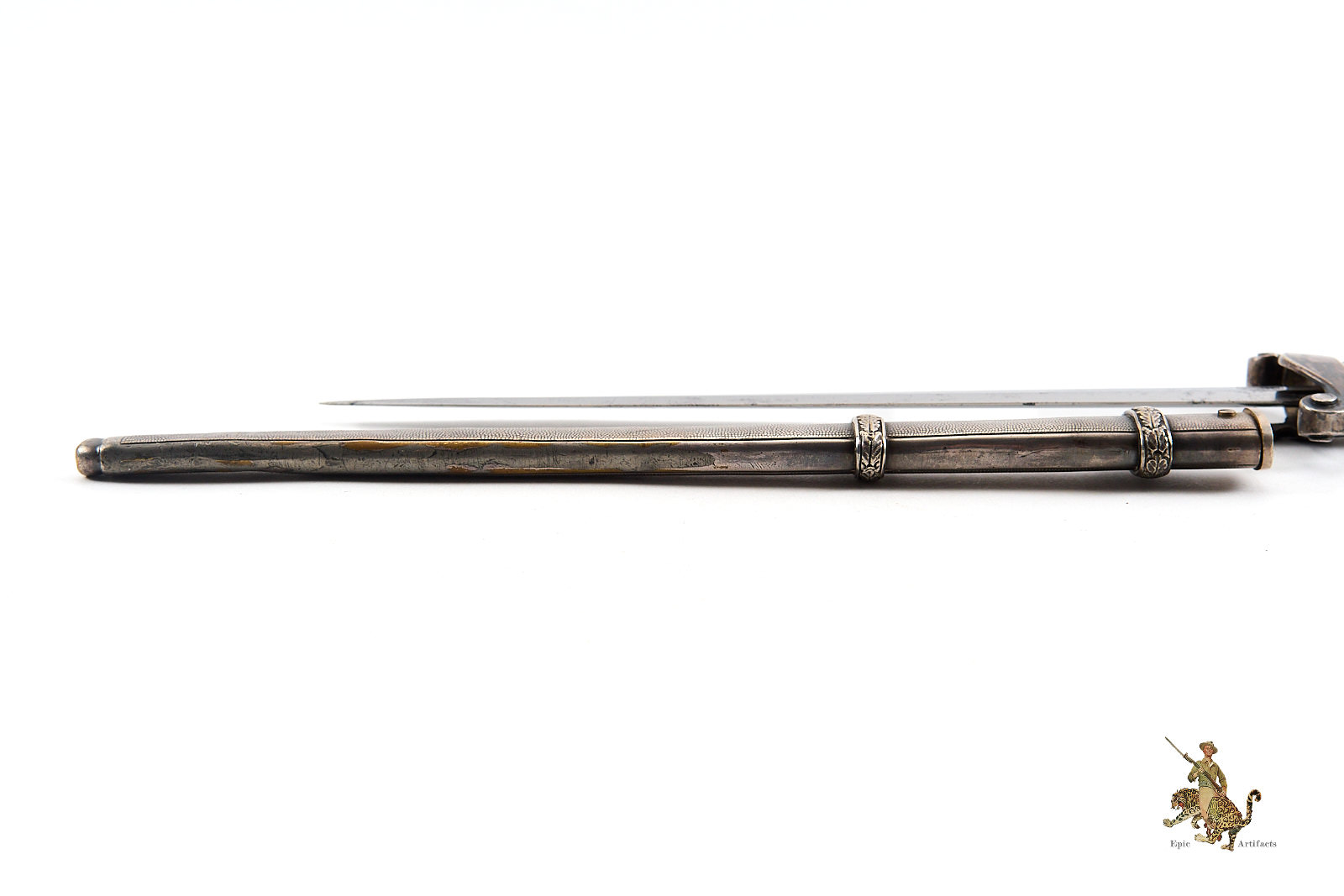 The scabbard is well preserved, showing wear to the high points commensurate with age and an even overall patina that harmonizes attractively with the hilt. The single throat screw remain securely in place, as shown. The lower end of the scabbard shows some denting on both sides, but heavier on the obverse. There is denting to the ball tip as well as silver loss to the tip and along each side of spine revealing the brass tone of the base metal underneath.