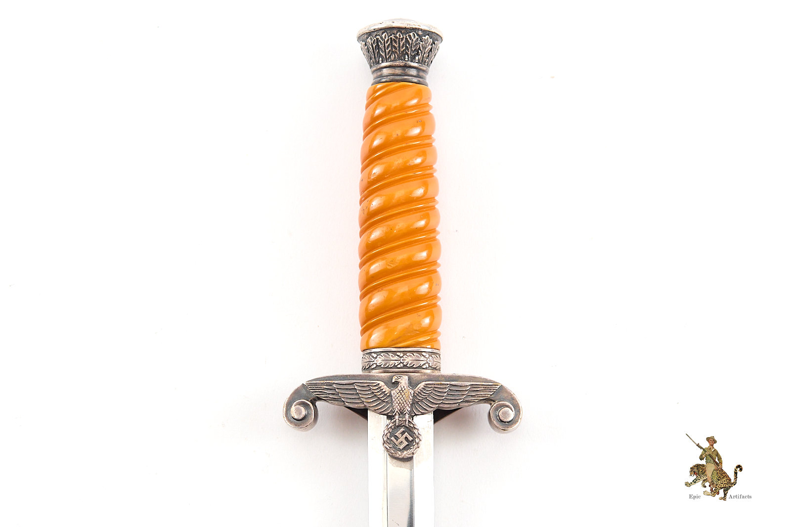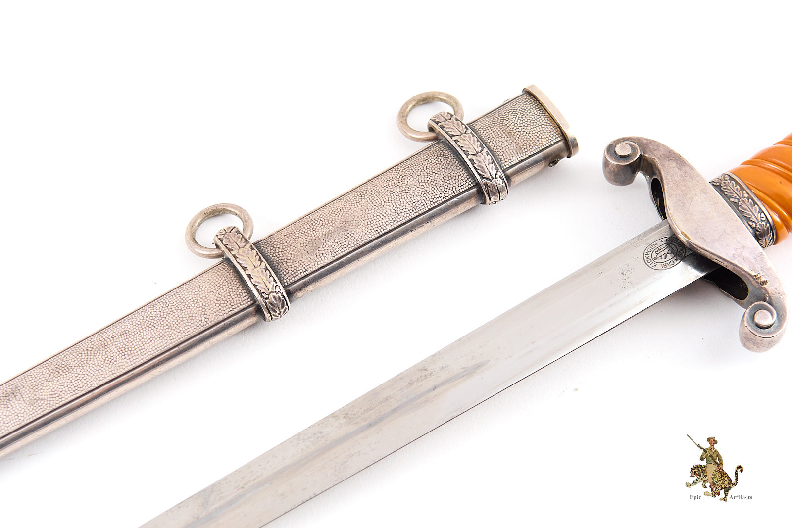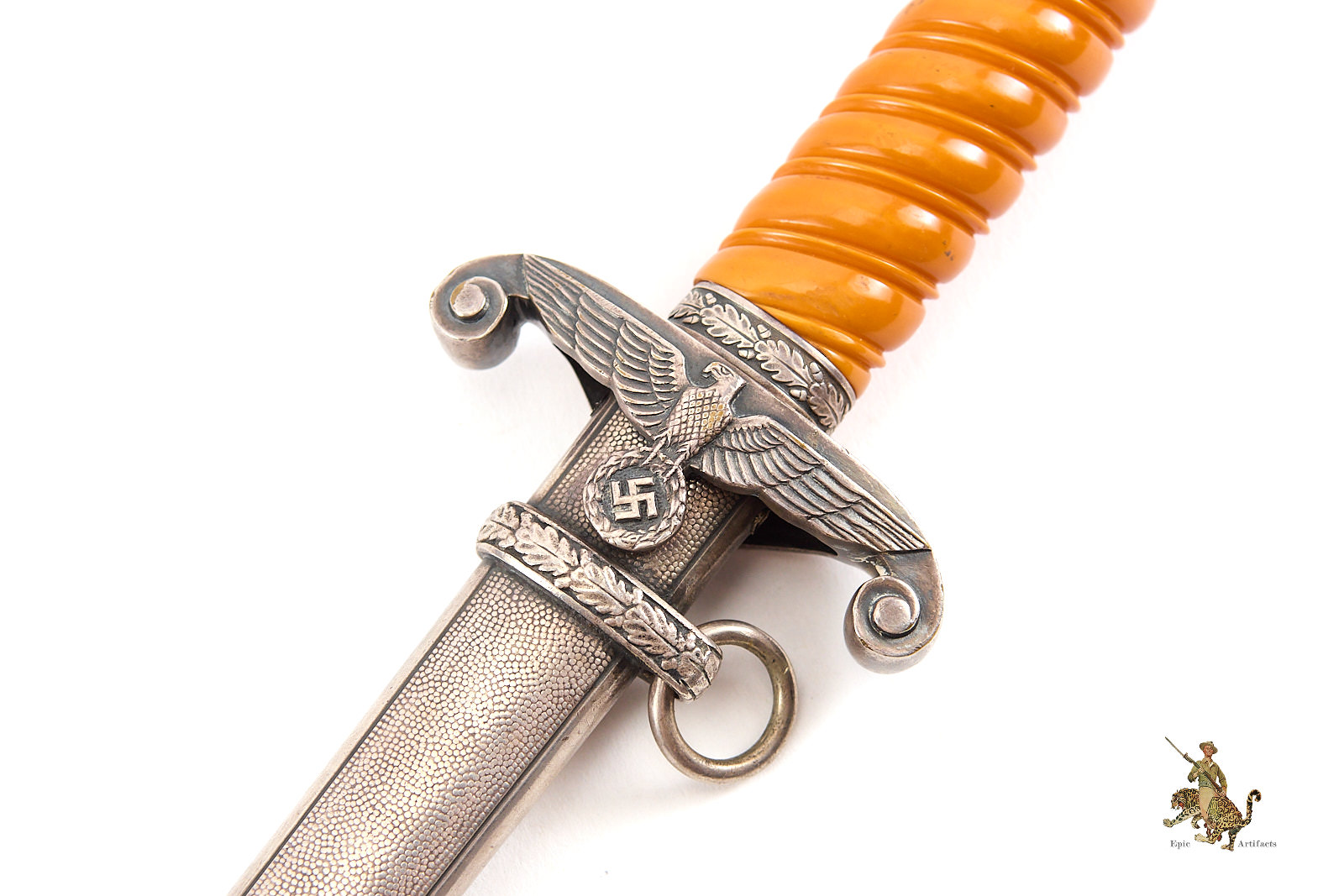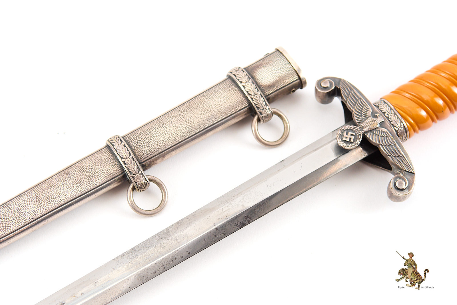 Historical Description: After WWI, the German military, known as the Reichswehr, was restricted to a relatively small force. Hitler changed this in 1935, reintroducing universal military conscription, and creating a new German Armed Forces- the Wehrmacht. Within the Wehrmacht, the German Army was known as the Heer, and a new dagger was designed and introduced for the officers of this new German Army in May 1935. As with all German Army officer uniforms and accoutrements, they were not issued; rather, the officer had to purchase them. These were ceremonial and decorative pieces of regalia, that were worn on occasions that did not call for carrying a sword. The overall pattern and design of the dagger remained consistent throughout the production run, but the large number of individual manufacturers created a wide variety in detail, especially regarding the handle fittings. There were approximately 42 different manufacturers of the blades. There were construction changes over time as well. Early German Army daggers generally featured plated brass alloy handle fittings. Later, zinc was used. Wartime type scabbards were generally unplated, with a gray finish. Production of German Army daggers ceased around 1943. The German Army was a huge organization, and large numbers of these daggers were produced. But there were many specific variants that were produced in low numbers, especially the highest quality, luxury type pieces for well-heeled officers. Some daggers were personalized, and customized, and are unique. The striking and attractive design of the German Army dagger was well-received by officers at the time, and these are very sought-after by collectors today.