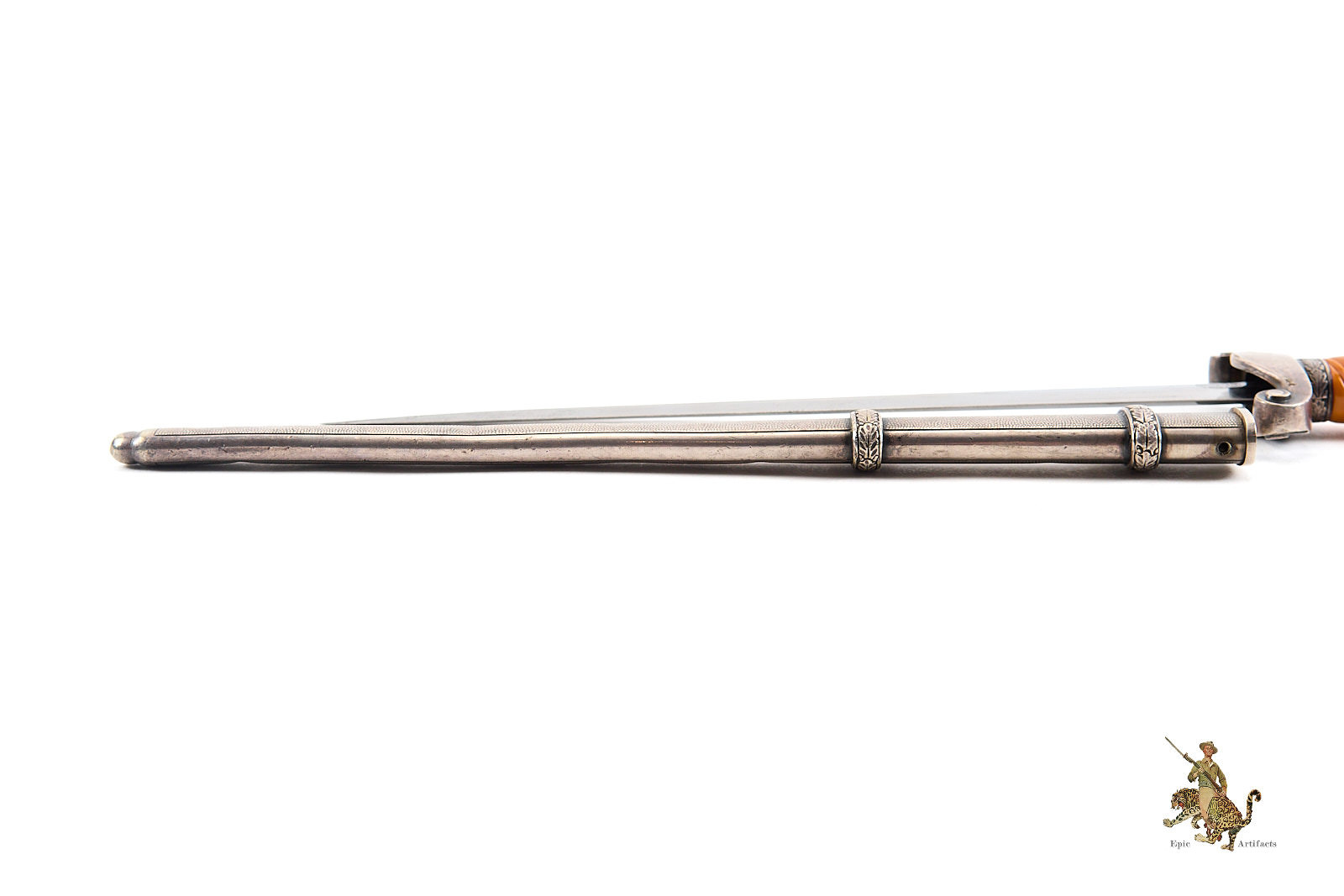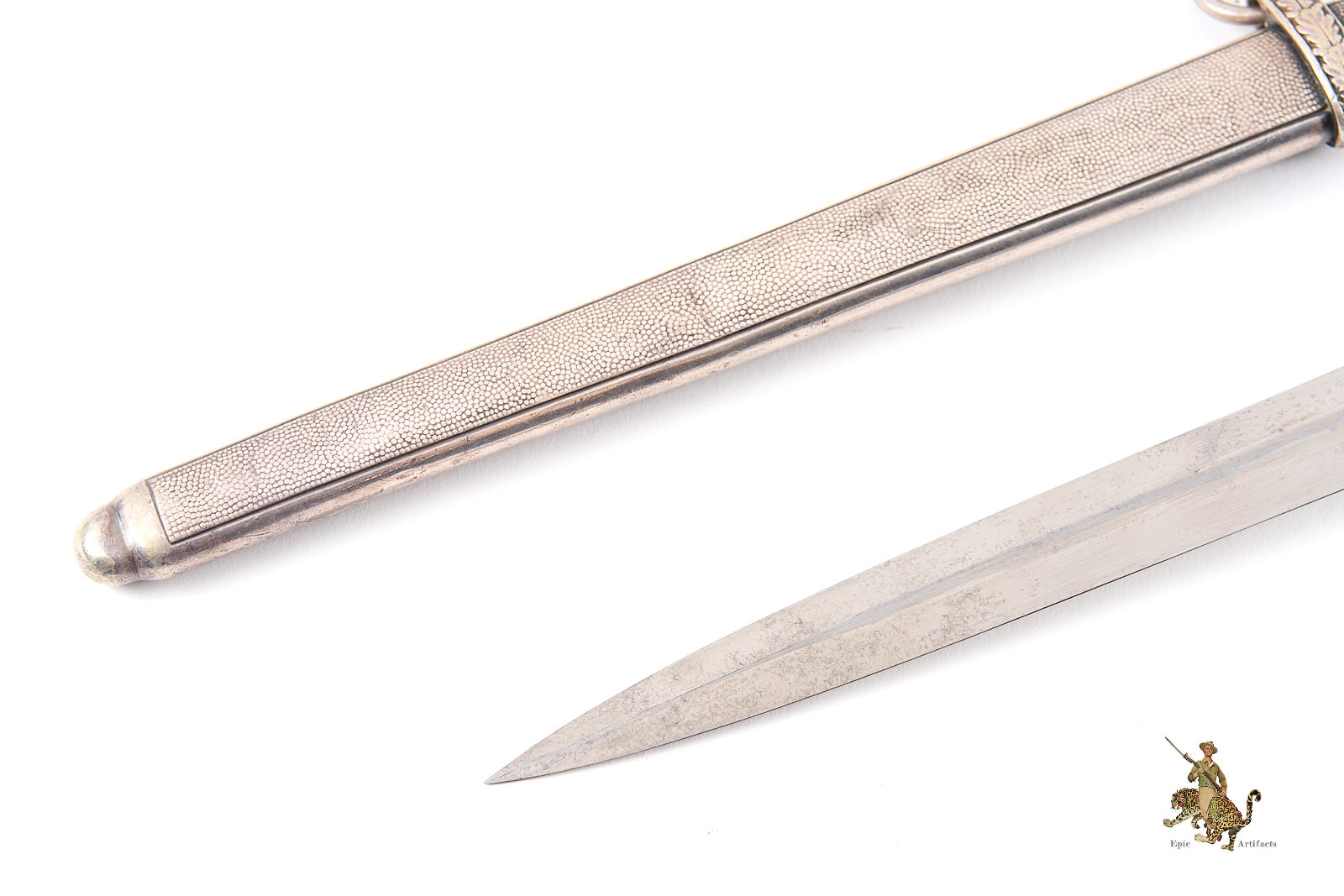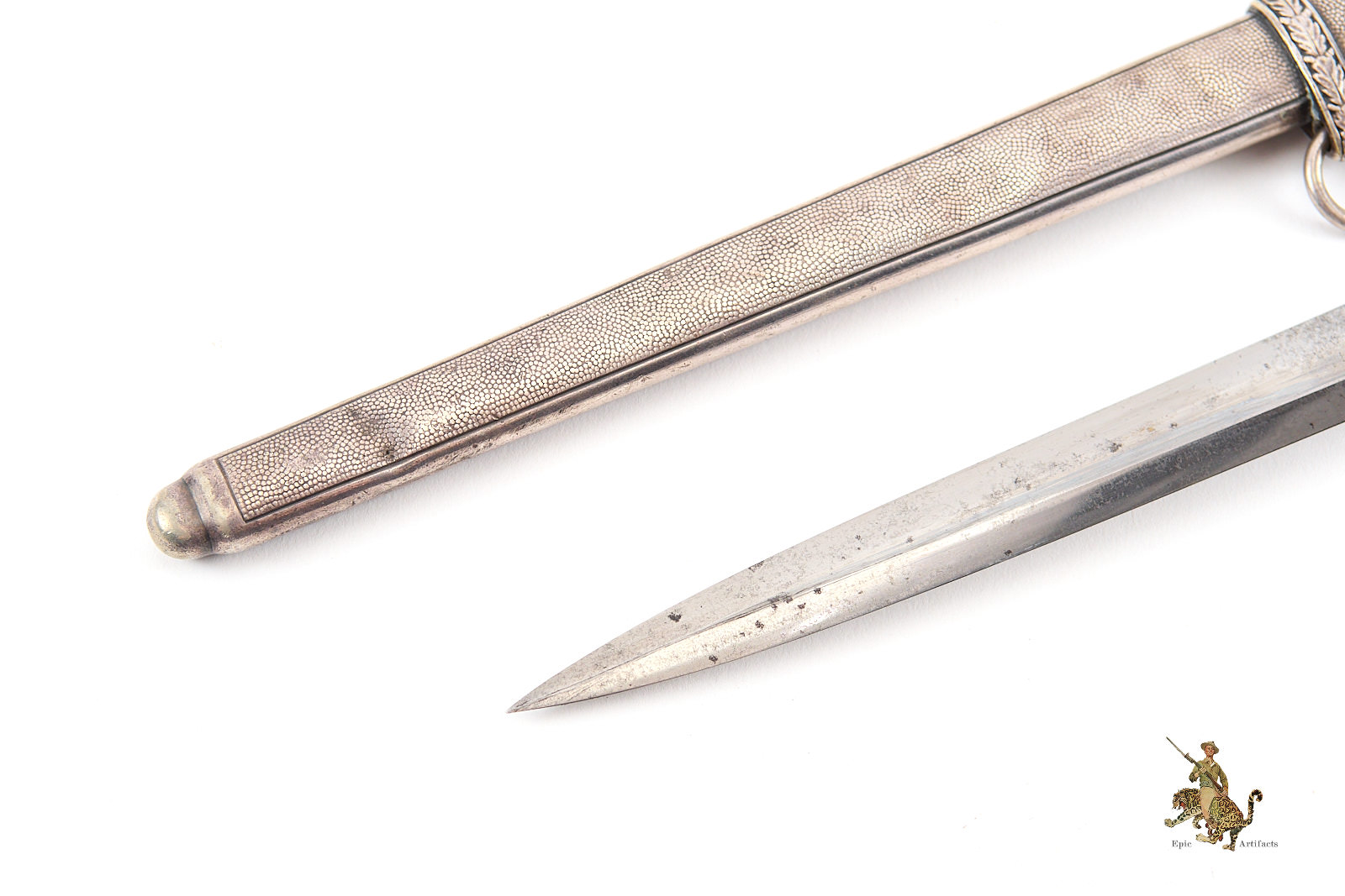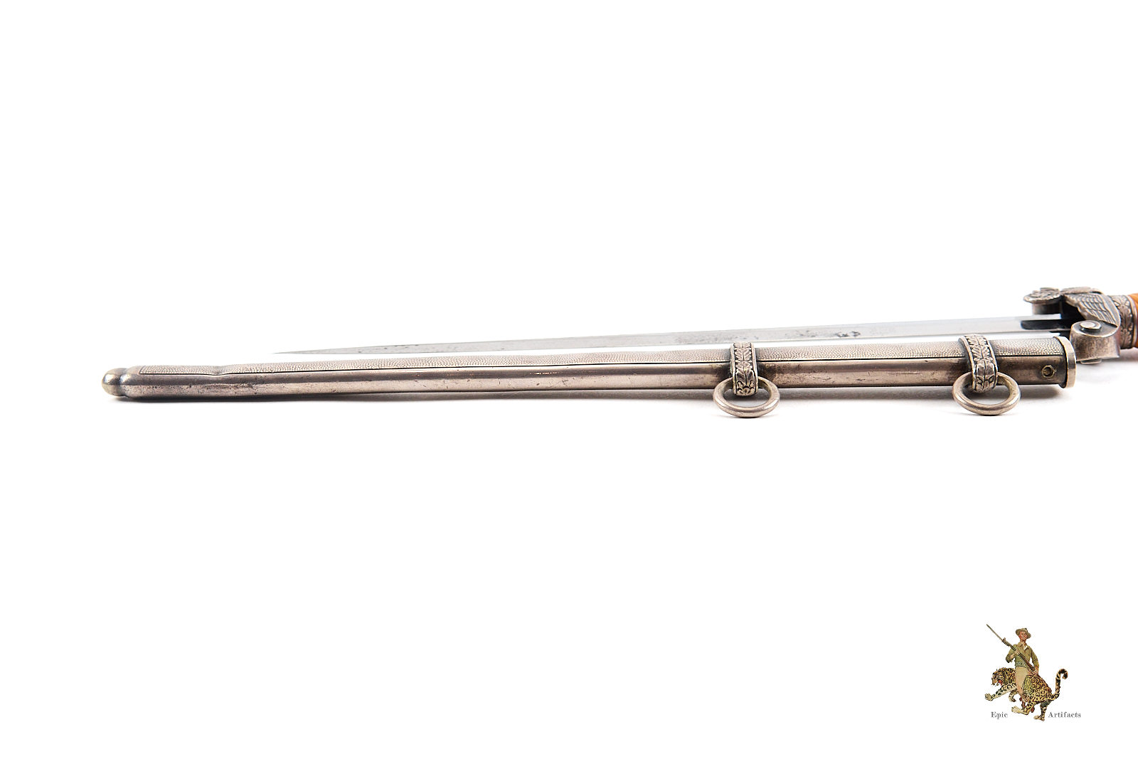 Historical Description: After WWI, the German military, known as the Reichswehr, was restricted to a relatively small force. Hitler changed this in 1935, reintroducing universal military conscription, and creating a new German Armed Forces- the Wehrmacht. Within the Wehrmacht, the German Army was known as the Heer, and a new dagger was designed and introduced for the officers of this new German Army in May 1935. As with all German Army officer uniforms and accoutrements, they were not issued; rather, the officer had to purchase them. These were ceremonial and decorative pieces of regalia, that were worn on occasions that did not call for carrying a sword. The overall pattern and design of the dagger remained consistent throughout the production run, but the large number of individual manufacturers created a wide variety in detail, especially regarding the handle fittings. There were approximately 42 different manufacturers of the blades. There were construction changes over time as well. Early German Army daggers generally featured plated brass alloy handle fittings. Later, zinc was used. Wartime type scabbards were generally unplated, with a gray finish. Production of German Army daggers ceased around 1943. The German Army was a huge organization, and large numbers of these daggers were produced. But there were many specific variants that were produced in low numbers, especially the highest quality, luxury type pieces for well-heeled officers. Some daggers were personalized, and customized, and are unique. The striking and attractive design of the German Army dagger was well-received by officers at the time, and these are very sought-after by collectors today.
