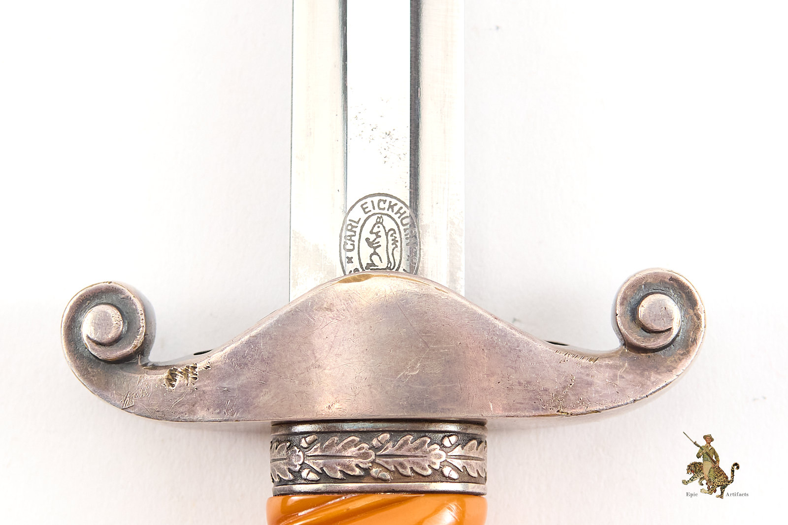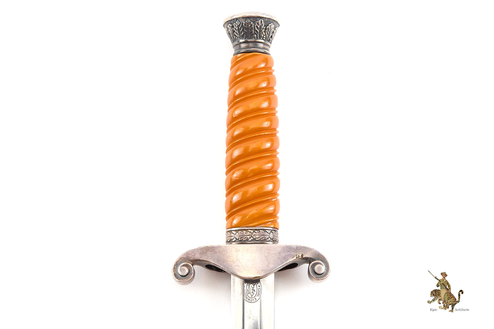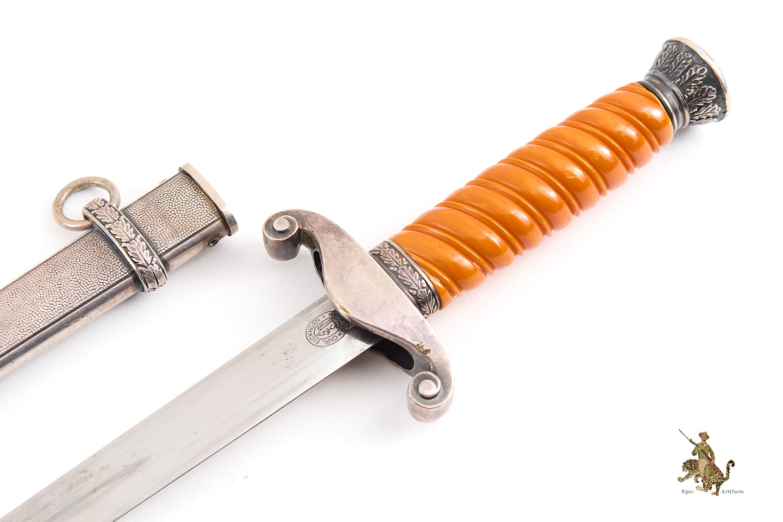 Product Description: A distinguished Heer Army Officer Dagger – Eickhorn, marked Carl Eickhorn, featuring a blade with minor spotting and light corrosion but free of edge nicks and retaining a strong, well-defined tip. The medium pumpkin-toned handle remains intact, with no cracks or breaks, complemented by a guard exhibiting modest wear and a few light dings consistent with period use. The pommel shows wear to high points, along with expected marks reflecting service history.