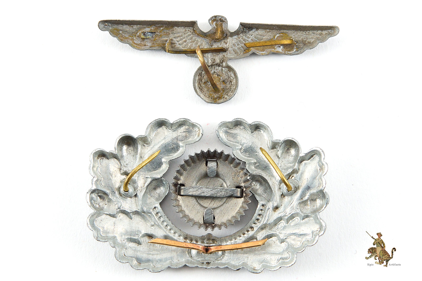 Product Description: A finely preserved and aesthetically cohesive Heer Army Visor Eagle Wreath and Cockade Set, comprising the national eagle, oakleaf wreath, and cockade for an Army visor cap. The three components display an attractive, matching patina, suggesting long association and careful preservation.