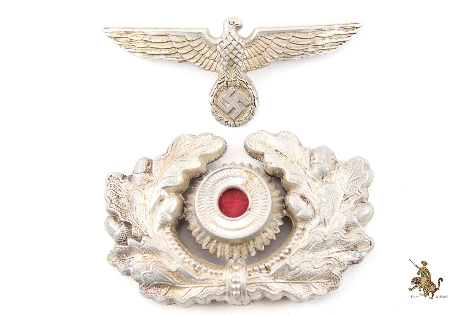 Product Description: A finely preserved and aesthetically cohesive Heer Army Visor Eagle Wreath and Cockade Set, comprising the national eagle, oakleaf wreath, and cockade for an Army visor cap. The three components display an attractive, matching patina, suggesting long association and careful preservation.