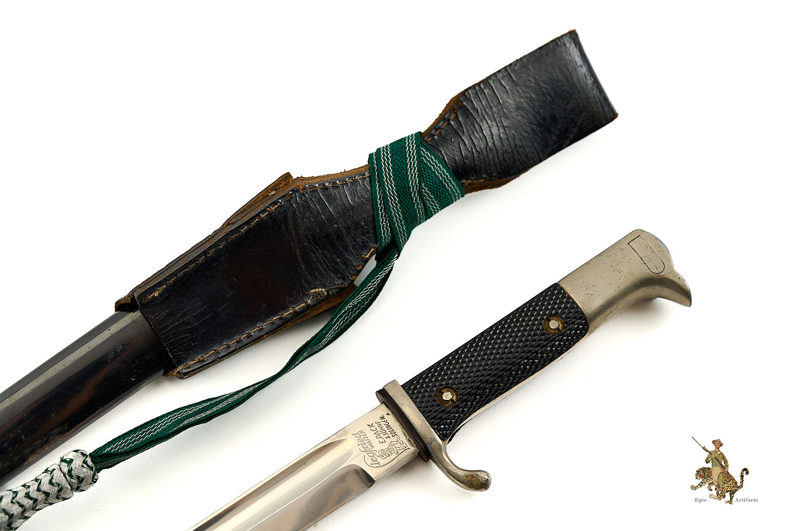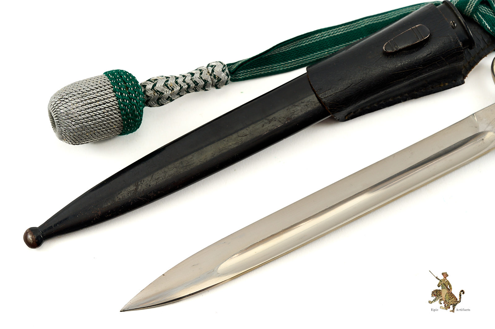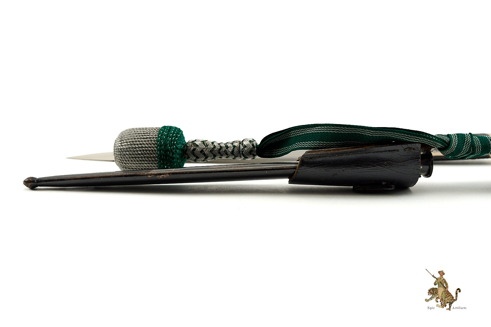 Product Description: This Heer Bayonet with NCO Portepee – EP&S presents a well-preserved example of an E. Pack & Söhne Solingen marked dress bayonet. Pommel and guard retains strong finish with wear and minor scuffing mostly to edges and high points. The blade displays good overall finish, showing expected runner marks and wear expected from age. The release button is in working order, and the original felt spacer remains. The original leather washer remains intact and in notably fine condition. The scabbard exhibits typical paint loss and handling wear, with the original throat screw still present.