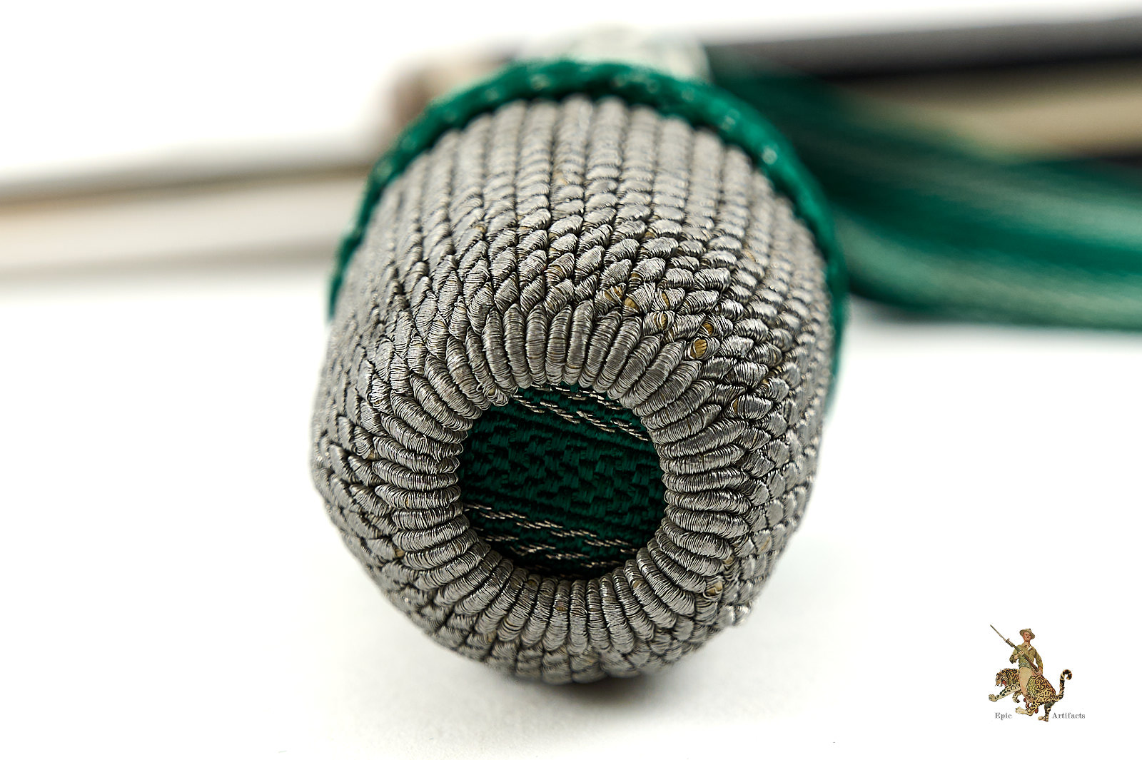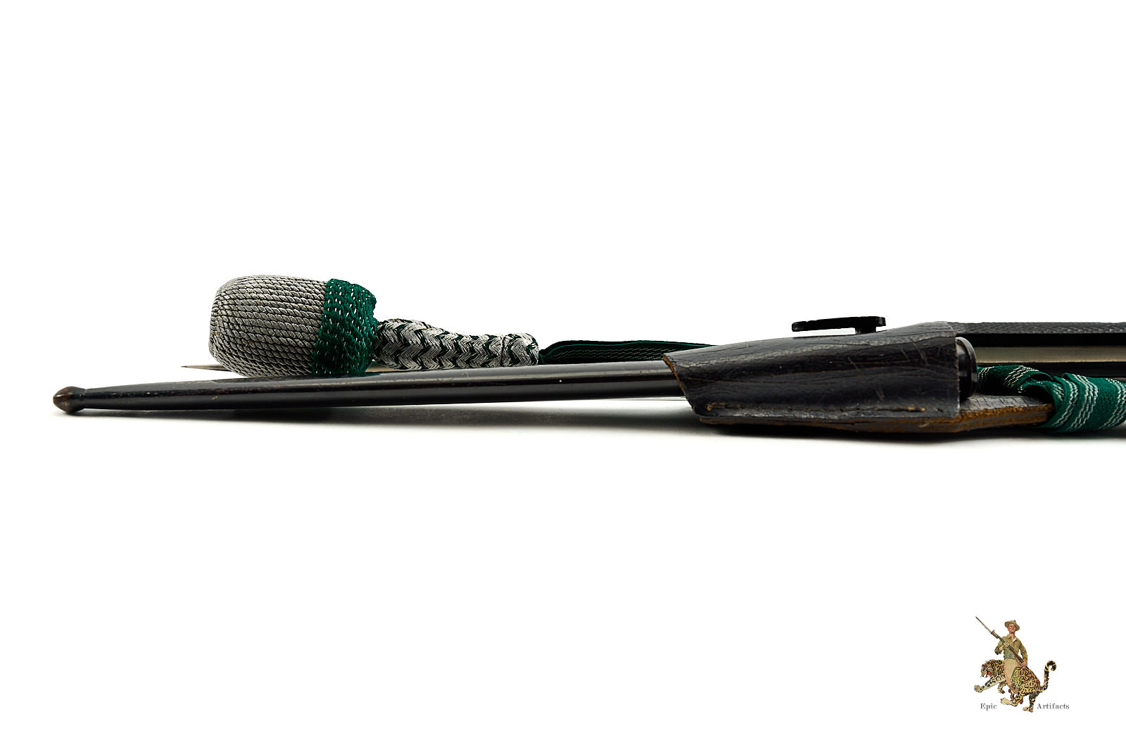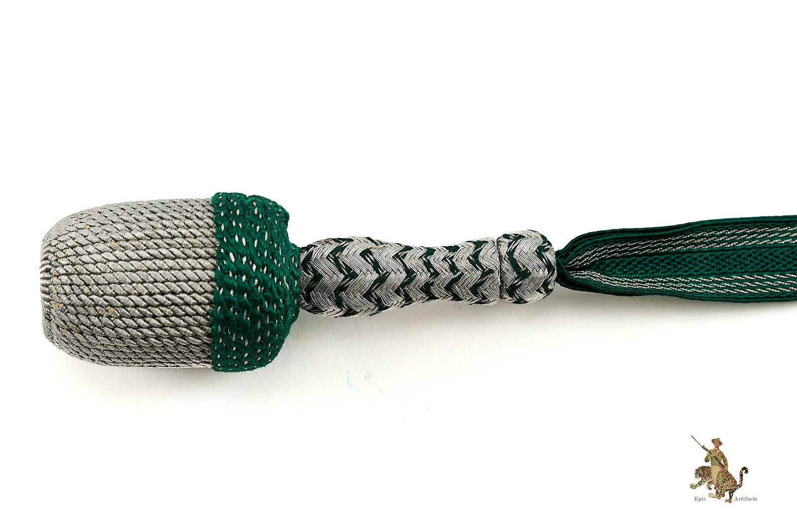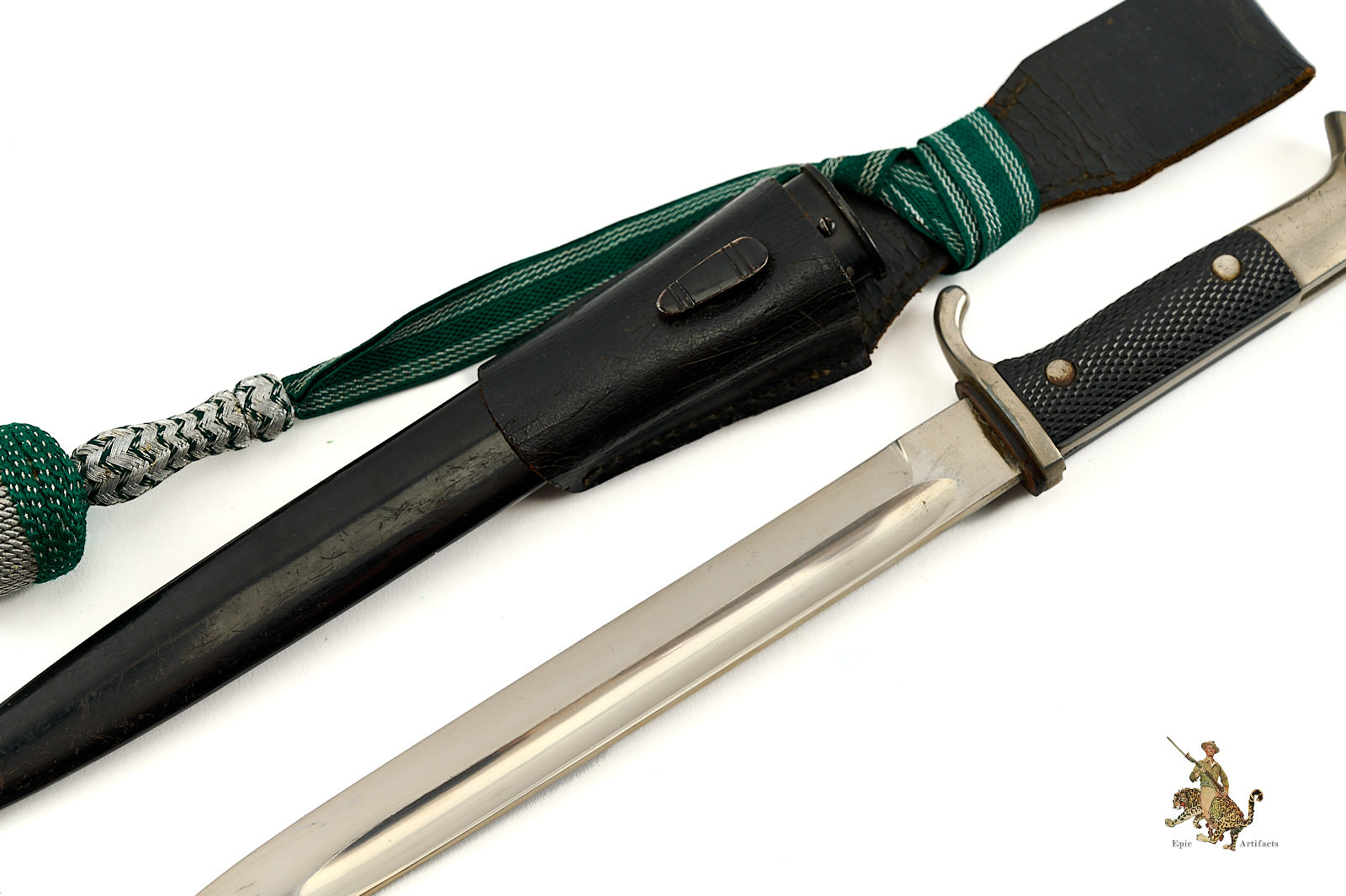 Product Description: This Heer Bayonet with NCO Portepee – EP&S presents a well-preserved example of an E. Pack & Söhne Solingen marked dress bayonet. Pommel and guard retains strong finish with wear and minor scuffing mostly to edges and high points. The blade displays good overall finish, showing expected runner marks and wear expected from age. The release button is in working order, and the original felt spacer remains. The original leather washer remains intact and in notably fine condition. The scabbard exhibits typical paint loss and handling wear, with the original throat screw still present.