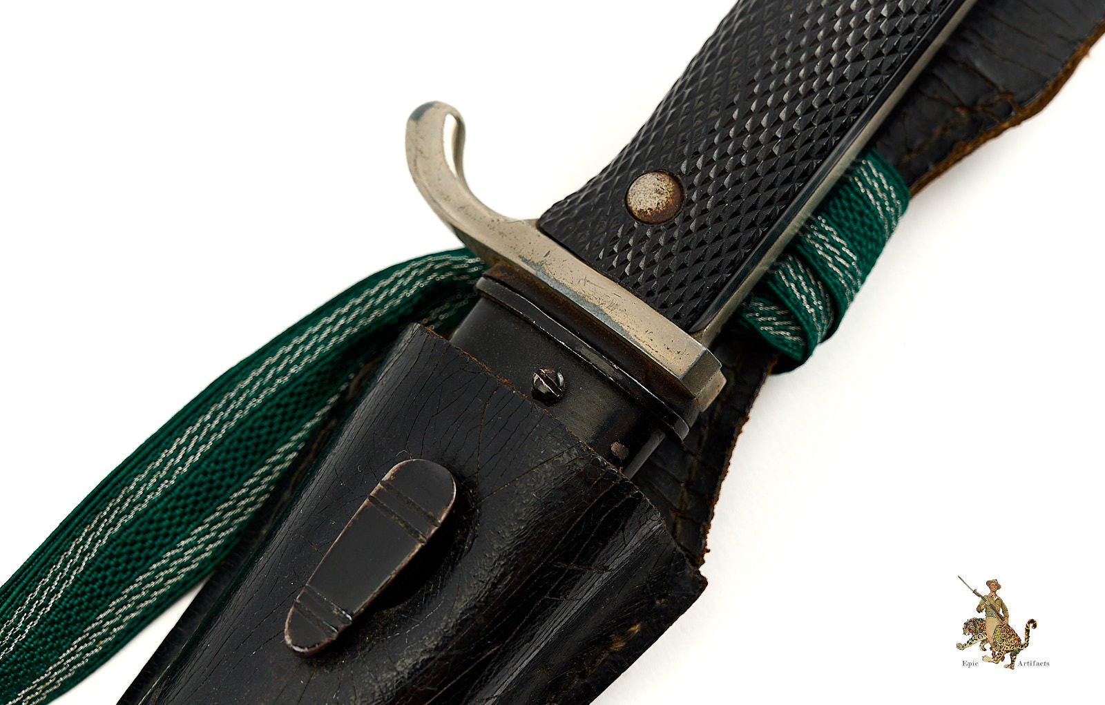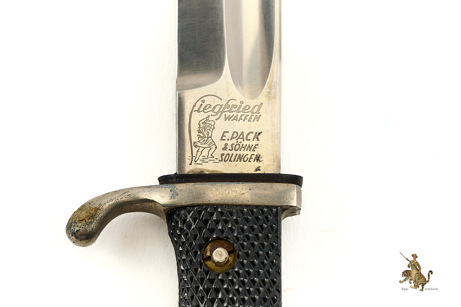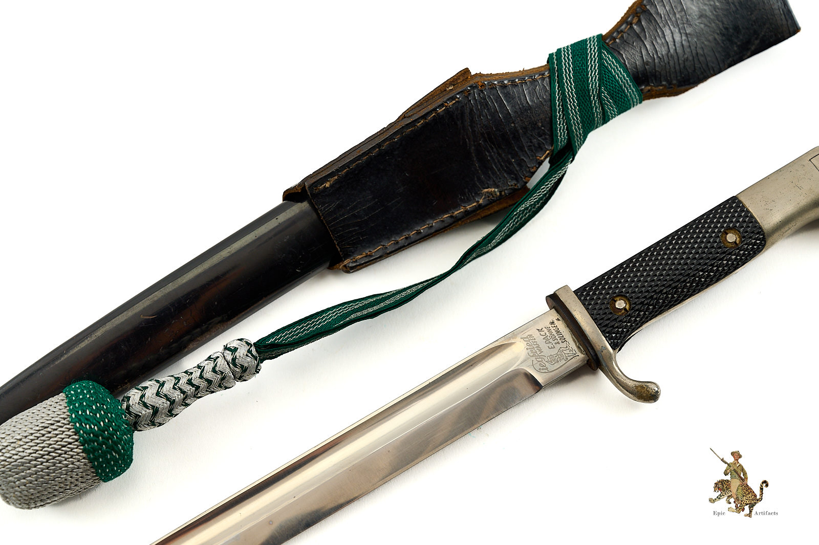 Historical Description: The bayonet was an important part of the combat equipment of the German soldier in both World Wars. The first pattern of German combat bayonet was the Mauser model 1898 which had a long, slender blade. As a result of experiences in combat use in WWI, it was soon decided to shorten the blades on these weapons. This 1898 pattern bayonet was used early in WWI alongside the 1898/05 and the S84/98 bayonets, which were initially shorter, and stronger, than the unmodified 1898 type. Both of these types were made with and without a saw-backed blade. Due to the challenges faced by German industry and the shortages of raw materials, a variety of “Ersatz” (replacement) types were introduced during WWI. After the war, the S84/98 bayonet became standard issue in the Reichswehr and later, in the Wehrmacht, for troops armed with the K98 rifle (the standard WWII German infantry weapon). The bayonets made for issue with the K98 rifle initially had wooden grips. Later, some bayonets were made with Bakelite grips. The bayonets were worn on the belt by means of a leather frog, of which there were a number of prewar and wartime variations including a short bayonet frog for use with the folding shovel, and a webbing frog for tropical use. In 1942, a new model of bayonet was introduced, knows as the SG42. This was a very modernized bayonet, with a comfortable Bakelite grip, and a relatively short blade that made it ideal for use either as a bayonet or a fighting knife. Within the grip was a removable multi-tool insert with a folding knife/bottle opener, awl and screwdriver. Although the SG42 was proposed as a replacement for the S84/98, few were manufactured. German combat bayonets were made in countless variations and all are very collectible today, with some rare variants being very avidly sought-after.