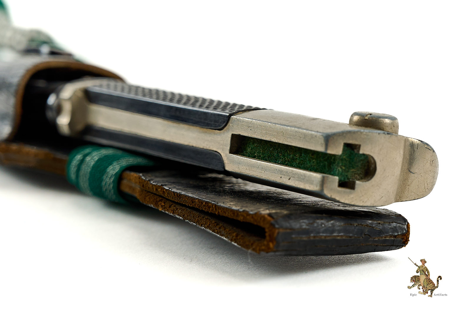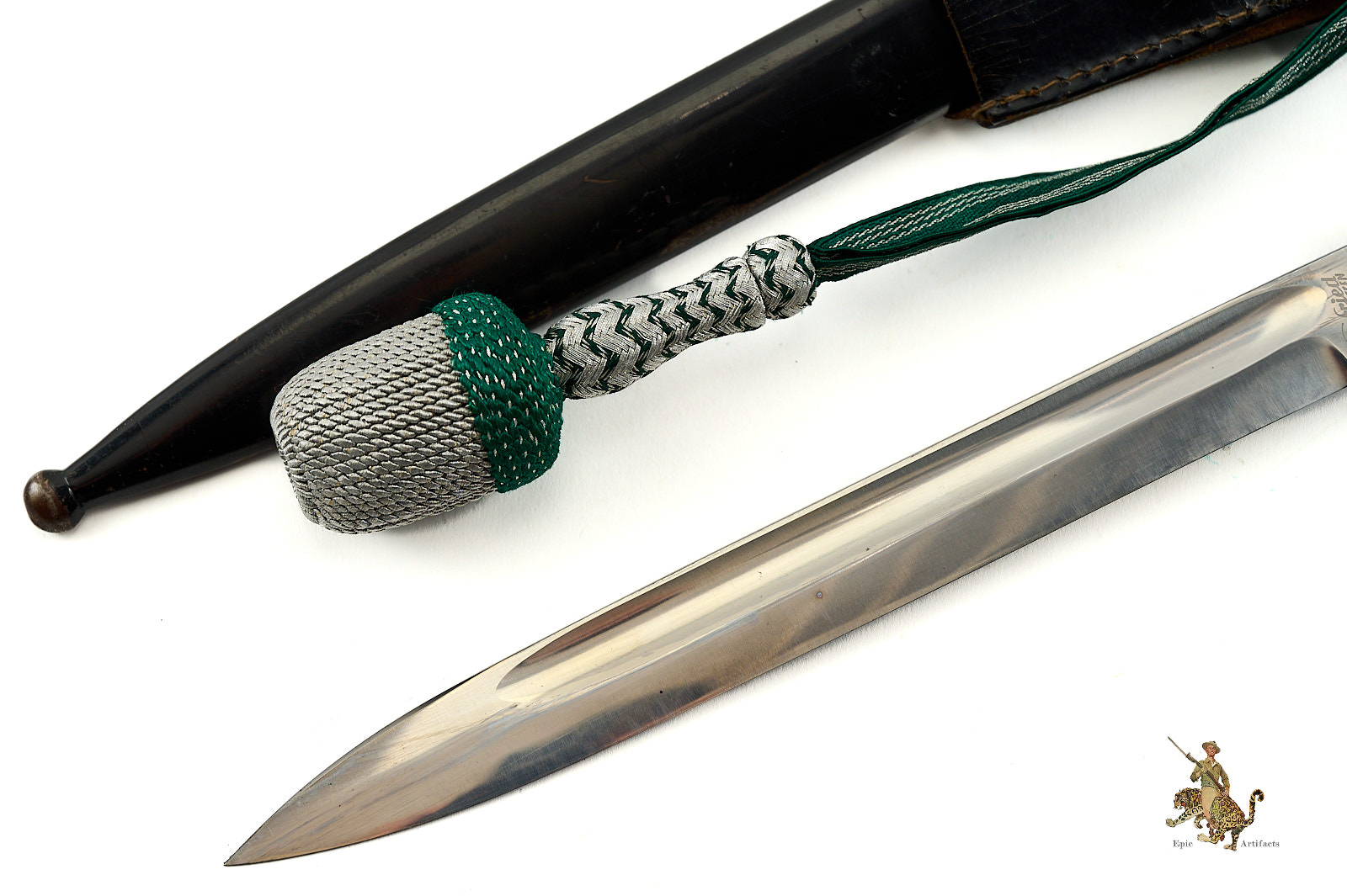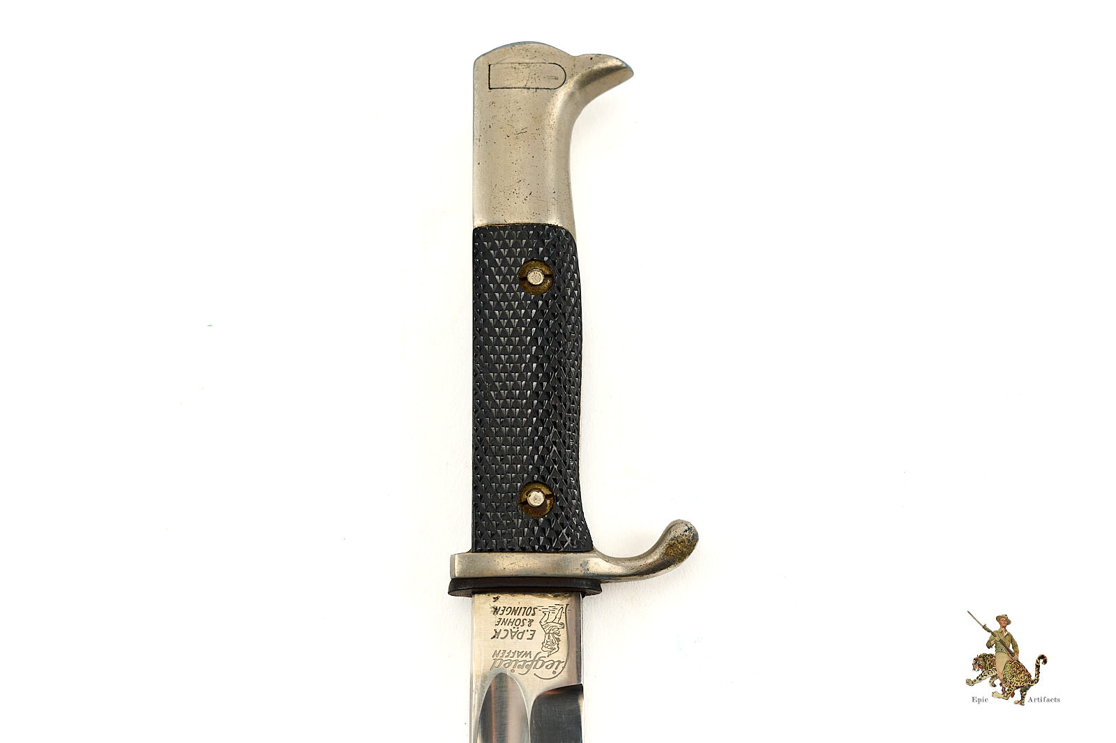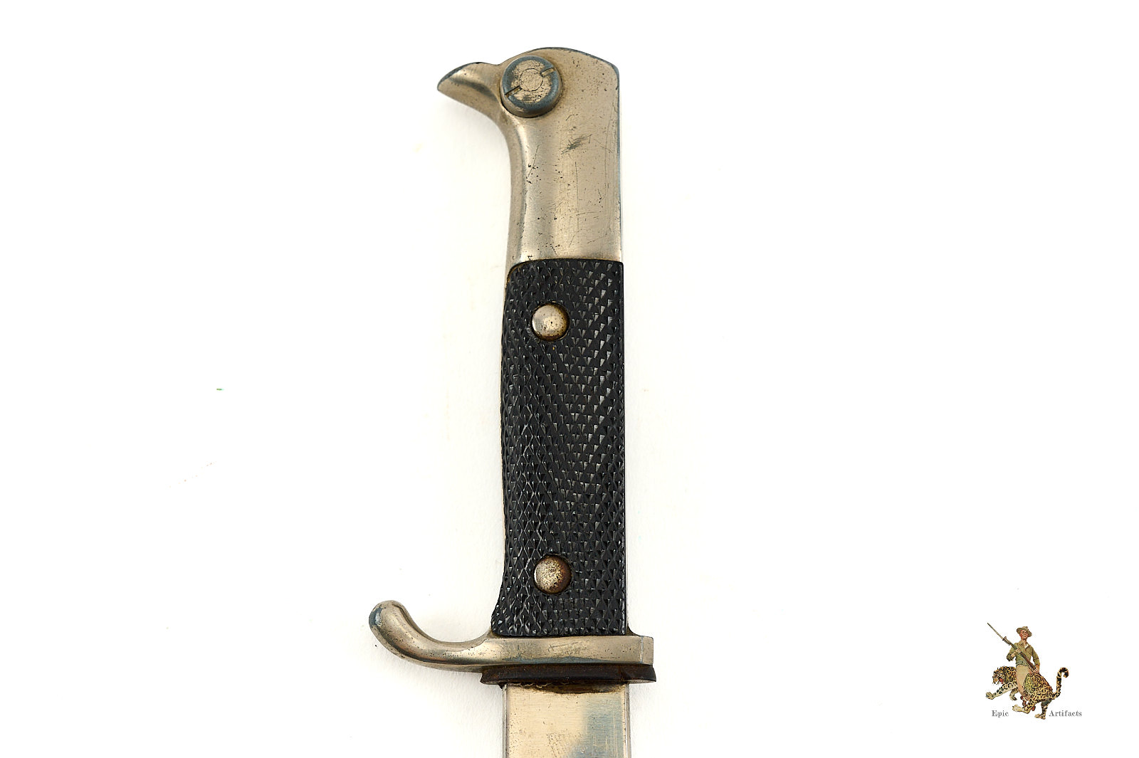 Historical Description: The bayonet was an important part of the combat equipment of the German soldier in both World Wars. The first pattern of German combat bayonet was the Mauser model 1898 which had a long, slender blade. As a result of experiences in combat use in WWI, it was soon decided to shorten the blades on these weapons. This 1898 pattern bayonet was used early in WWI alongside the 1898/05 and the S84/98 bayonets, which were initially shorter, and stronger, than the unmodified 1898 type. Both of these types were made with and without a saw-backed blade. Due to the challenges faced by German industry and the shortages of raw materials, a variety of “Ersatz” (replacement) types were introduced during WWI. After the war, the S84/98 bayonet became standard issue in the Reichswehr and later, in the Wehrmacht, for troops armed with the K98 rifle (the standard WWII German infantry weapon). The bayonets made for issue with the K98 rifle initially had wooden grips. Later, some bayonets were made with Bakelite grips. The bayonets were worn on the belt by means of a leather frog, of which there were a number of prewar and wartime variations including a short bayonet frog for use with the folding shovel, and a webbing frog for tropical use. In 1942, a new model of bayonet was introduced, knows as the SG42. This was a very modernized bayonet, with a comfortable Bakelite grip, and a relatively short blade that made it ideal for use either as a bayonet or a fighting knife. Within the grip was a removable multi-tool insert with a folding knife/bottle opener, awl and screwdriver. Although the SG42 was proposed as a replacement for the S84/98, few were manufactured. German combat bayonets were made in countless variations and all are very collectible today, with some rare variants being very avidly sought-after.