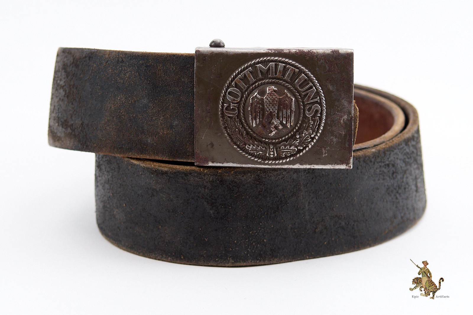 Product Description: A particularly appealing and well-preserved Heer Belt and Buckle – RODO, exhibiting the sort of honest age, originality, and completeness highly sought after by dedicated collectors of wartime German militaria. The steel buckle presents with approximately 60% of its original field-grey paint on the obverse, the remaining finish showing gentle softening and expected losses along the edges and prominent relief points, subtle evidence of authentic period use that enhances rather than detracts from its character. The reverse is crisply marked RODO and retains an impressive amount of its factory-applied paint, a detail not often encountered on surviving examples.