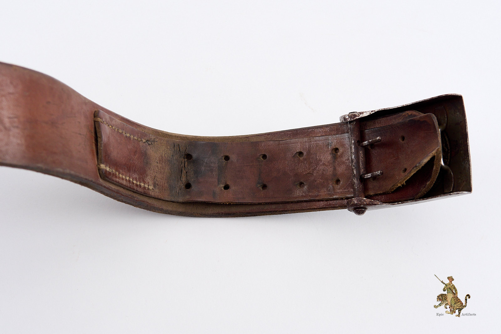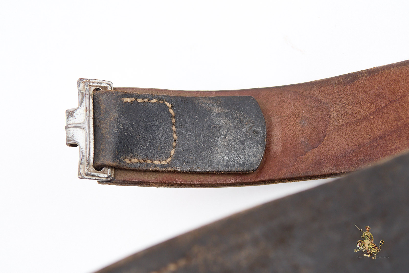 The accompanying leather belt, marked for size 98 and measuring a full 38 inches along its length, remains supple with an attractive patina developed over decades. The maker’s marking at the opposite end, now partially faded with time, appears to read cng6/42, aligning it with desirable early-war production. Together, the components form a highly collectible, untouched set that reflects both quality craftsmanship and the unmistakable aura of genuine service use, an excellent addition for the discerning collector seeking authenticity and visual presence.