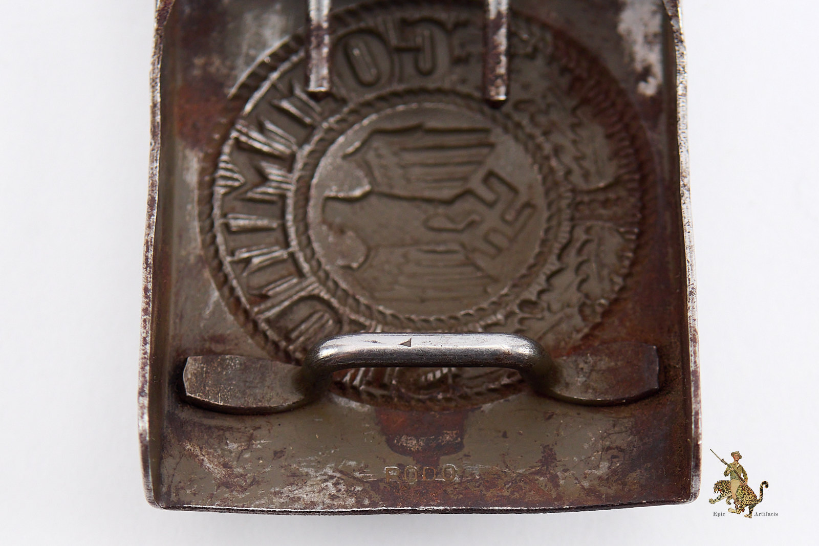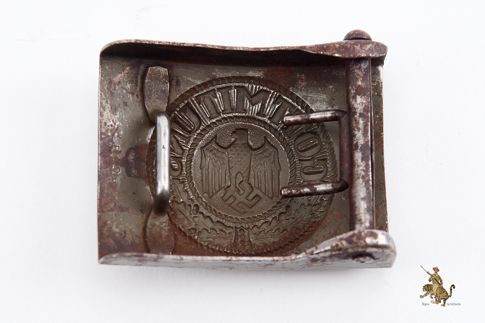 Historical Description: The belt buckle was an important part of the regalia worn by all uniformed military, civil, political, and paramilitary organizations during the Third Reich. The belt (“Koppel”) was part of the uniform and would always be worn while on duty. The belt buckle (“Koppelschloss”) was generally specific to each organization, with many organizations having separate belt buckles for officers and for enlisted personnel, sometimes with different colors and finishes to further denote specific purposes. The buckles were adorned with various mottos and designs specific to the organizations for which they were intended. Many designs used the German national eagle emblem, in a variety of forms. Belt buckles were worn with uniforms ranging from finely tailored officer parade uniforms, to the issue uniforms of enlisted soldiers in combat. Generally speaking, most German belt buckles of the Third Reich were made with two prongs on the reverse, to allow the buckle to be worn and adjusted on a belt. The buckle had a catch that would mate with a hook on the belt, when worn. The earliest Third Reich buckles were often made of brass, or nickel silver. Later, aluminum became very common, and was used on private purchase as well as enlisted buckles of the German military, with or without a painted or plated finish. After WWII began, most enlisted military buckles were steel. Nazi belt buckles were popular souvenirs for Allied troops who served in Europe. Some types were made by the millions and remain quite common today. Others were made in limited numbers and are very rare.