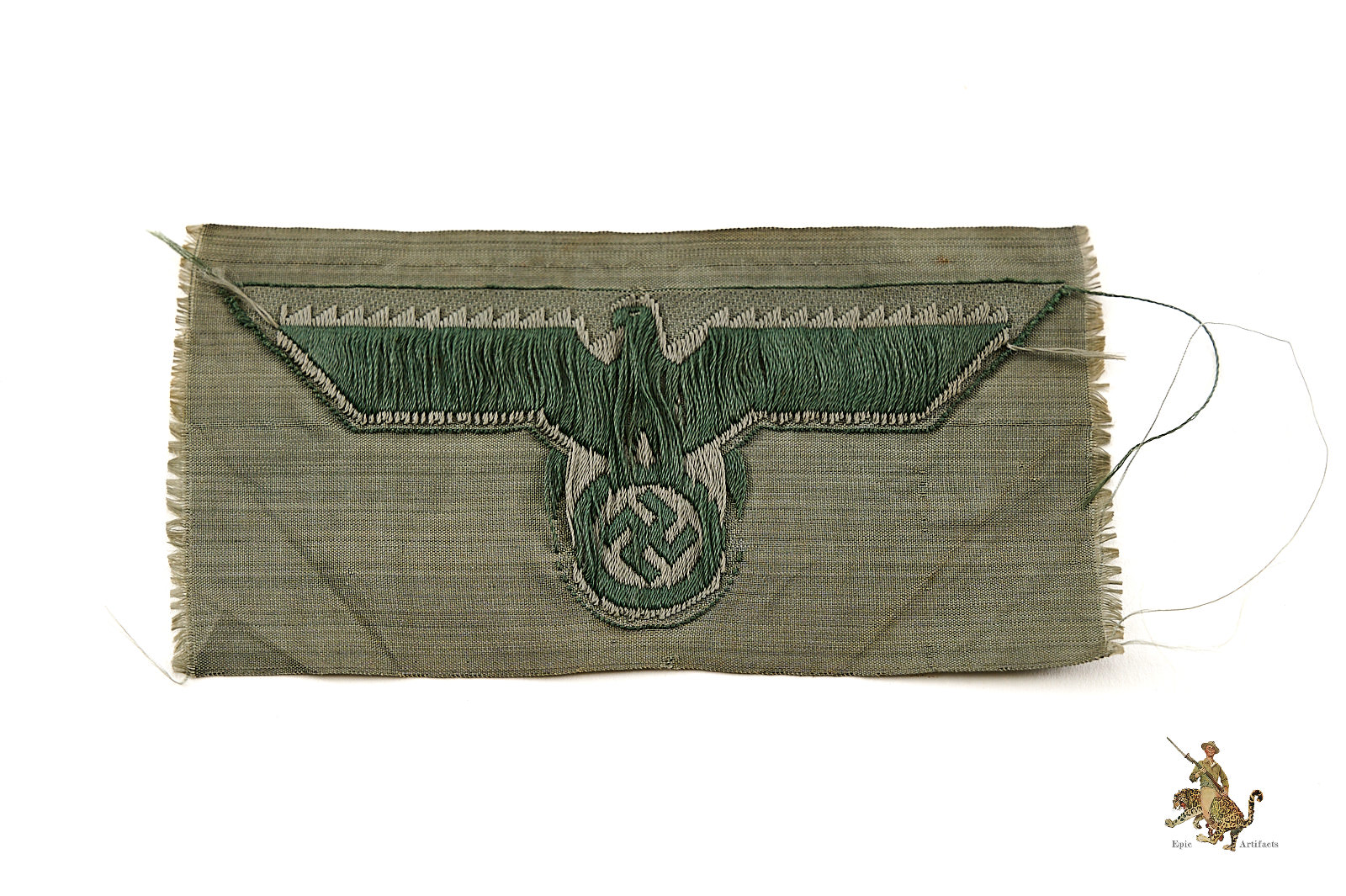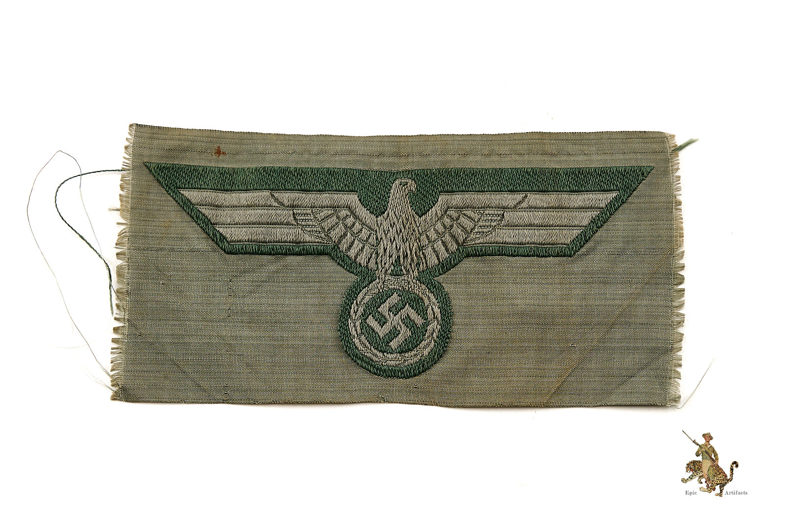 Historical Description: The German Armed Forces (Wehrmacht), as formed in 1935, and as they existed until the end of World War 2, consisted of the Army (Heer), the Air Force (Luftwaffe) and the Navy (Kriegsmarine). The Waffen-SS fell under the command of the Wehrmacht during the war. Each of these branches of service had a unique eagle design that was worn on both the formal dress and parade uniforms, and the field uniforms, of the members of that branch. These eagles were worn on soft headgear, including service and field caps, as well as on the uniform jacket. In the Heer, the Luftwaffe, and the Kriegsmarine, this eagle was worn on the chest of the tunic; collectors have termed these “breast eagles.” The Heer and the Luftwaffe generally used the same eagle style, though variations in color of the eagle or the backing distinguish between the two. The Luftwaffe used their own flying eagle emblem. The Waffen-SS sleeve eagle (and cap eagle) had wings that came to a distinctive tapered point. The cap, breast and sleeve eagles used by the various military branches were manufactured in many variations. There were machine-woven and machine embroidered versions, usually used by officers and NCOs. Hand-embroidered bullion wire eagles were typically for officers. There were metal eagles, for caps, or for uniforms that were intended to have detachable insignia. There were even eagles embroidered on camouflage fabric, intended for use on special field uniforms. There were also eagles in specific colors for use on tropical uniforms. Some of these eagles were mass-produced, and are still common today; others were and are very rare.</