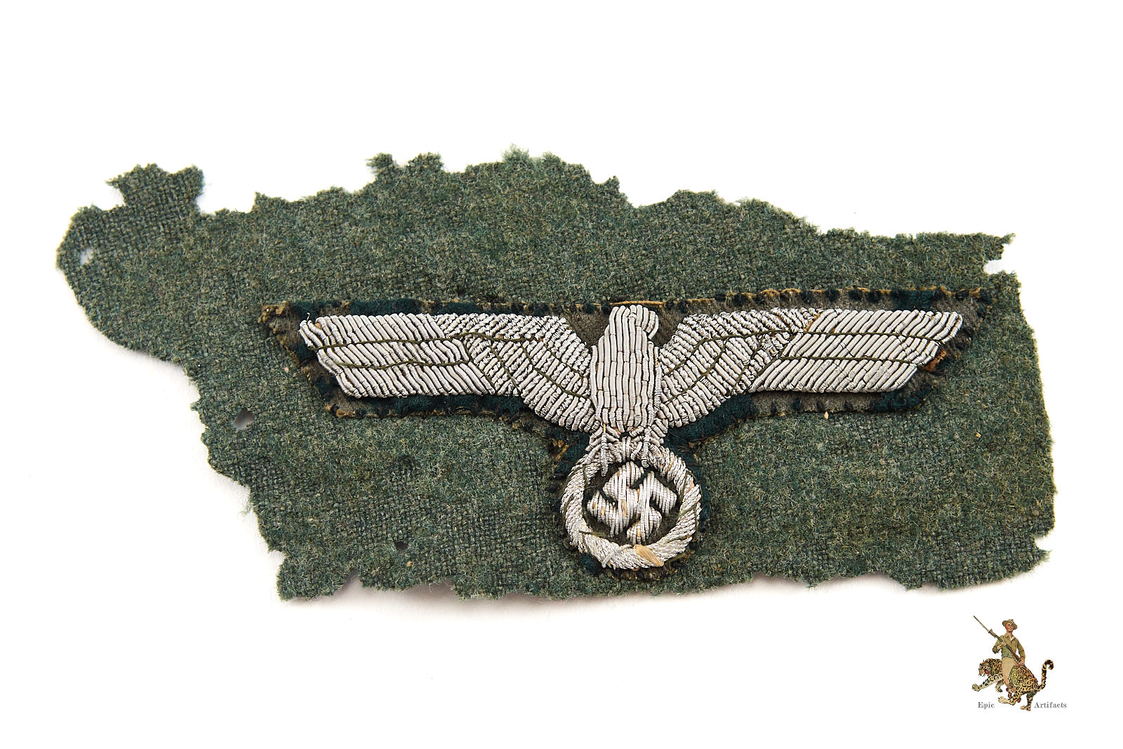 Historical Description: The German Armed Forces (Wehrmacht), as formed in 1935, and as they existed until the end of World War 2, consisted of the Army (Heer), the Air Force (Luftwaffe) and the Navy (Kriegsmarine). The Waffen-SS fell under the command of the Wehrmacht during the war. Each of these branches of service had a unique eagle design that was worn on both the formal dress and parade uniforms, and the field uniforms, of the members of that branch. These eagles were worn on soft headgear, including service and field caps, as well as on the uniform jacket. In the Heer, the Luftwaffe, and the Kriegsmarine, this eagle was worn on the chest of the tunic; collectors have termed these “breast eagles.” The Heer and the Luftwaffe generally used the same eagle style, though variations in color of the eagle or the backing distinguish between the two. The Luftwaffe used their own flying eagle emblem. The Waffen-SS sleeve eagle (and cap eagle) had wings that came to a distinctive tapered point. The cap, breast and sleeve eagles used by the various military branches were manufactured in many variations. There were machine-woven and machine embroidered versions, usually used by officers and NCOs. Hand-embroidered bullion wire eagles were typically for officers. There were metal eagles, for caps, or for uniforms that were intended to have detachable insignia. There were even eagles embroidered on camouflage fabric, intended for use on special field uniforms. There were also eagles in specific colors for use on tropical uniforms. Some of these eagles were mass-produced and are still common today. Others were, and are, very rare.