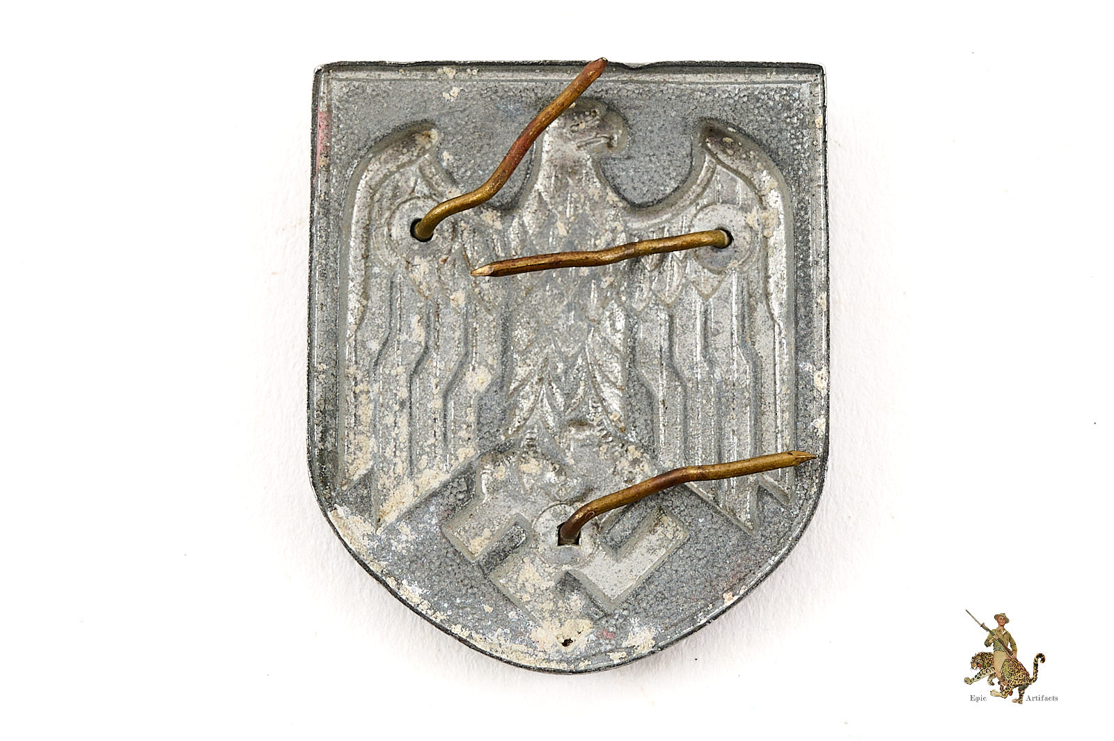 Product Description: Very nice Heer 2nd Pattern Pith Helmet Insignia. This Heer Pith Helmet Shield is constructed out of a die struck zinc-alloy base that has been silver washed with black paint. Shield retains all three of the intact prongs which are crimped. The shield emblem depicts a Heer Eagle gripping Swastika. The emblem is in excellent condition, with most of the original finish on the obverse. The Heer Pith Helmet Shield is unmarked on reverse and shows all three original prongs with evidence of being attached to a helmet. There is some light oxidation at base of shield on reverse.
