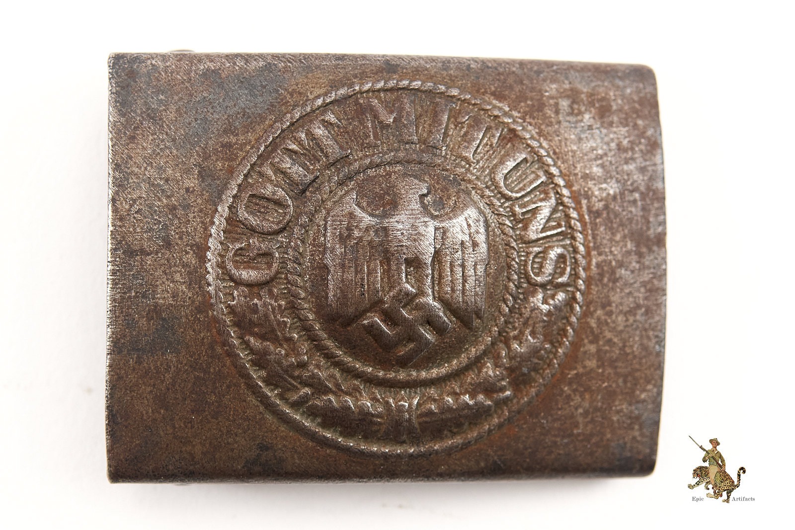 Historical Description: The belt buckle was an important part of the regalia worn by all uniformed military, civil, political and paramilitary organizations during the Third Reich. The belt (“Koppel”) was part of the uniform and would always be worn while on duty. The belt buckle (“Koppelschloss”) was generally specific to each organization, with many organizations having separate belt buckles for officers and for enlisted personnel, sometimes with different colors and finishes to further denote specific purposes. The buckles were adorned with various mottos and designs specific to the organizations for which they were intended. Many designs used the German national eagle emblem, in a variety of forms. Belt buckles were worn with uniforms ranging from finely tailored officer parade uniforms, to the issue uniforms of enlisted soldiers in combat. Generally speaking, most German belt buckles of the Third Reich were made with two prongs on the reverse, to allow the buckle to be worn and adjusted on a belt. The buckle had a catch that would mate with a hook on the belt, when worn. The earliest Third Reich buckles were often made of brass, or nickel silver. Later, aluminum became very common, and was used on private purchase as well as enlisted buckles of the German military, with or without a painted or plated finish. After WWII began, most enlisted military buckles were steel. Nazi belt buckles were popular souvenirs for Allied troops who served in Europe. Some types were made by the millions and remain quite common today. Others were made in limited numbers and are very rare.
