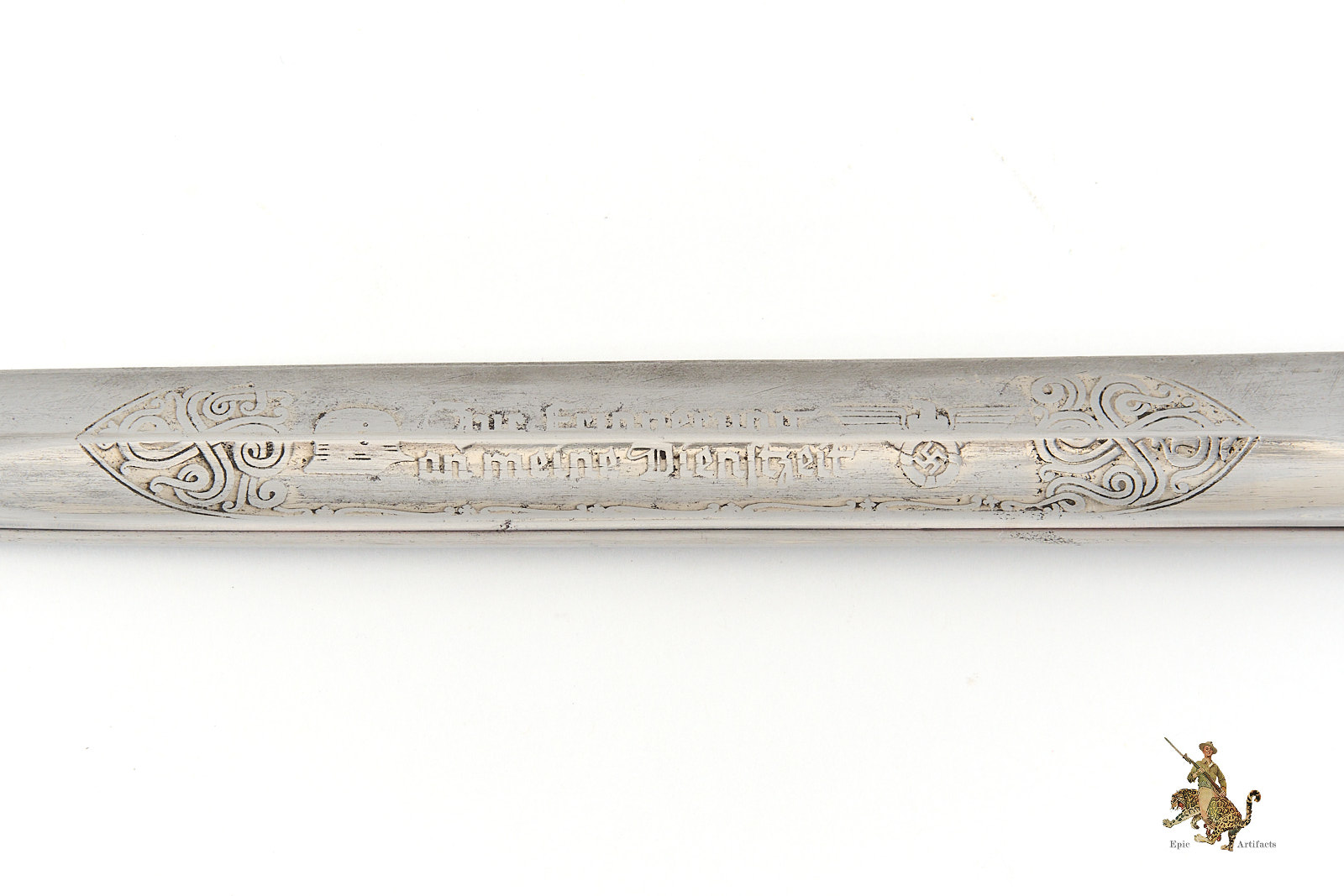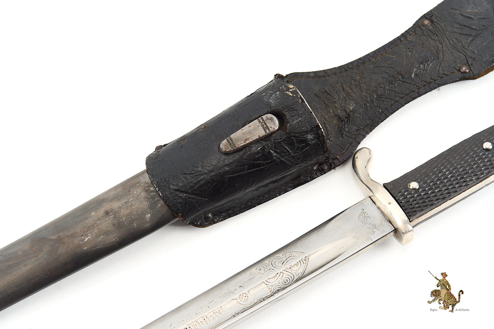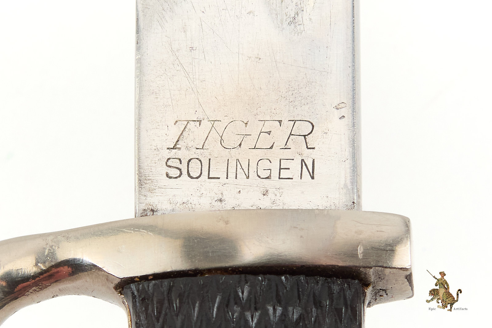 Product Description: A desirable example of a German Army presentation-style sidearm, this Heer Etched Bayonet w/ Frog – Tiger is attributed to the Tiger maker and retains its distinctive etched blade. The engraving shows visible wear and light softening, consistent with age and careful sharpening over time, while still preserving its decorative character.