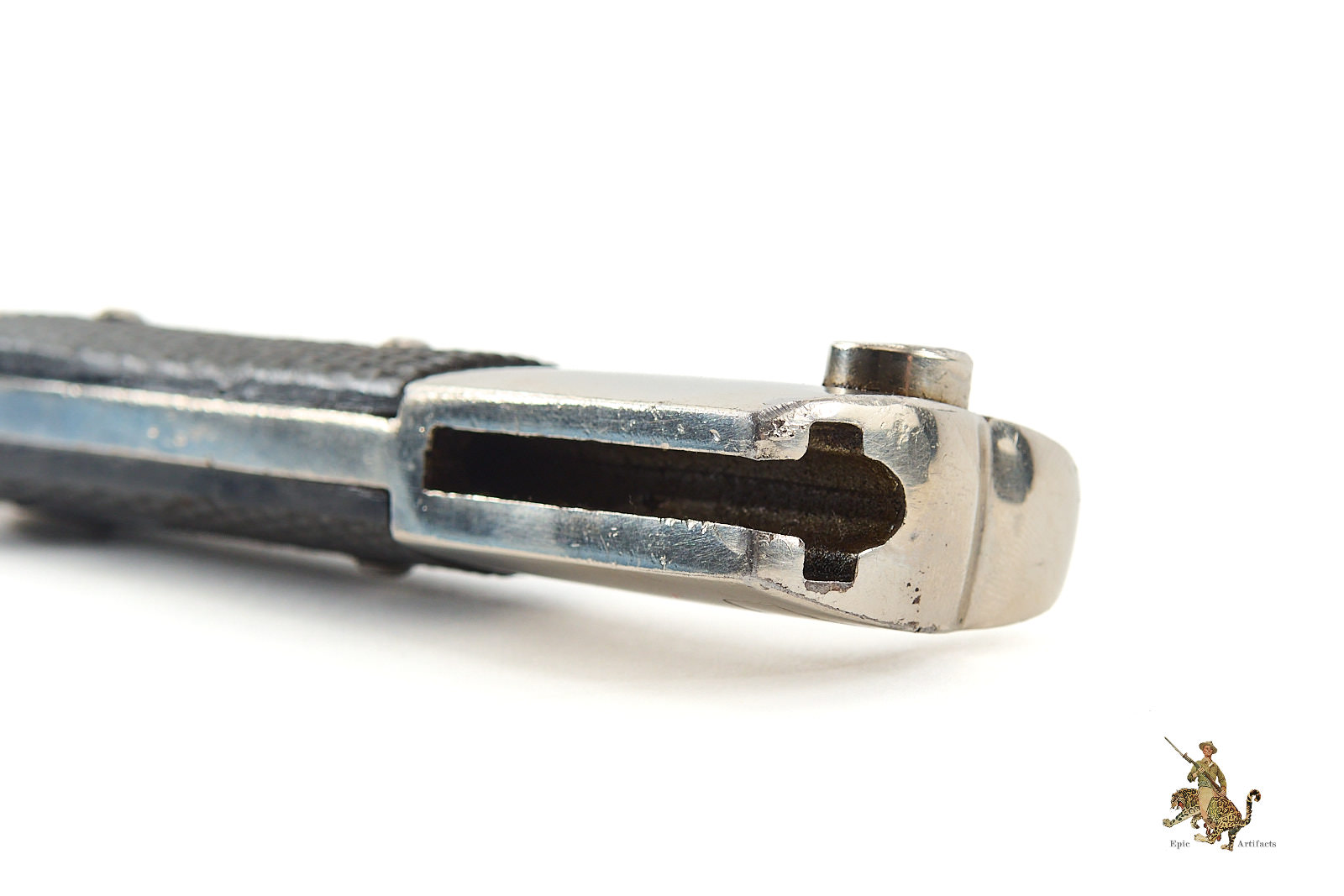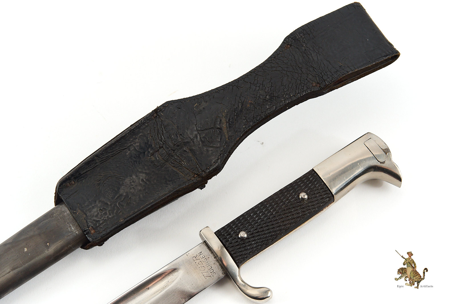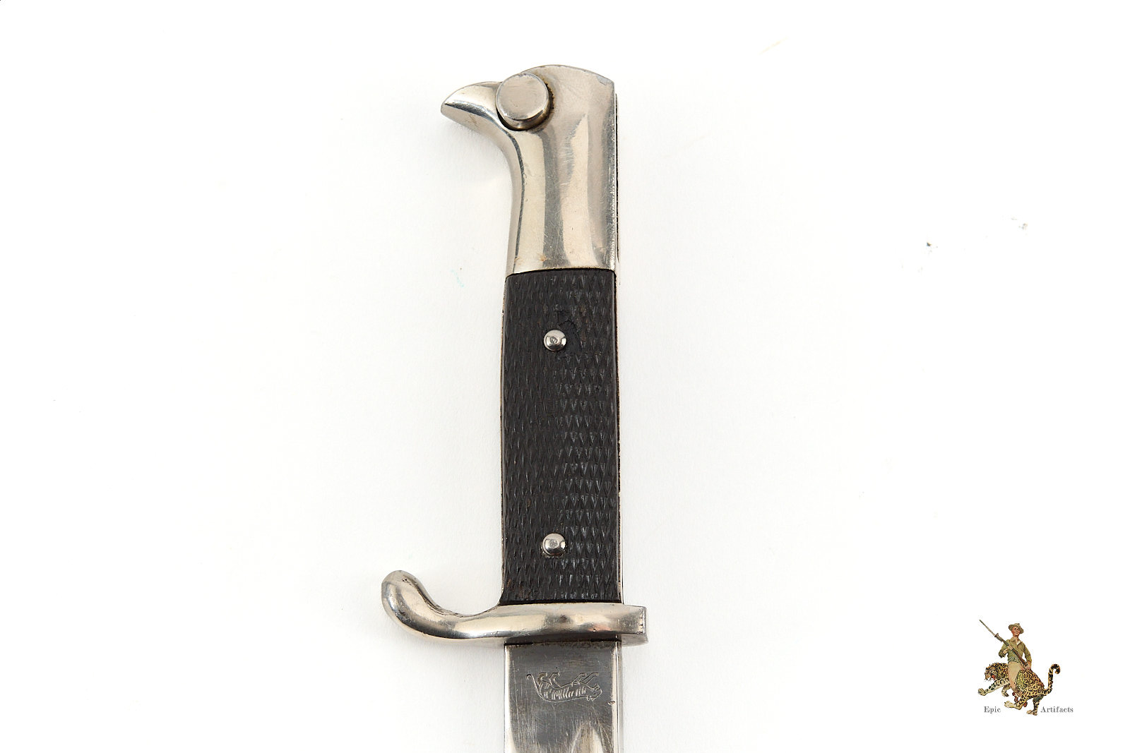 Historical Description: The bayonet was an important part of the combat equipment of the German soldier in both World Wars. The first pattern of German combat bayonet was the Mauser model 1898 which had a long, slender blade. As a result of experiences in combat use in WWI, it was soon decided to shorten the blades on these weapons. This 1898 pattern bayonet was used early in WWI alongside the 1898/05 and the S84/98 bayonets, which were initially shorter, and stronger, than the unmodified 1898 type. Both of these types were made with and without a saw-backed blade. Due to the challenges faced by German industry and the shortages of raw materials, a variety of “Ersatz” (replacement) types were introduced during WWI. After the war, the S84/98 bayonet became standard issue in the Reichswehr and later, in the Wehrmacht, for troops armed with the K98 rifle (the standard WWII German infantry weapon). The bayonets made for issue with the K98 rifle initially had wooden grips. Later, some bayonets were made with Bakelite grips. The bayonets were worn on the belt by means of a leather frog, of which there were a number of prewar and wartime variations including a short bayonet frog for use with the folding shovel, and a webbing frog for tropical use. In 1942, a new model of bayonet was introduced, knows as the SG42. This was a very modernized bayonet, with a comfortable Bakelite grip, and a relatively short blade that made it ideal for use either as a bayonet or a fighting knife. Within the grip was a removable multi-tool insert with a folding knife/bottle opener, awl and screwdriver. Although the SG42 was proposed as a replacement for the S84/98, few were manufactured. German combat bayonets were made in countless variations and all are very collectible today, with some rare variants being very avidly sought-after.
