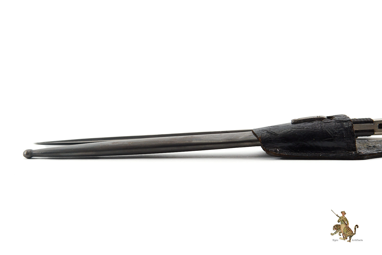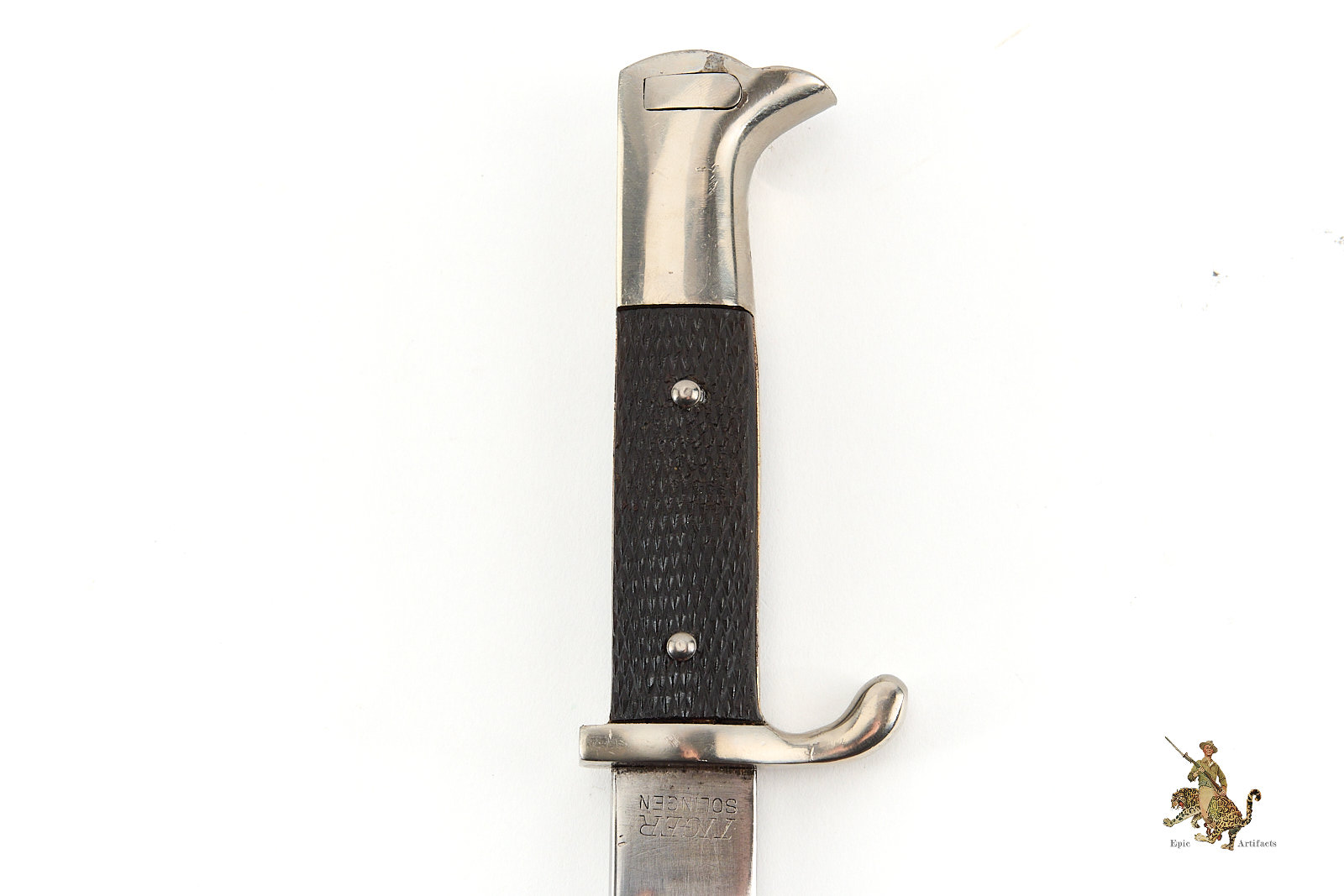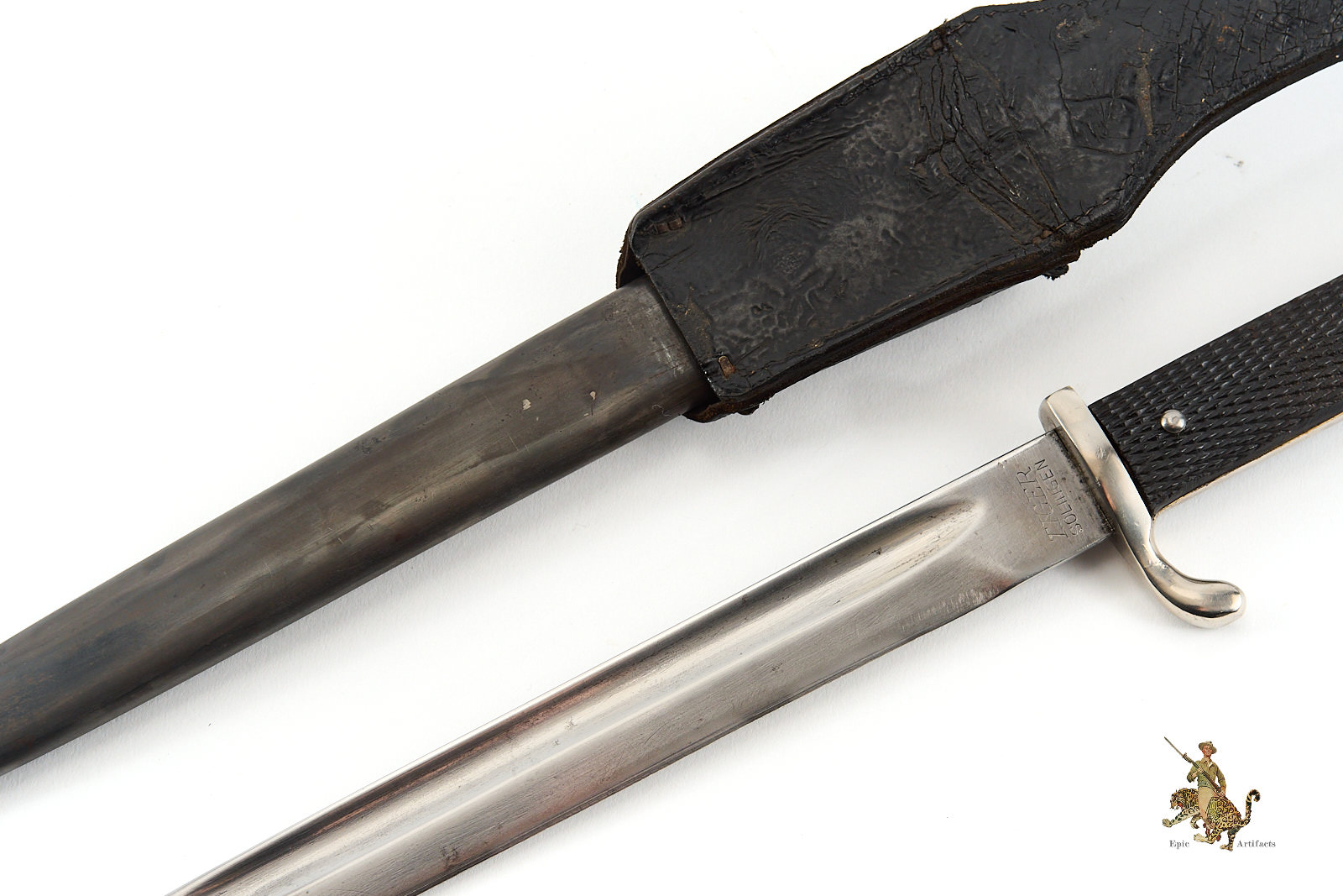 Historical Description: The bayonet was an important part of the combat equipment of the German soldier in both World Wars. The first pattern of German combat bayonet was the Mauser model 1898 which had a long, slender blade. As a result of experiences in combat use in WWI, it was soon decided to shorten the blades on these weapons. This 1898 pattern bayonet was used early in WWI alongside the 1898/05 and the S84/98 bayonets, which were initially shorter, and stronger, than the unmodified 1898 type. Both of these types were made with and without a saw-backed blade. Due to the challenges faced by German industry and the shortages of raw materials, a variety of “Ersatz” (replacement) types were introduced during WWI. After the war, the S84/98 bayonet became standard issue in the Reichswehr and later, in the Wehrmacht, for troops armed with the K98 rifle (the standard WWII German infantry weapon). The bayonets made for issue with the K98 rifle initially had wooden grips. Later, some bayonets were made with Bakelite grips. The bayonets were worn on the belt by means of a leather frog, of which there were a number of prewar and wartime variations including a short bayonet frog for use with the folding shovel, and a webbing frog for tropical use. In 1942, a new model of bayonet was introduced, knows as the SG42. This was a very modernized bayonet, with a comfortable Bakelite grip, and a relatively short blade that made it ideal for use either as a bayonet or a fighting knife. Within the grip was a removable multi-tool insert with a folding knife/bottle opener, awl and screwdriver. Although the SG42 was proposed as a replacement for the S84/98, few were manufactured. German combat bayonets were made in countless variations and all are very collectible today, with some rare variants being very avidly sought-after.