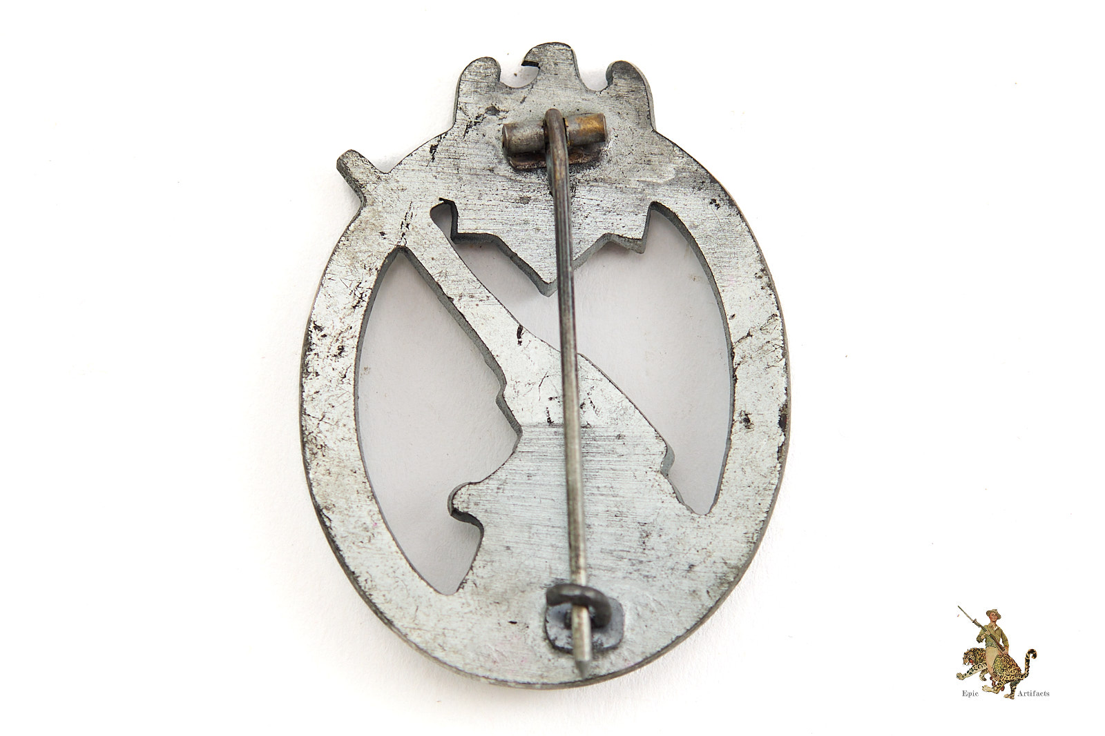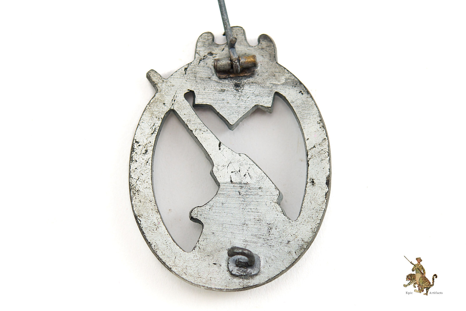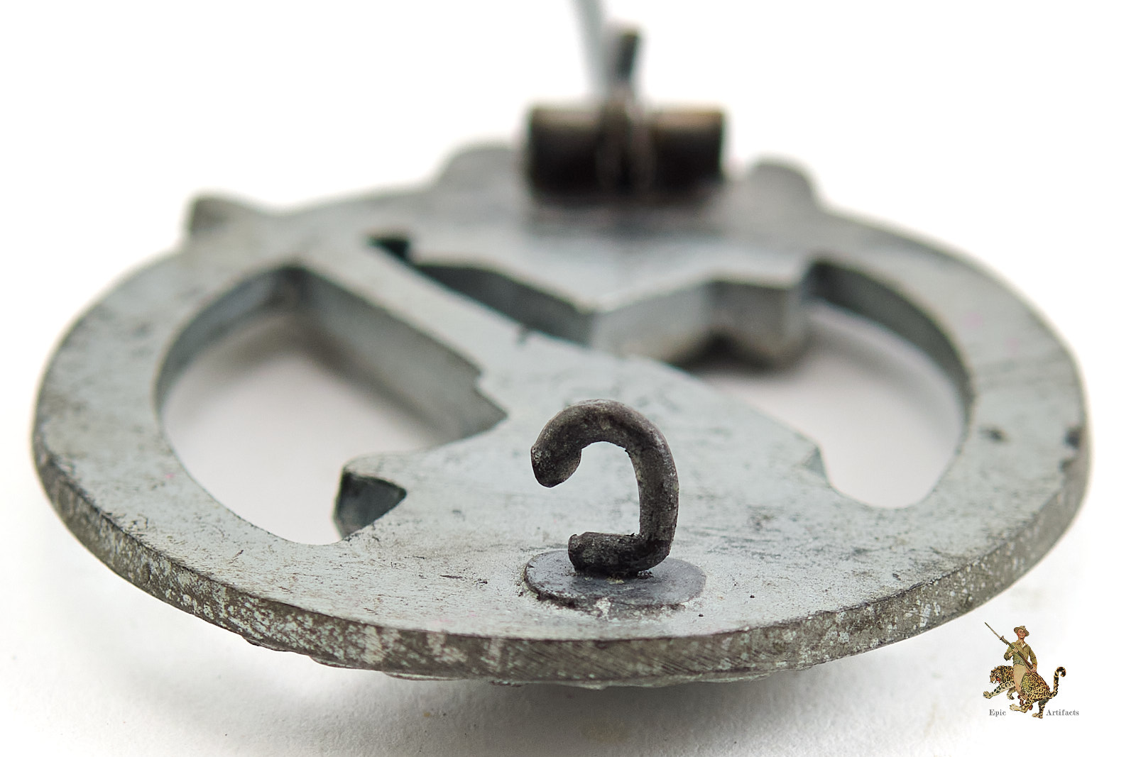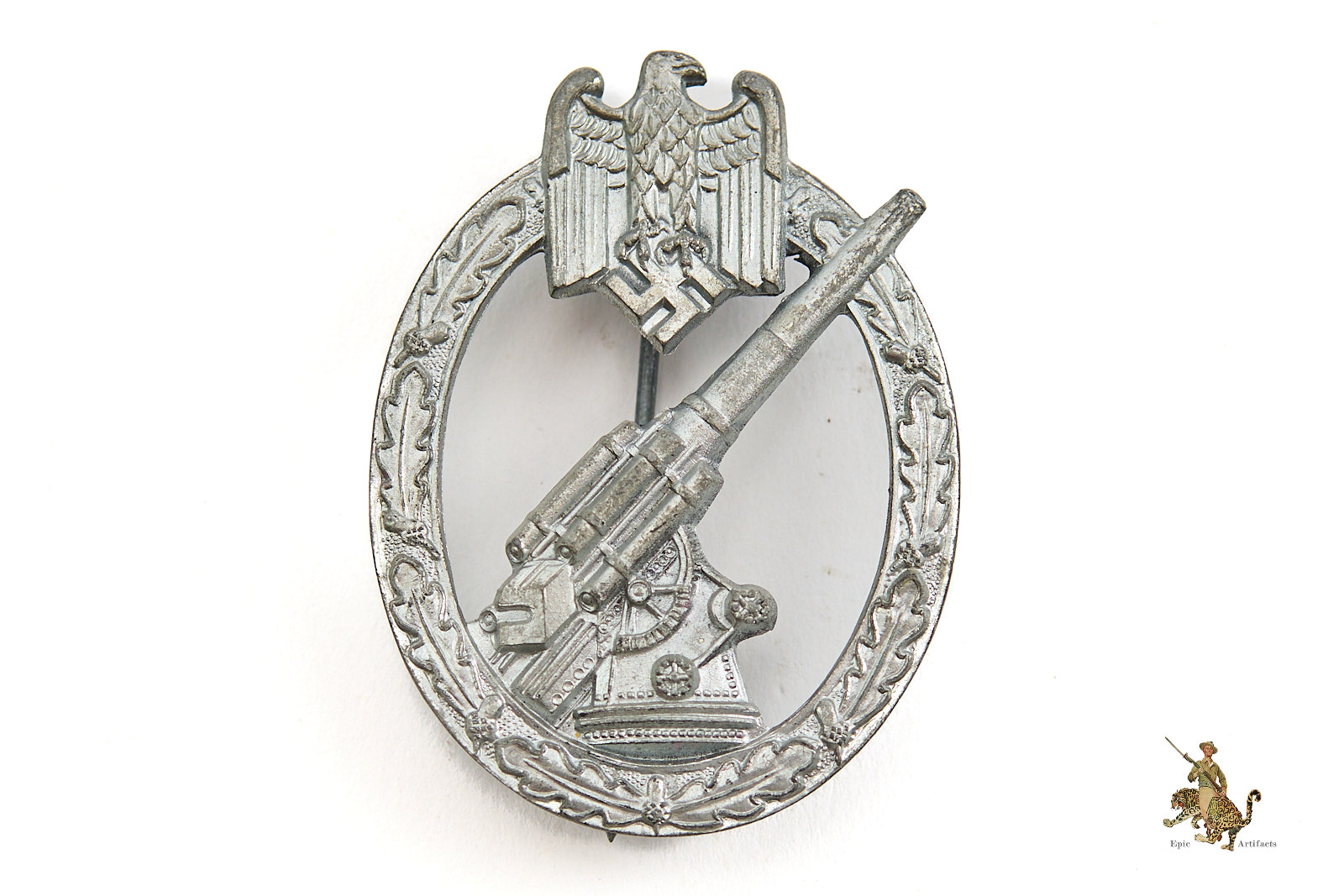 The badge itself is of a somewhat simple design.  An 88mm gun resting on a gun emplacement was surrounded by an oakleaves wreath. Placed at the top is the “Reichsadler” eagle clutching a mobile swastika.  These badges are found primarily in zinc, but a rarer form does exist in a higher quality tombak/brass base metal.