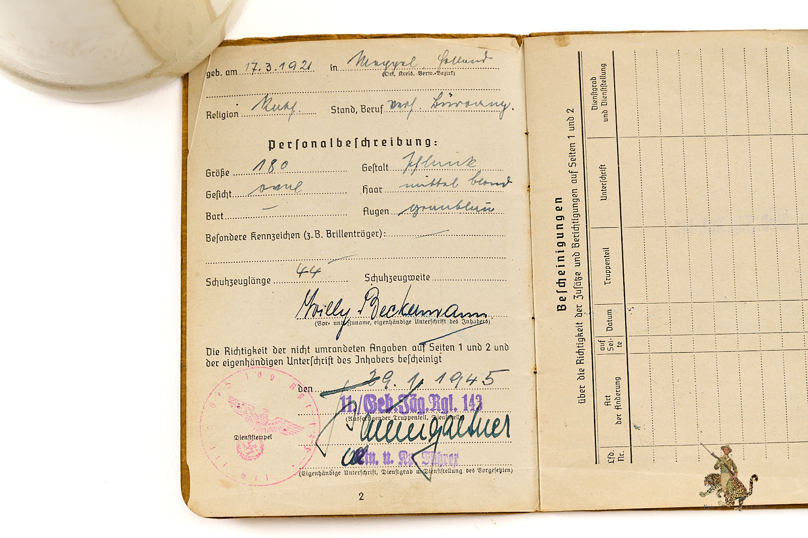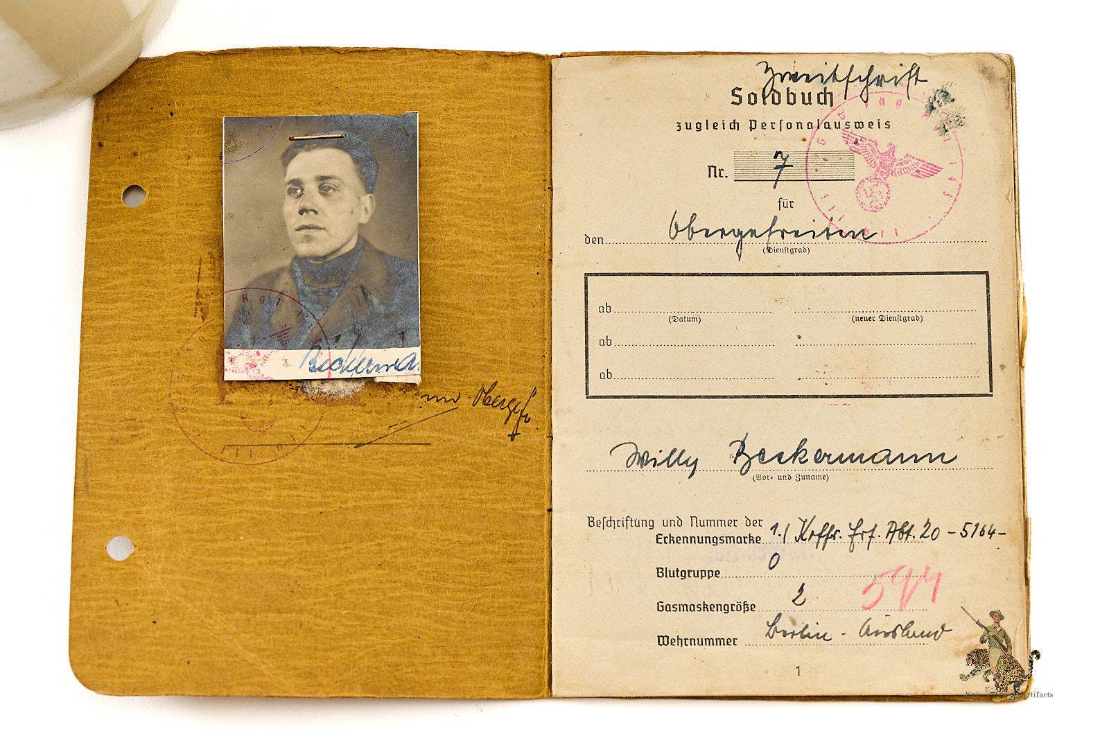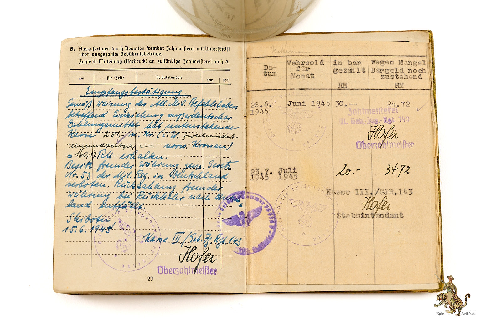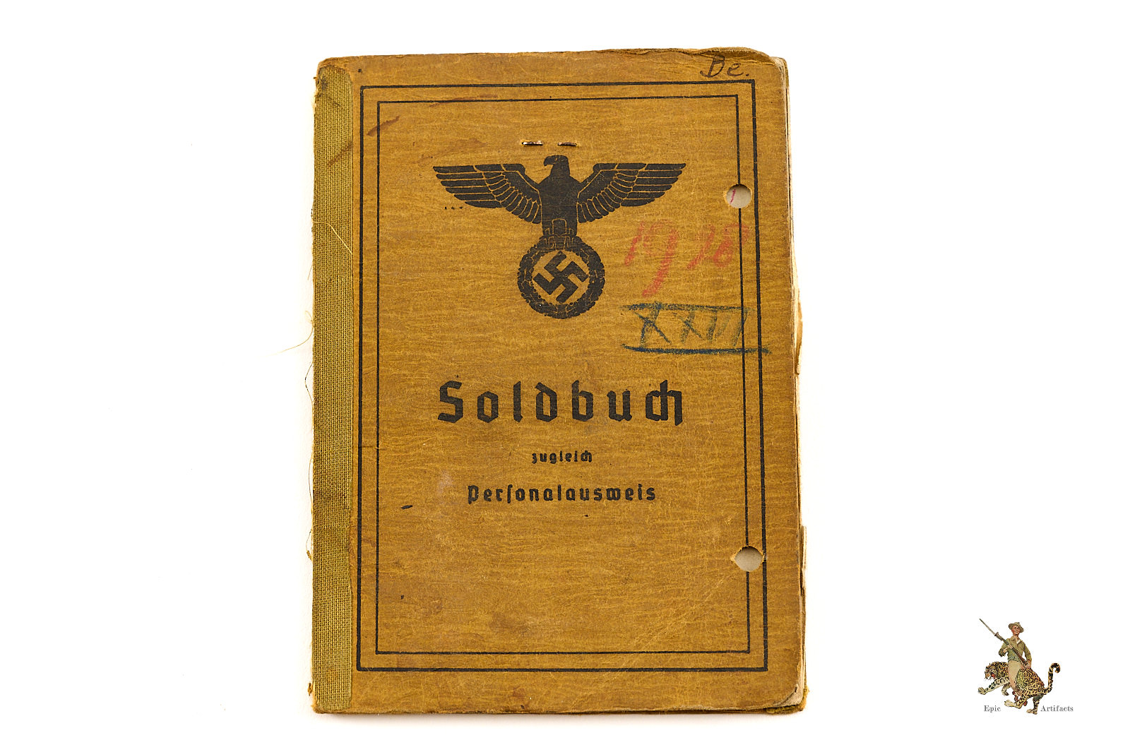 Historical Description: The Wehrpaß and Soldbuch were essential military documents used by the German Wehrmacht during World War II to manage and record soldiers’ service. The Wehrpaß, issued upon registration for military duty, served as a comprehensive, centrally held record of a soldier’s training, unit assignments, medical evaluations, promotions, and awards, but was not carried in the field. In contrast, the Soldbuch was a compact, portable document issued at the start of active duty and kept on the soldier’s person at all times, functioning as an ID, pay book, and record of issued equipment, medical treatment, and daily administrative details. Together, they formed the backbone of personnel tracking in the German military, and today they serve as important historical sources for understanding individual service histories and broader Wehrmacht organization.