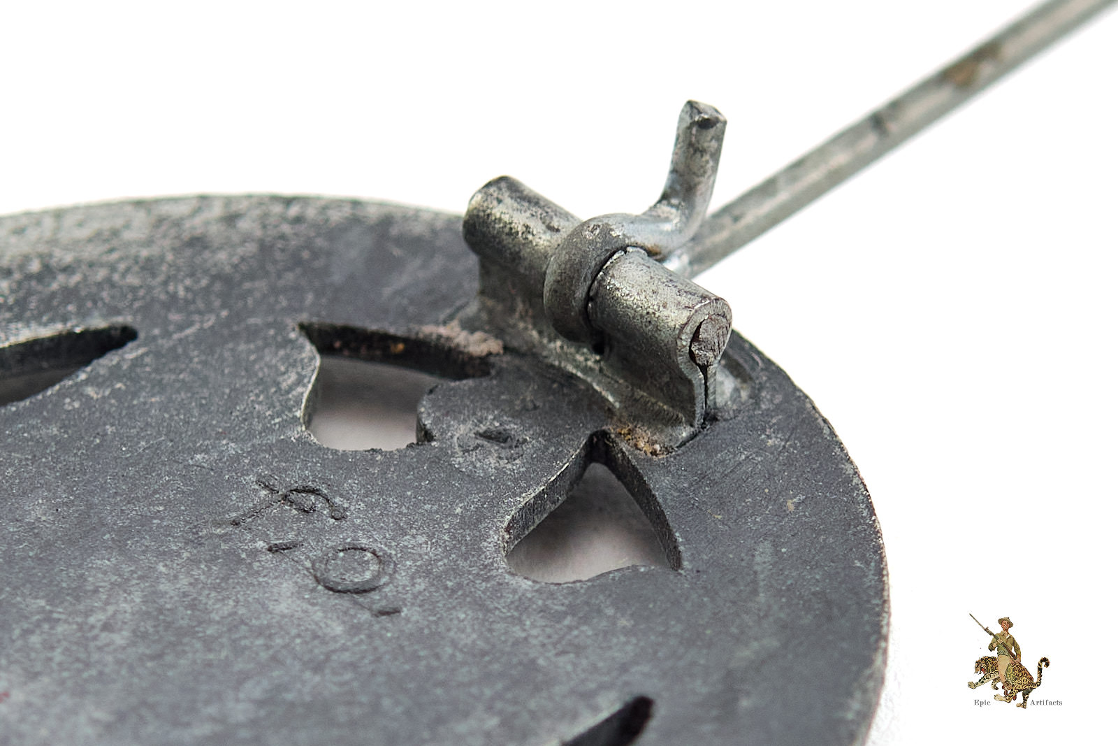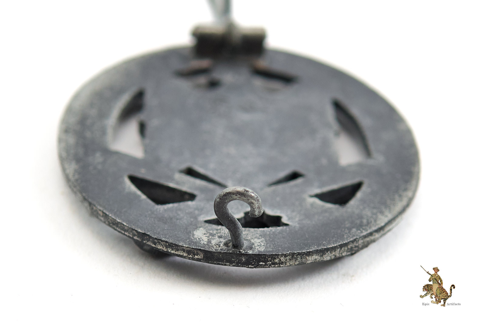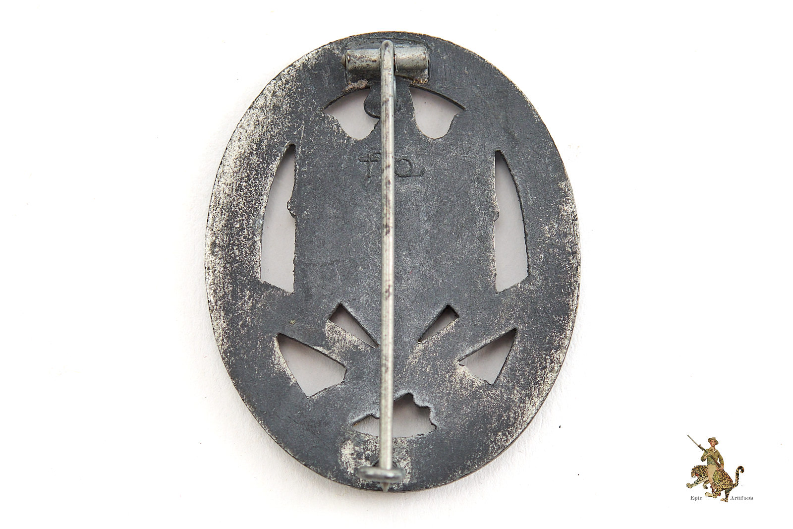 Product Description: A fine example of the Heer General Assault Badge – F.O., presented in excellent + overall condition. Approximately 75% of the original silvered finish remains throughout the front, with dull gray zinc tone showing at high points.  The round wire pin and flat metal catch remain fully functional and well-fitted. Despite the surface wear, the piece retains strong visual presence and craftsmanship characteristic of Friedrich Orth, Wien production. Overall this Heer General Assault Badge – F.O. rates in excellent condition.