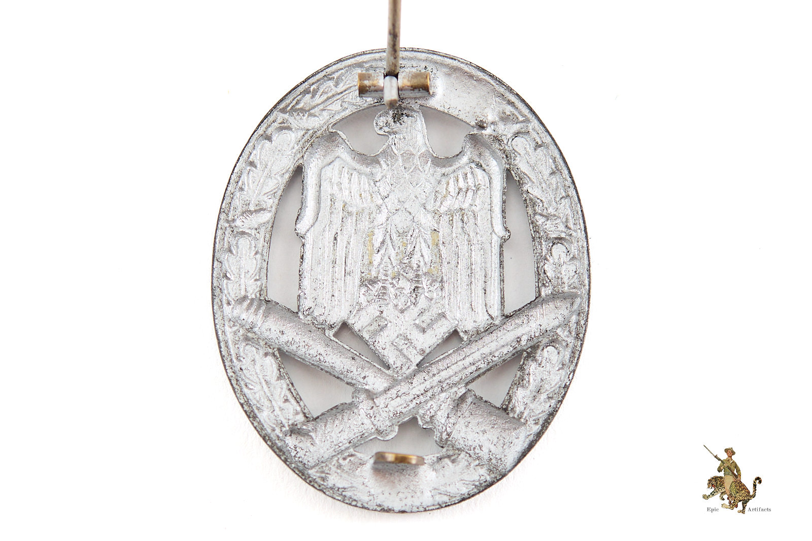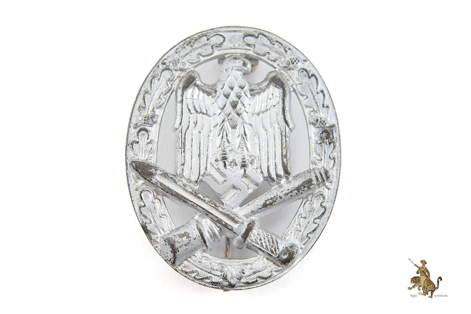 Product Description:A fine example of the Heer General Assault Badge – Schickle, presented in very good overall condition. The badge exhibits evidence of a period or later repaint, with some gentle loss of the original silvered finish to the raised areas, lending it an appealing patina. The round wire pin and flat metal catch remain fully functional and well-fitted. Despite the surface wear, the piece retains strong visual presence and craftsmanship characteristic of Schickle production. Overall this Heer General Assault Badge – Schickle rates in excellent condition.