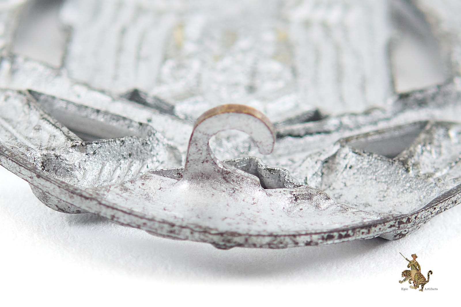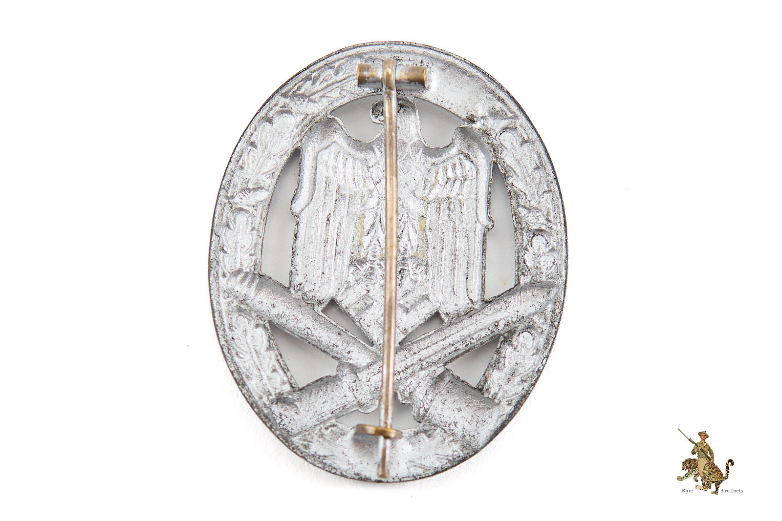The Standard General Assault Badge consists of an Oakleaves wreath surrounding a large National Eagle grasping the swastika with crossed bayonet and stick grenade underneath. The General Assault Badge can be found in several different base metals such as Brass, Copper Coated Aluminum, Copper Coated Zinc, and Zinc. The use of the different types of base metal was directly impacted by the war as it progressed. Shortages forced manufacturers to switch from quality base metals like brass to lower quality base metals like zinc.