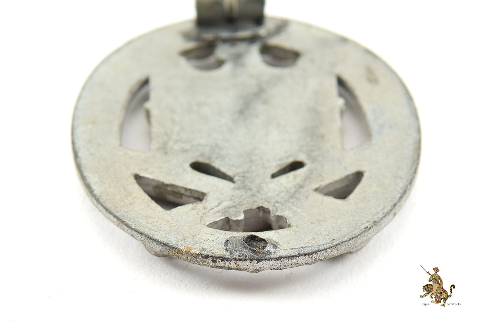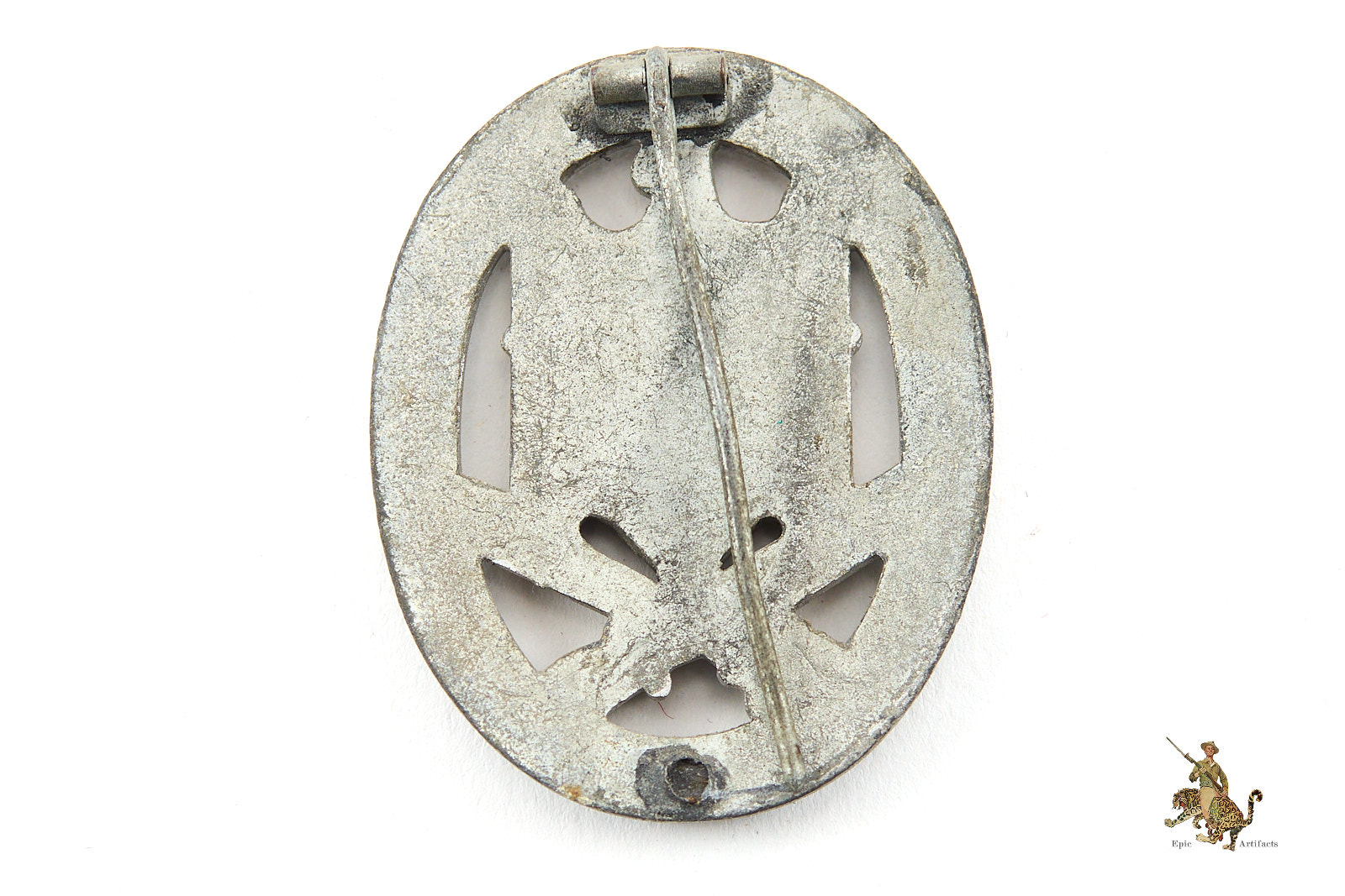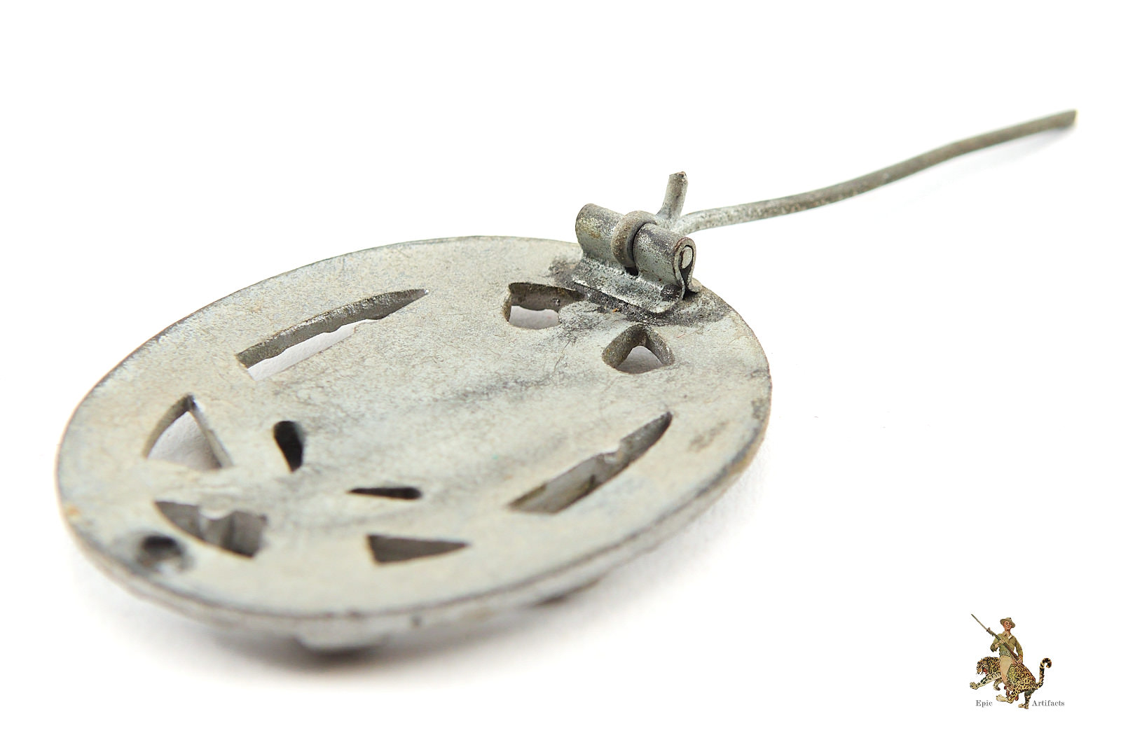 The Standard General Assault Badge consists of an Oakleaves wreath surrounding a large National Eagle grasping the swastika with crossed bayonet and stick grenade underneath. The General Assault Badge can be found in several different base metals such as Brass, Copper Coated Aluminum, Copper Coated Zinc, and Zinc. The use of the different types of base metal was directly impacted by the war as it progressed. Shortages forced manufacturers to switch from quality base metals like brass to lower quality base metals like zinc.