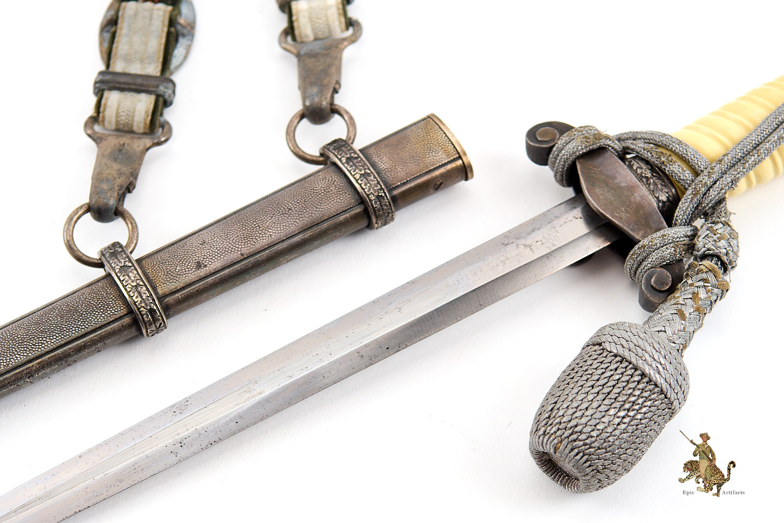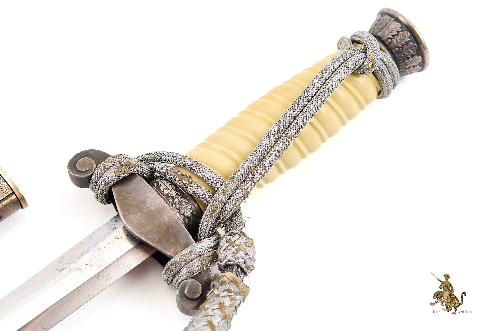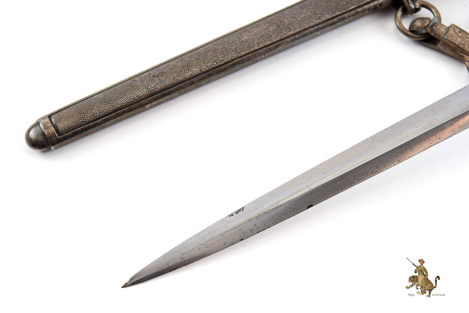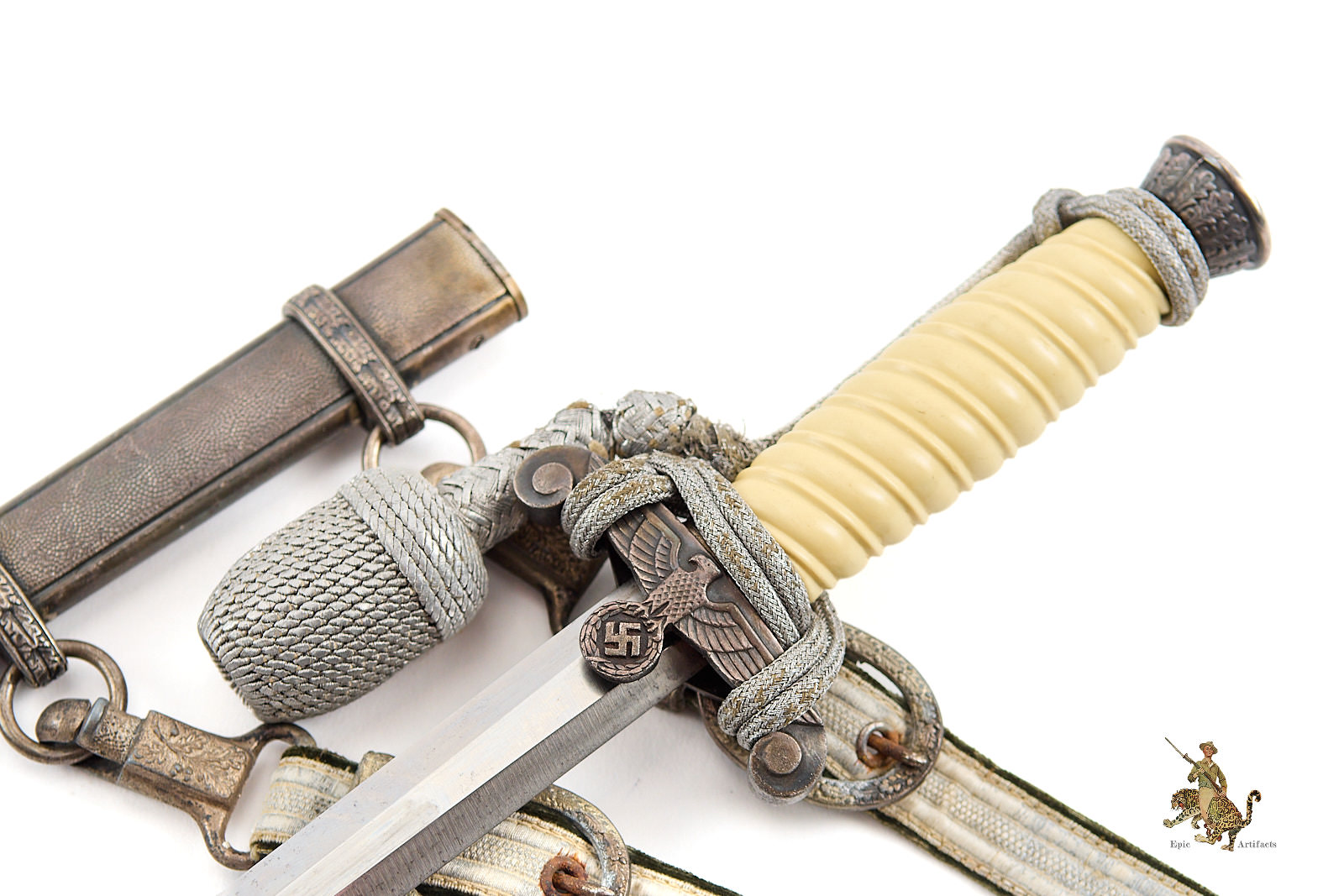 Historical Description: After WWI, the German military, known as the Reichswehr, was restricted to a relatively small force. Hitler changed this in 1935, reintroducing universal military conscription, and creating a new German Armed Forces- the Wehrmacht. Within the Wehrmacht, the German Army was known as the Heer, and a new dagger was designed and introduced for the officers of this new German Army in May 1935. As with all German Army officer uniforms and accoutrements, they were not issued; rather, the officer had to purchase them. These were ceremonial and decorative pieces of regalia, that were worn on occasions that did not call for carrying a sword. The overall pattern and design of the dagger remained consistent throughout the production run, but the large number of individual manufacturers created a wide variety in detail, especially regarding the handle fittings. There were approximately 42 different manufacturers of the blades. There were construction changes over time as well. Early German Army daggers generally featured plated brass alloy handle fittings. Later, zinc was used. Wartime type scabbards were generally unplated, with a gray finish. Production of German Army daggers ceased around 1943. The German Army was a huge organization, and large numbers of these daggers were produced. But there were many specific variants that were produced in low numbers, especially the highest quality, luxury type pieces for well-heeled officers. Some daggers were personalized, and customized, and are unique. The striking and attractive design of the German Army dagger was well-received by officers at the time, and these are very sought-after by collectors today.