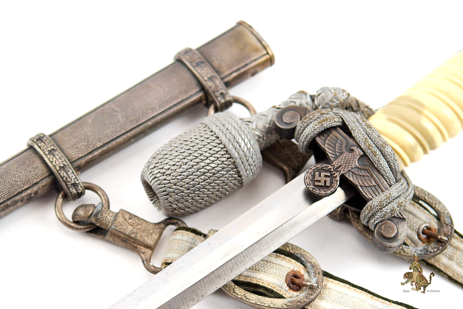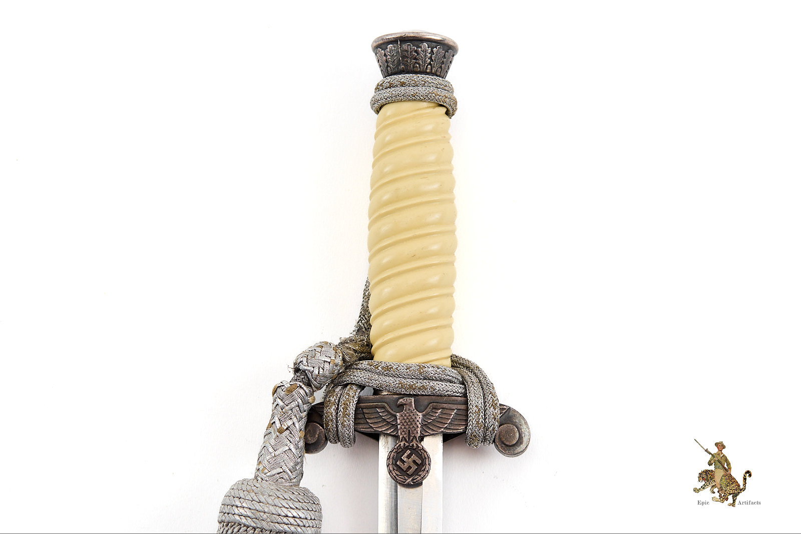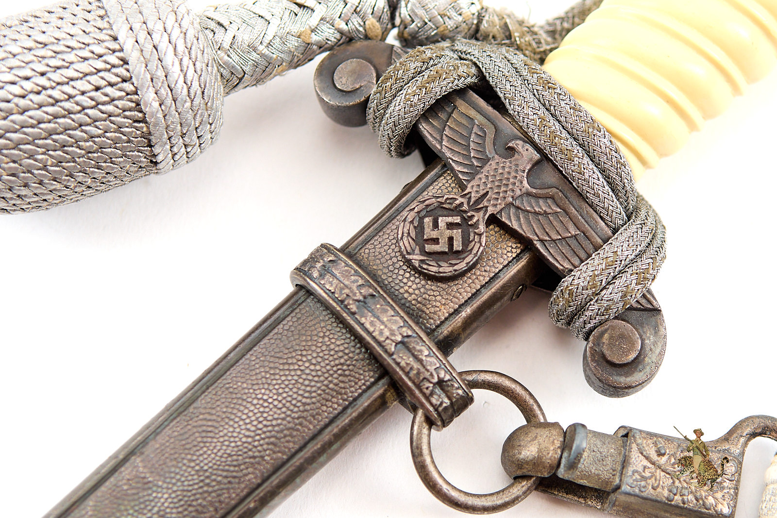 Historical Description: After WWI, the German military, known as the Reichswehr, was restricted to a relatively small force. Hitler changed this in 1935, reintroducing universal military conscription, and creating a new German Armed Forces- the Wehrmacht. Within the Wehrmacht, the German Army was known as the Heer, and a new dagger was designed and introduced for the officers of this new German Army in May 1935. As with all German Army officer uniforms and accoutrements, they were not issued; rather, the officer had to purchase them. These were ceremonial and decorative pieces of regalia, that were worn on occasions that did not call for carrying a sword. The overall pattern and design of the dagger remained consistent throughout the production run, but the large number of individual manufacturers created a wide variety in detail, especially regarding the handle fittings. There were approximately 42 different manufacturers of the blades. There were construction changes over time as well. Early German Army daggers generally featured plated brass alloy handle fittings. Later, zinc was used. Wartime type scabbards were generally unplated, with a gray finish. Production of German Army daggers ceased around 1943. The German Army was a huge organization, and large numbers of these daggers were produced. But there were many specific variants that were produced in low numbers, especially the highest quality, luxury type pieces for well-heeled officers. Some daggers were personalized, and customized, and are unique. The striking and attractive design of the German Army dagger was well-received by officers at the time, and these are very sought-after by collectors today.