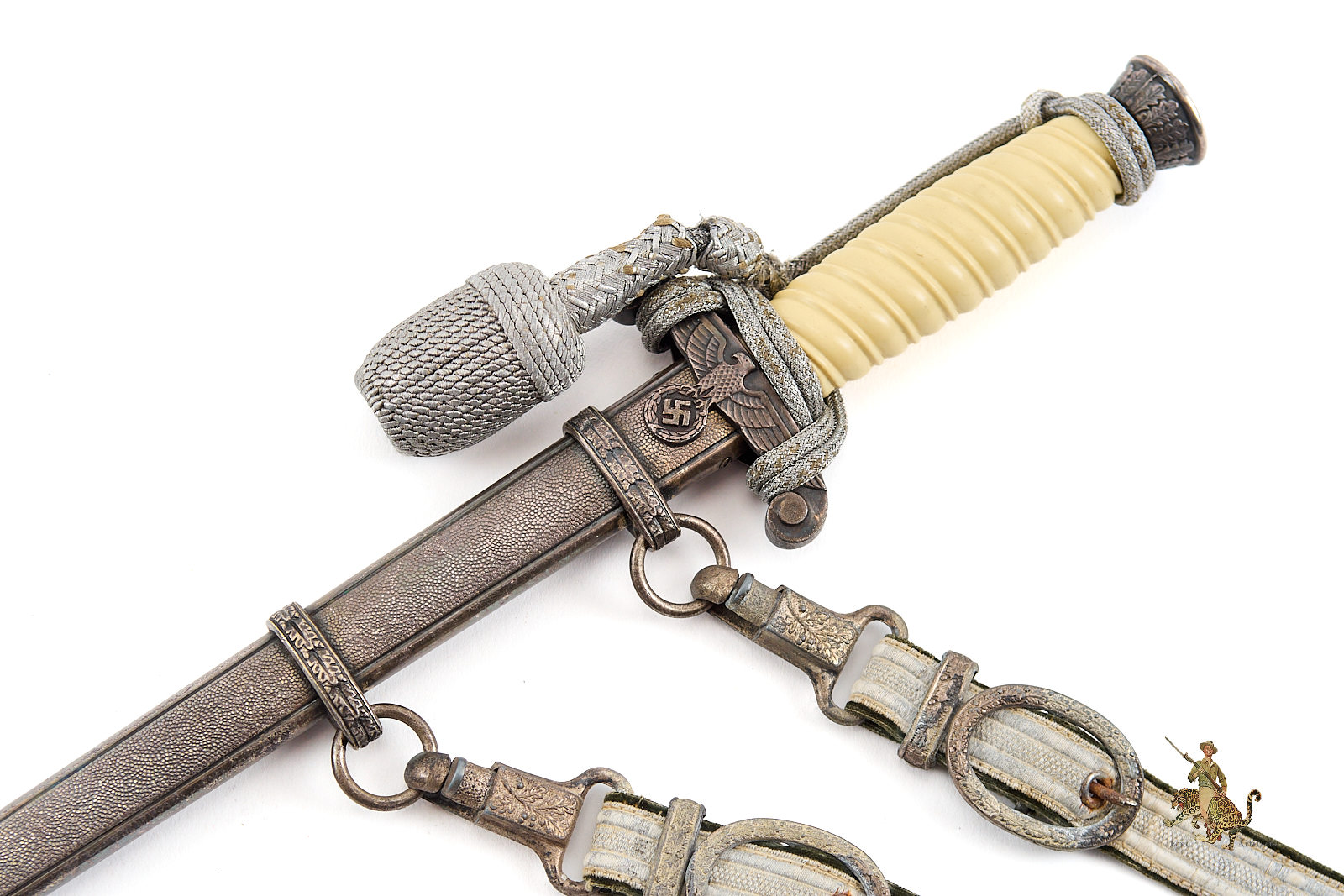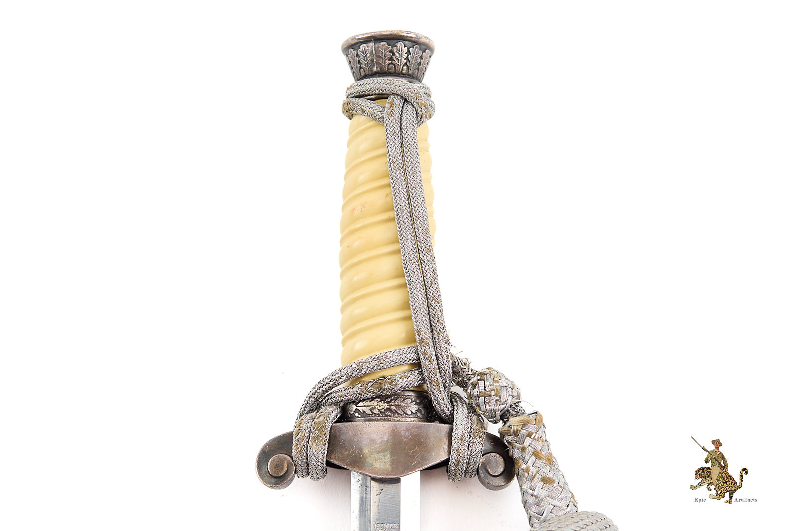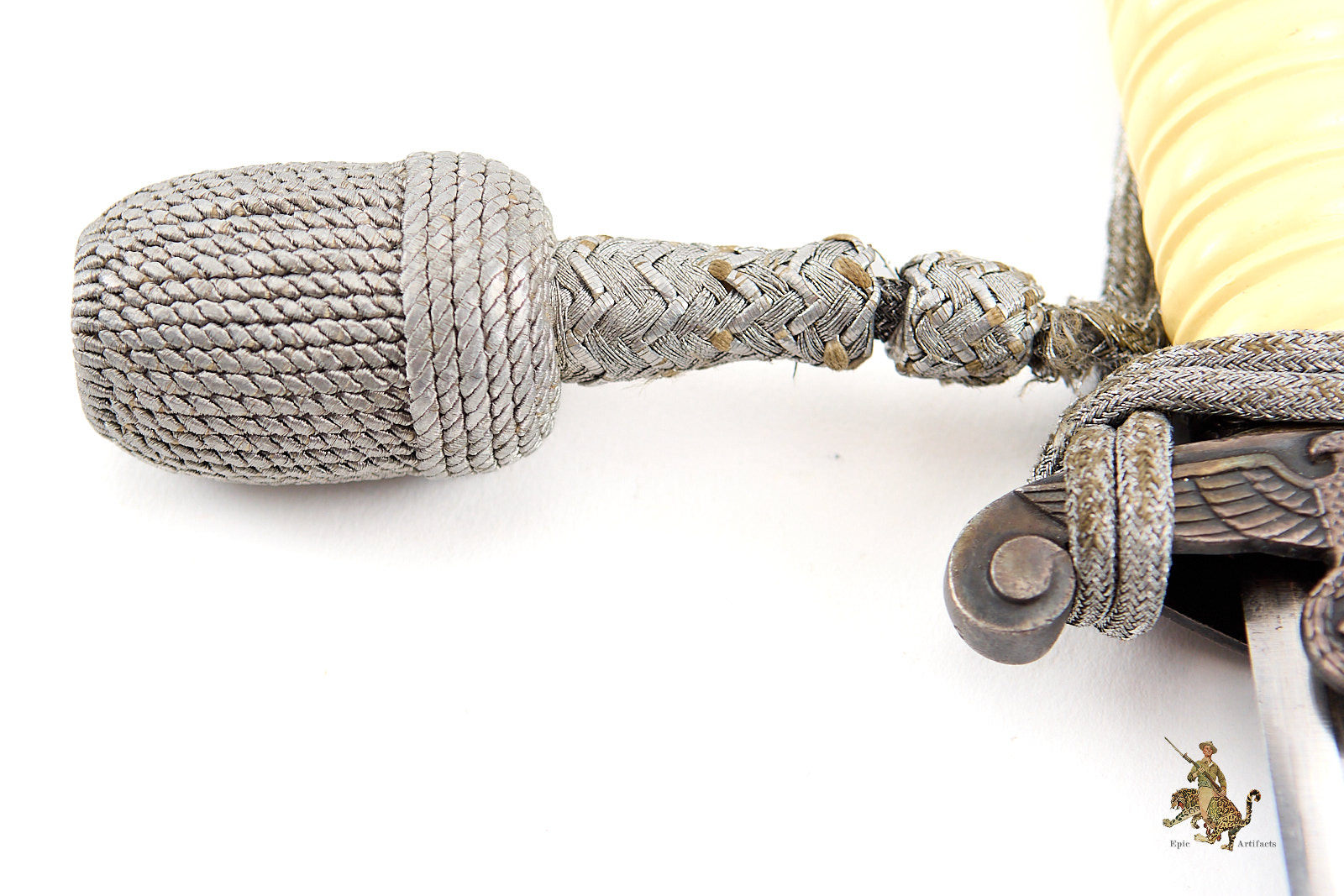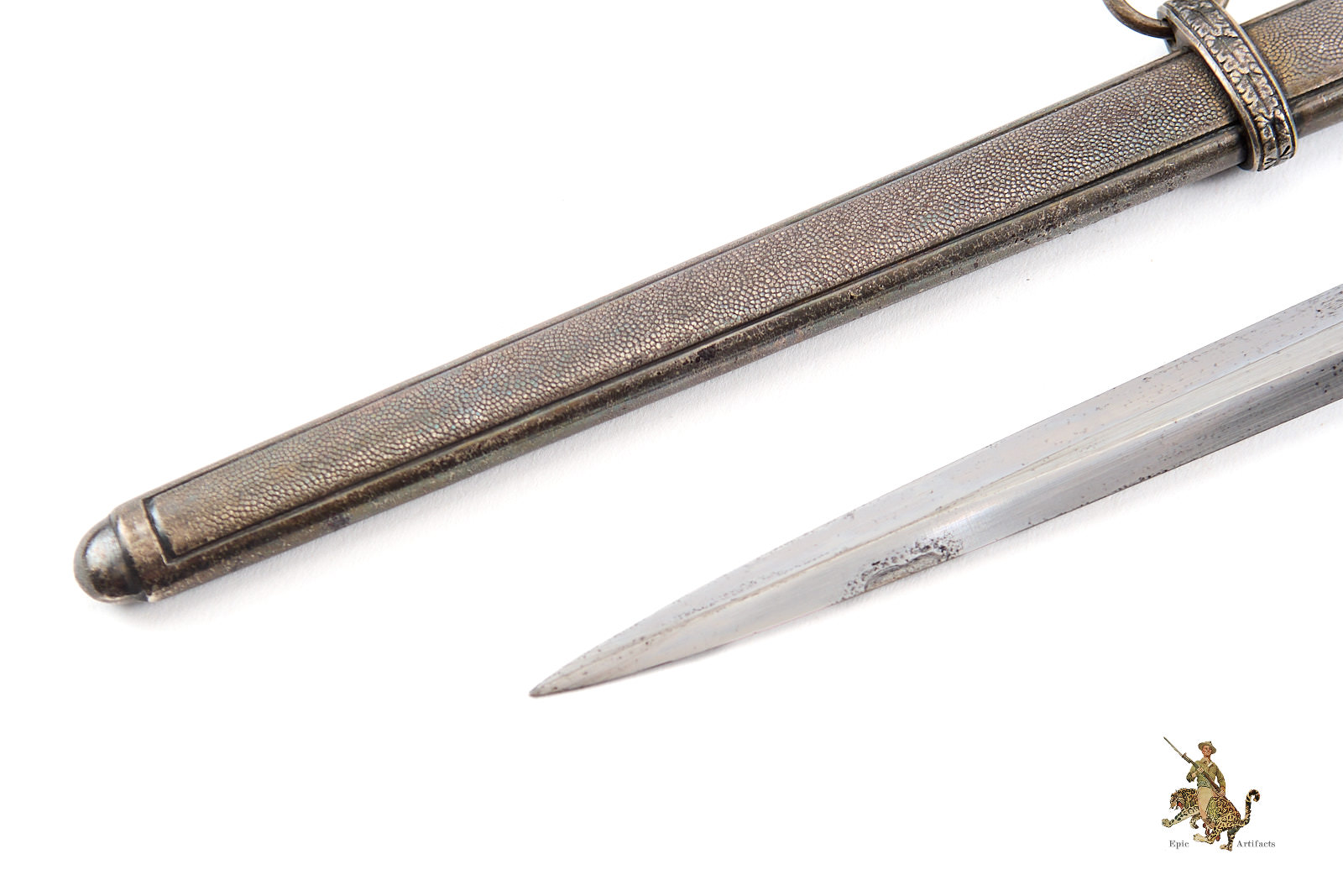 Historical Description: After WWI, the German military, known as the Reichswehr, was restricted to a relatively small force. Hitler changed this in 1935, reintroducing universal military conscription, and creating a new German Armed Forces- the Wehrmacht. Within the Wehrmacht, the German Army was known as the Heer, and a new dagger was designed and introduced for the officers of this new German Army in May 1935. As with all German Army officer uniforms and accoutrements, they were not issued; rather, the officer had to purchase them. These were ceremonial and decorative pieces of regalia, that were worn on occasions that did not call for carrying a sword. The overall pattern and design of the dagger remained consistent throughout the production run, but the large number of individual manufacturers created a wide variety in detail, especially regarding the handle fittings. There were approximately 42 different manufacturers of the blades. There were construction changes over time as well. Early German Army daggers generally featured plated brass alloy handle fittings. Later, zinc was used. Wartime type scabbards were generally unplated, with a gray finish. Production of German Army daggers ceased around 1943. The German Army was a huge organization, and large numbers of these daggers were produced. But there were many specific variants that were produced in low numbers, especially the highest quality, luxury type pieces for well-heeled officers. Some daggers were personalized, and customized, and are unique. The striking and attractive design of the German Army dagger was well-received by officers at the time, and these are very sought-after by collectors today.