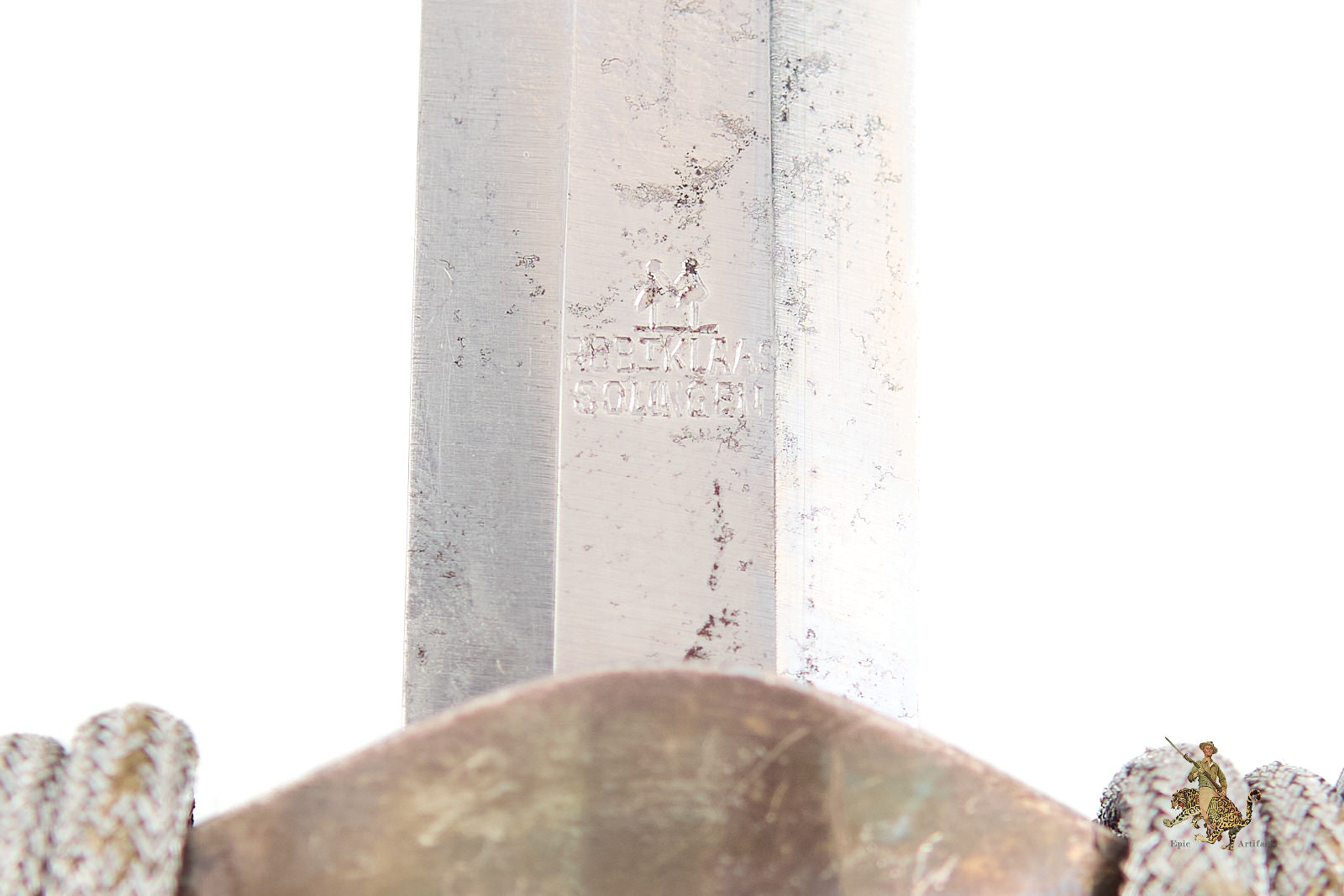 Product Description: A finely preserved Heer Klaas Army Dagger – Hangers & Portepee, exemplifying late-period Solingen workmanship. The off-white grip remains clean and well-shaped, showing only minor surface scratches, while the blade retains attractive cross-graining with scattered speckling, light pitting toward the tip, and typical runner marks. No evidence of sharpening or edge nicks is present. The ricasso bears the maker’s mark of Robert Klaas, Solingen, a name associated with consistently high-quality production.