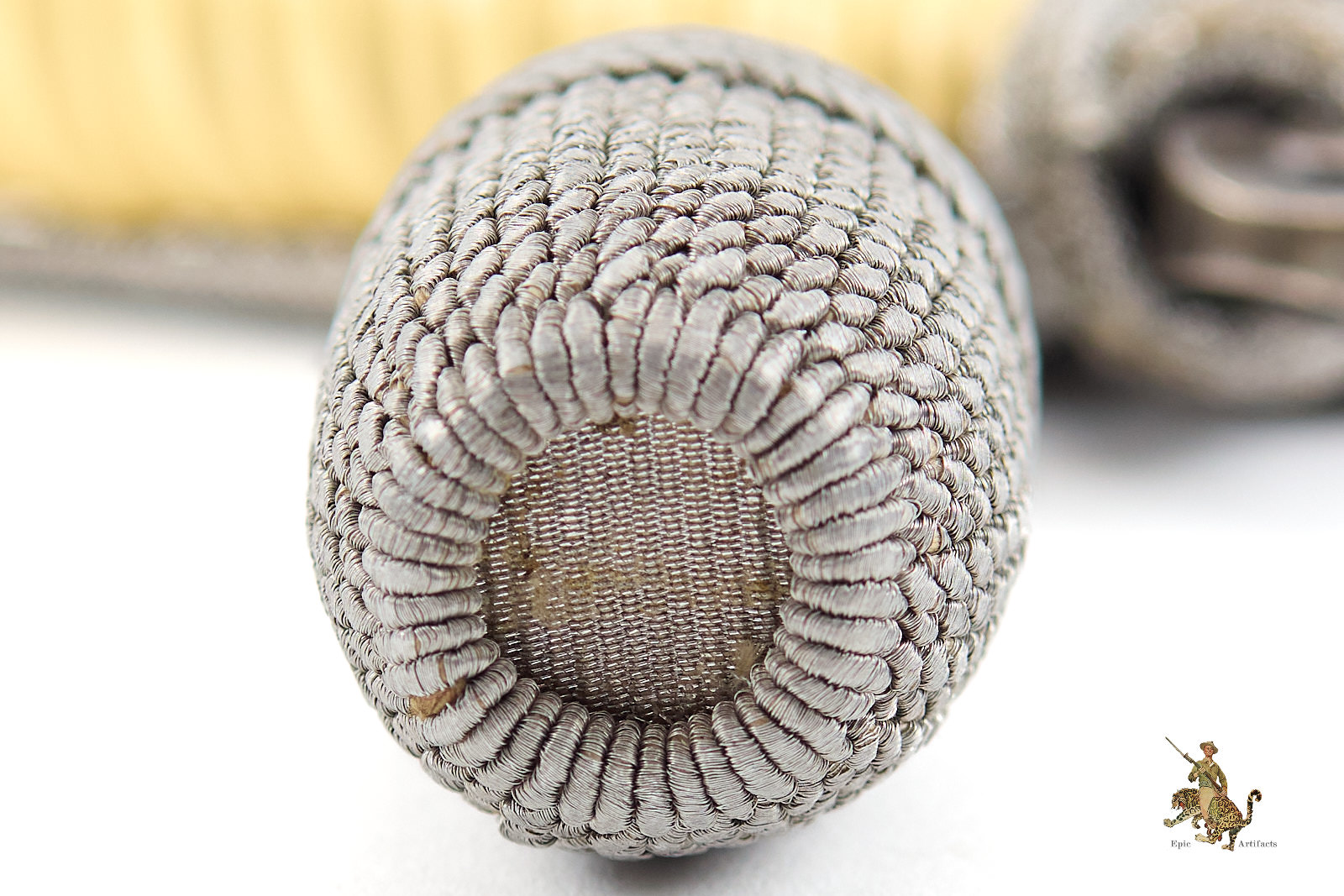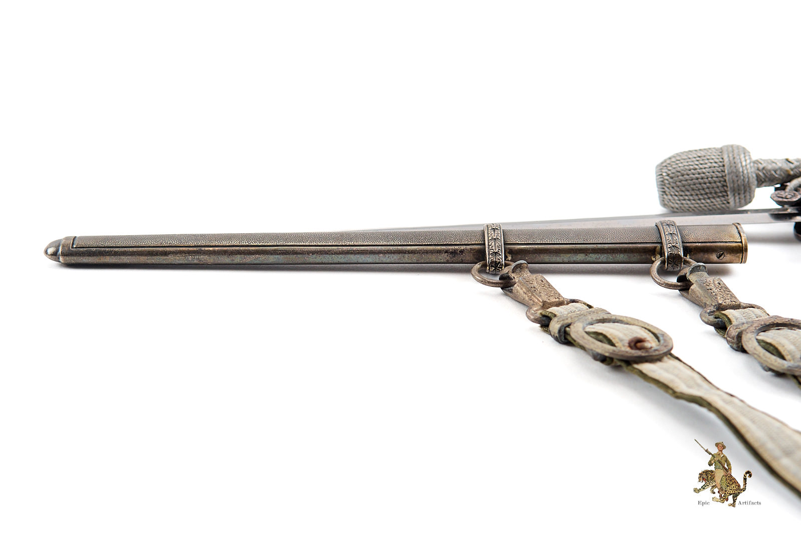The scabbard is in excellent condition, featuring sharply defined pebbling and a uniform patina that speaks to careful preservation. Throat screws remain intact. The accompanying hangers display expected age wear, including light corrosion at the eyelets and gentle rubbing along the reverse, yet remain structurally sound. The portepee is complete and neatly tied, showing only modest fraying at high points consistent with handling.