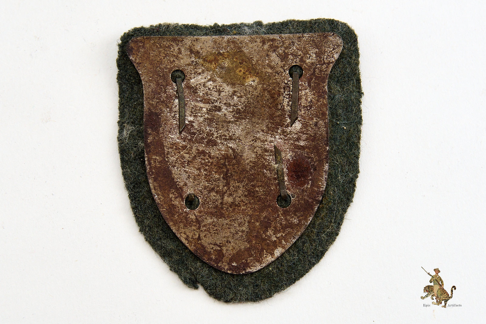 Product Description: This Heer Krim Campaign Shield is an outstanding piece. The base metal is magnetic steel. This material has held most of the original finish extremely well over time. The factory applied bronze finish is beautiful, with dull golden tones that contrast with deeper brown color in the recesses of the design. This shield is crisply stamped, with bold, impressive detail. The backing cloth is typical wartime field gray wool. The wool retains the original surface nap. The reverse of this Heer Krim Campaign Shield is missing the backing paper, but retains the original plate and 3 of the 4 attachment prongs.  This is a very eye-catching, choice piece, that rates in excellent condition.