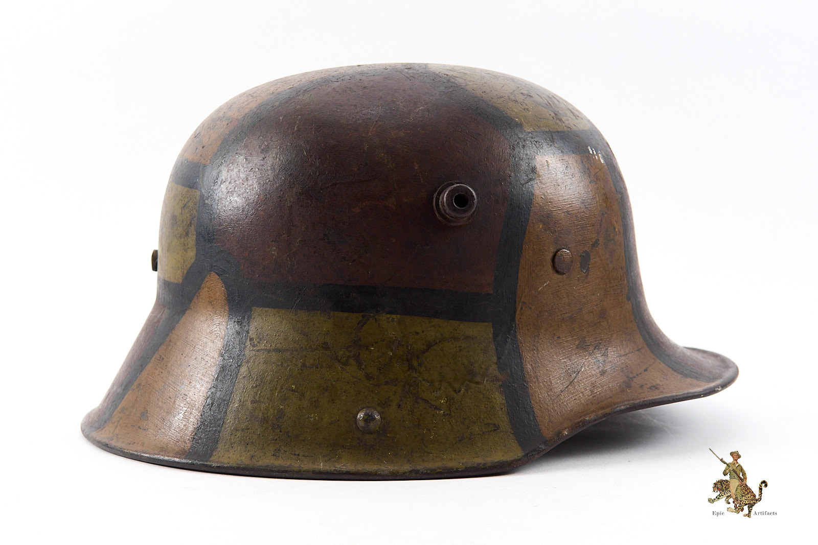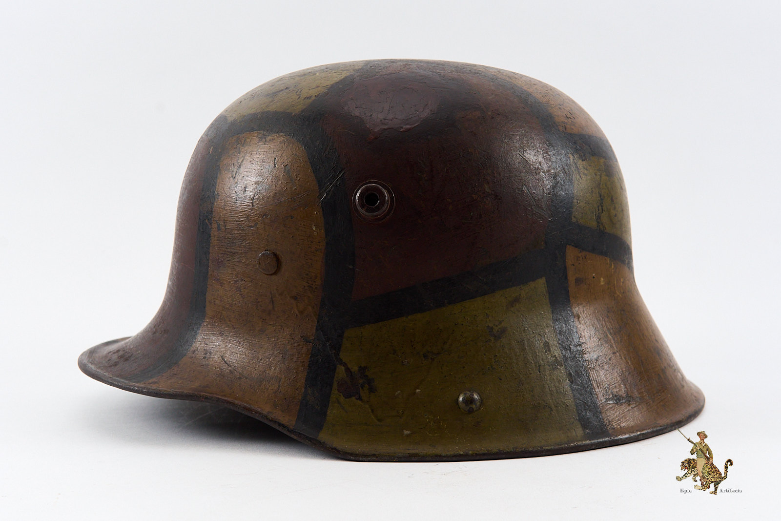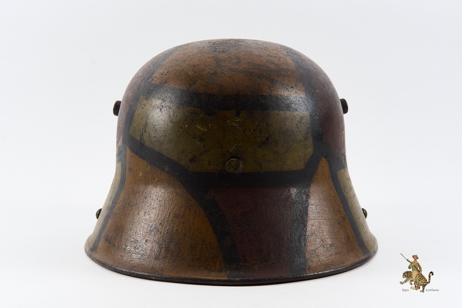 Product Description:  Heer M16 Camo Helmet – ET64, a highly attractive Imperial German First World War camouflage helmet. The steel shell is marked ET64, denoting the maker Eisenwerke Thale and size 64, and retains its original period-applied camouflage paint, which remains in excellent condition with only minor loss and wear consistent with age. The overall presentation is notably strong, with the camouflage pattern displaying well-defined colors and character.  Helmet rates as excellent + overall.