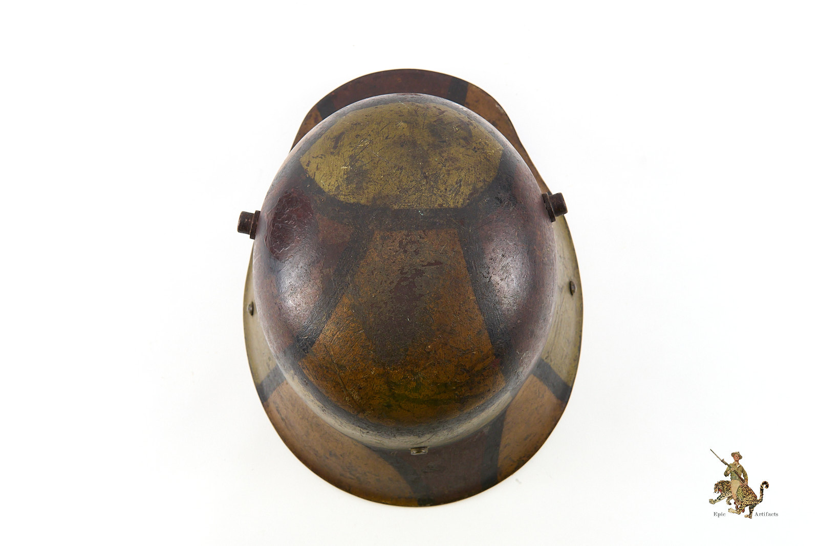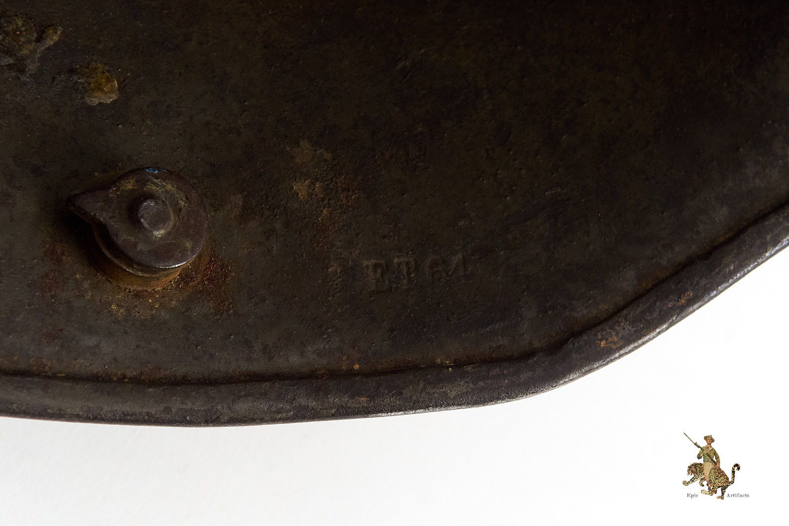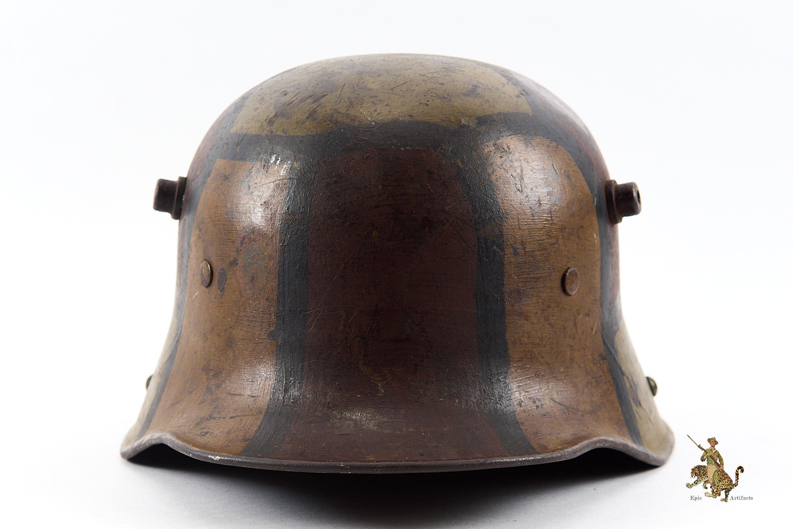 Product Description:  Heer M16 Camo Helmet – ET64, a highly attractive Imperial German First World War camouflage helmet. The steel shell is marked ET64, denoting the maker Eisenwerke Thale and size 64, and retains its original period-applied camouflage paint, which remains in excellent condition with only minor loss and wear consistent with age. The overall presentation is notably strong, with the camouflage pattern displaying well-defined colors and character.  Helmet rates as excellent + overall.