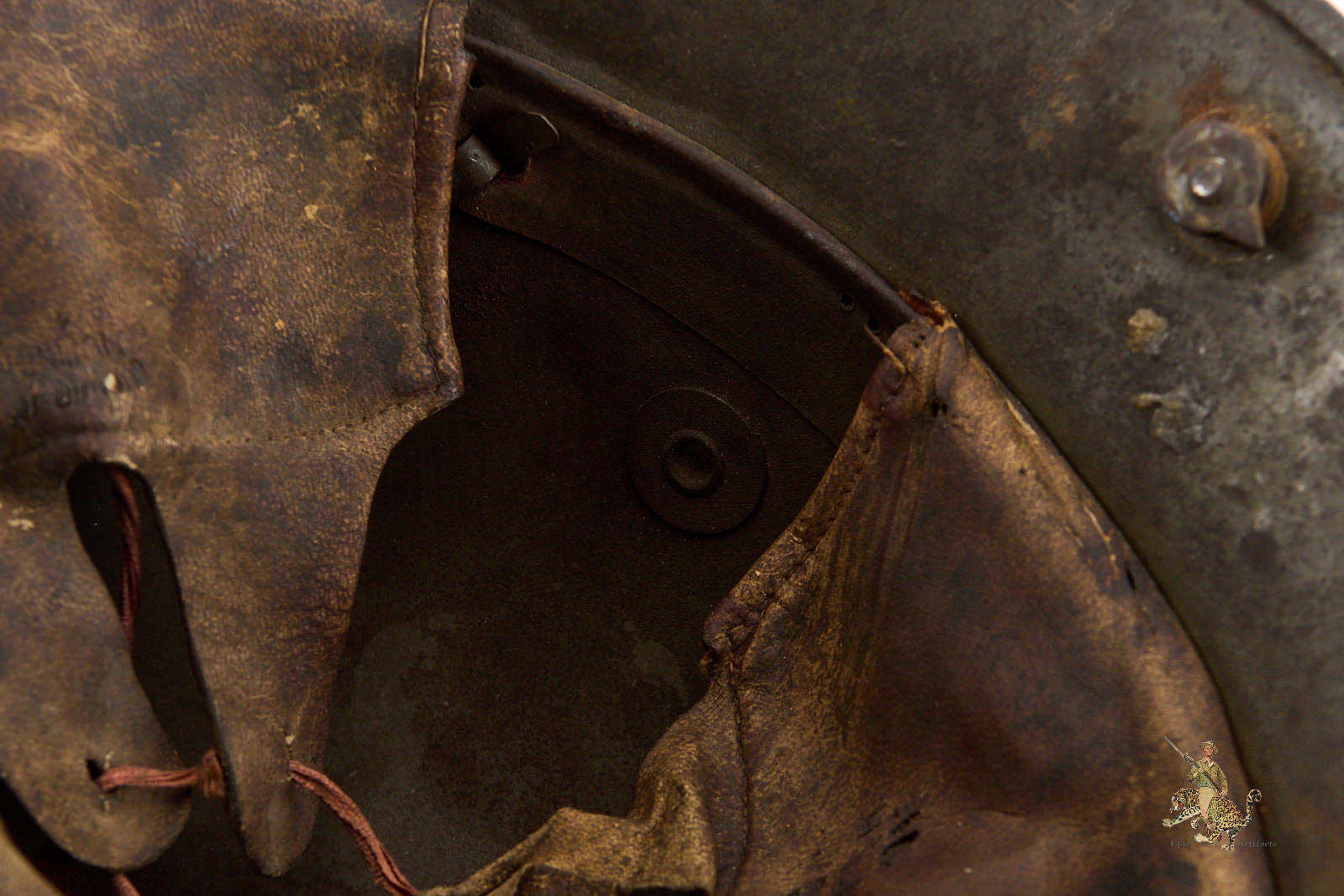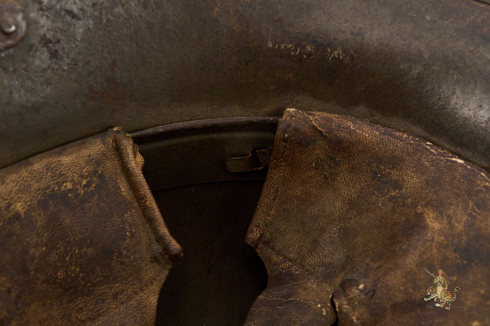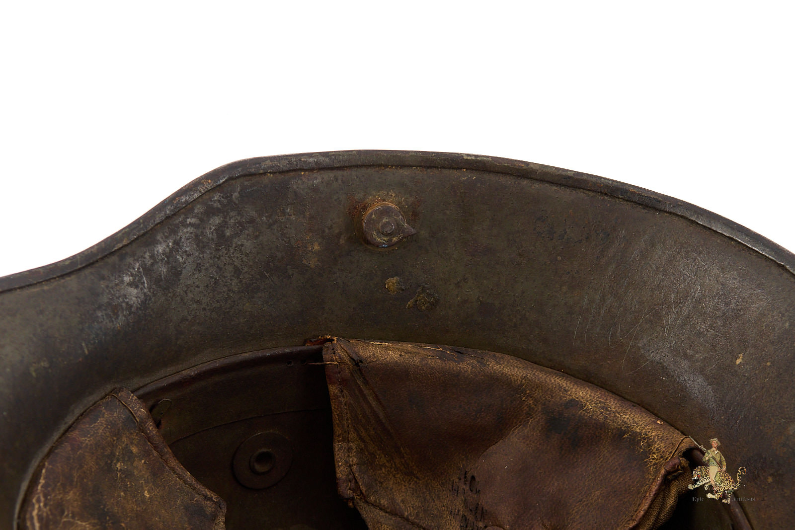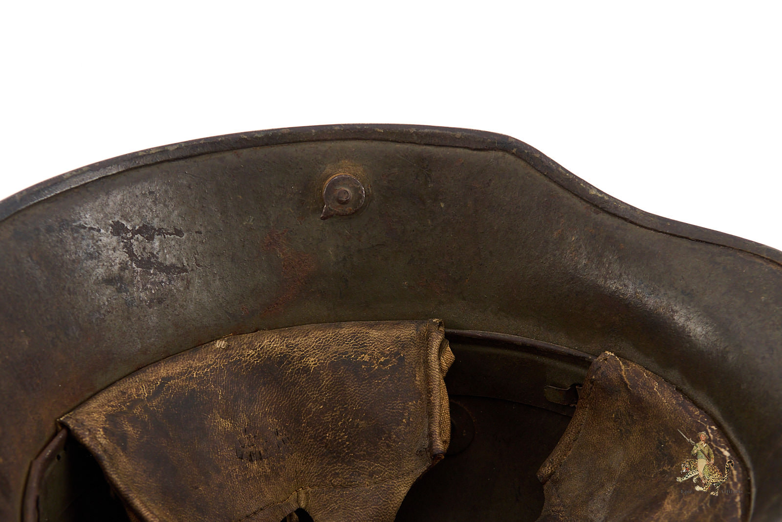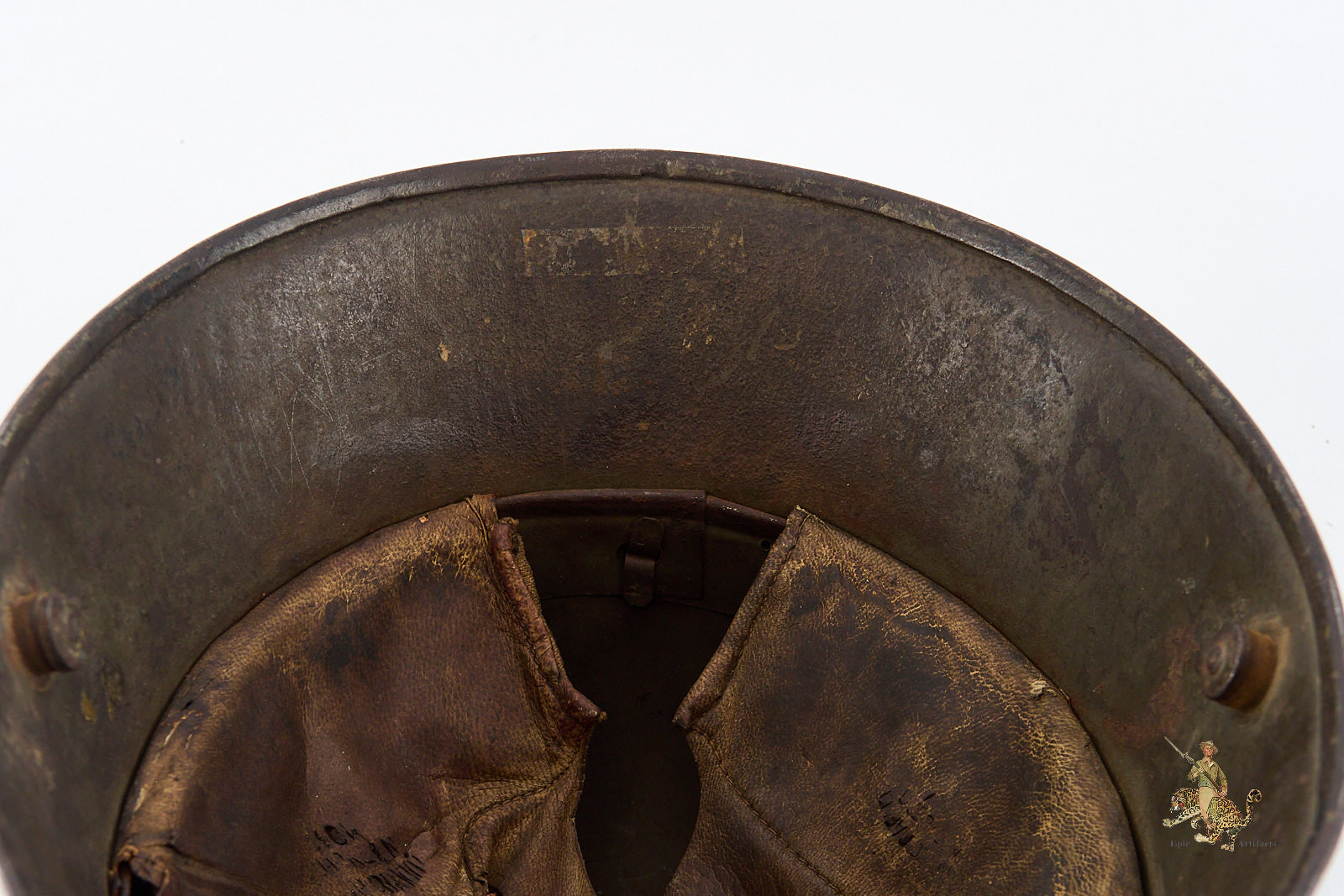 The helmet is fitted with its original three-piece leather liner, as illustrated, and retains a firmly intact steel liner band with the dust ring present beneath. The chinstrap is absent. An impressive and well-preserved example of a Heer M16 Camo Helmet – ET64, offering both visual appeal and historical significance for the advanced World War I helmet collector.