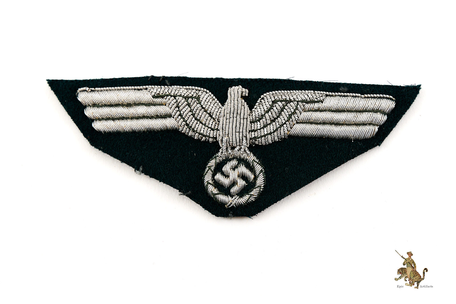 Historical Description: The German Armed Forces (Wehrmacht), as formed in 1935, and as they existed until the end of World War 2, consisted of the Army (Heer), the Air Force (Luftwaffe) and the Navy (Kriegsmarine). The Waffen-SS fell under the command of the Wehrmacht during the war. Each of these branches of service had a unique eagle design that was worn on both the formal dress and parade uniforms, and the field uniforms, of the members of that branch. These eagles were worn on soft headgear, including service and field caps, as well as on the uniform jacket. In the Heer, the Luftwaffe, and the Kriegsmarine, this eagle was worn on the chest of the tunic; collectors have termed these “breast eagles.” The Heer and the Luftwaffe generally used the same eagle style, though variations in color of the eagle or the backing distinguish between the two. The Luftwaffe used their own flying eagle emblem. The Waffen-SS sleeve eagle (and cap eagle) had wings that came to a distinctive tapered point. The cap, breast and sleeve eagles used by the various military branches were manufactured in many variations. There were machine-woven and machine embroidered versions, usually used by officers and NCOs. Hand-embroidered bullion wire eagles were typically for officers. There were metal eagles, for caps, or for uniforms that were intended to have detachable insignia. There were even eagles embroidered on camouflage fabric, intended for use on special field uniforms. There were also eagles in specific colors for use on tropical uniforms. Some of these eagles were mass-produced and are still common today. Others were, and are, very rare.