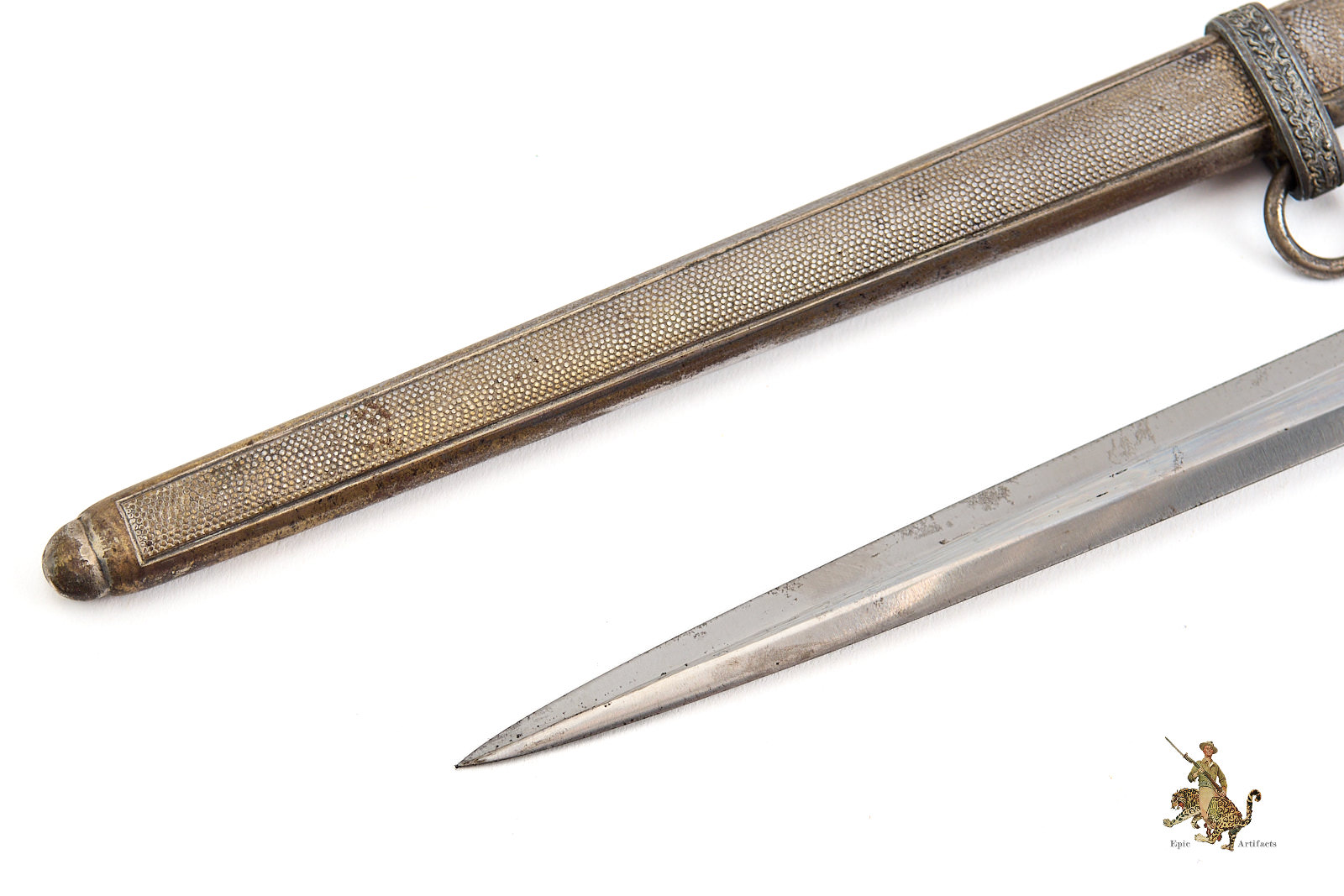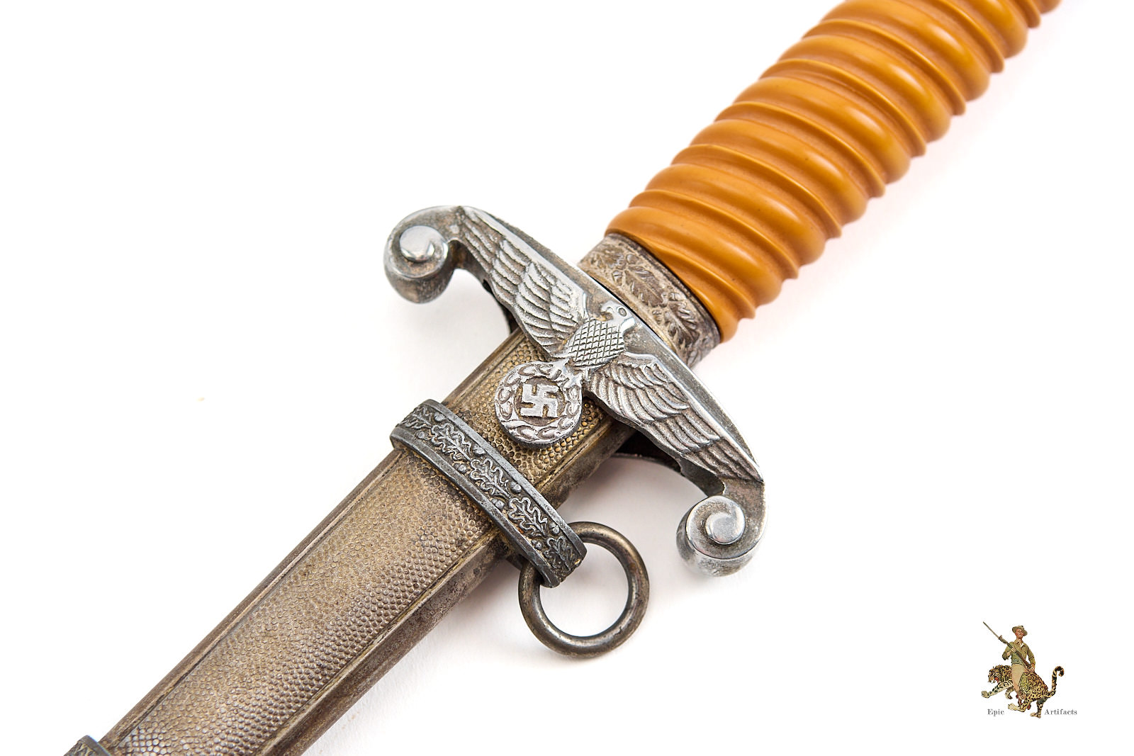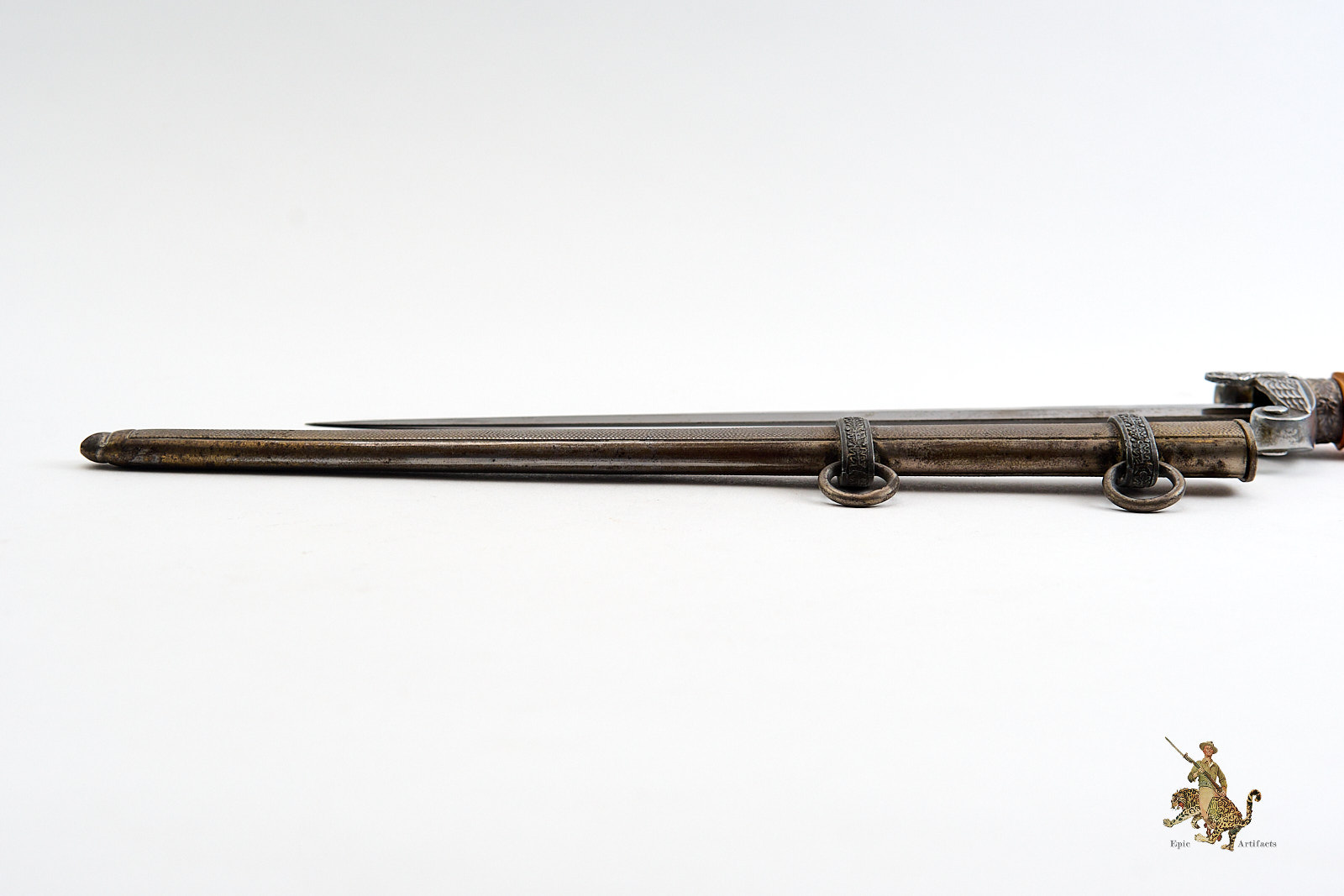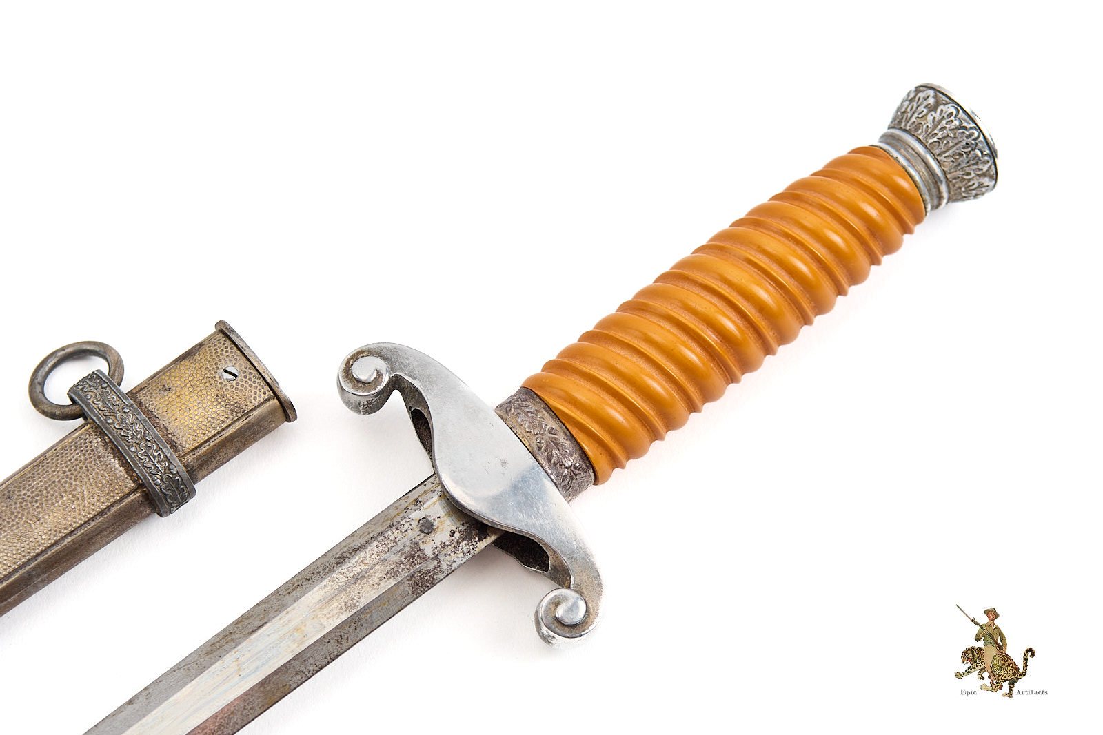 Historical Description: After WWI, the German military, known as the Reichswehr, was restricted to a relatively small force. Hitler changed this in 1935, reintroducing universal military conscription, and creating a new German Armed Forces- the Wehrmacht. Within the Wehrmacht, the German Army was known as the Heer, and a new dagger was designed and introduced for the officers of this new German Army in May 1935. As with all German Army officer uniforms and accoutrements, they were not issued; rather, the officer had to purchase them. These were ceremonial and decorative pieces of regalia, that were worn on occasions that did not call for carrying a sword. The overall pattern and design of the dagger remained consistent throughout the production run, but the large number of individual manufacturers created a wide variety in detail, especially regarding the handle fittings. There were approximately 42 different manufacturers of the blades. There were construction changes over time as well. Early German Army daggers generally featured plated brass alloy handle fittings. Later, zinc was used. Wartime type scabbards were generally unplated, with a gray finish. Production of German Army daggers ceased around 1943. The German Army was a huge organization, and large numbers of these daggers were produced. But there were many specific variants that were produced in low numbers, especially the highest quality, luxury type pieces for well-heeled officers. Some daggers were personalized, and customized, and are unique. The striking and attractive design of the German Army dagger was well-received by officers at the time, and these are very sought-after by collectors today.