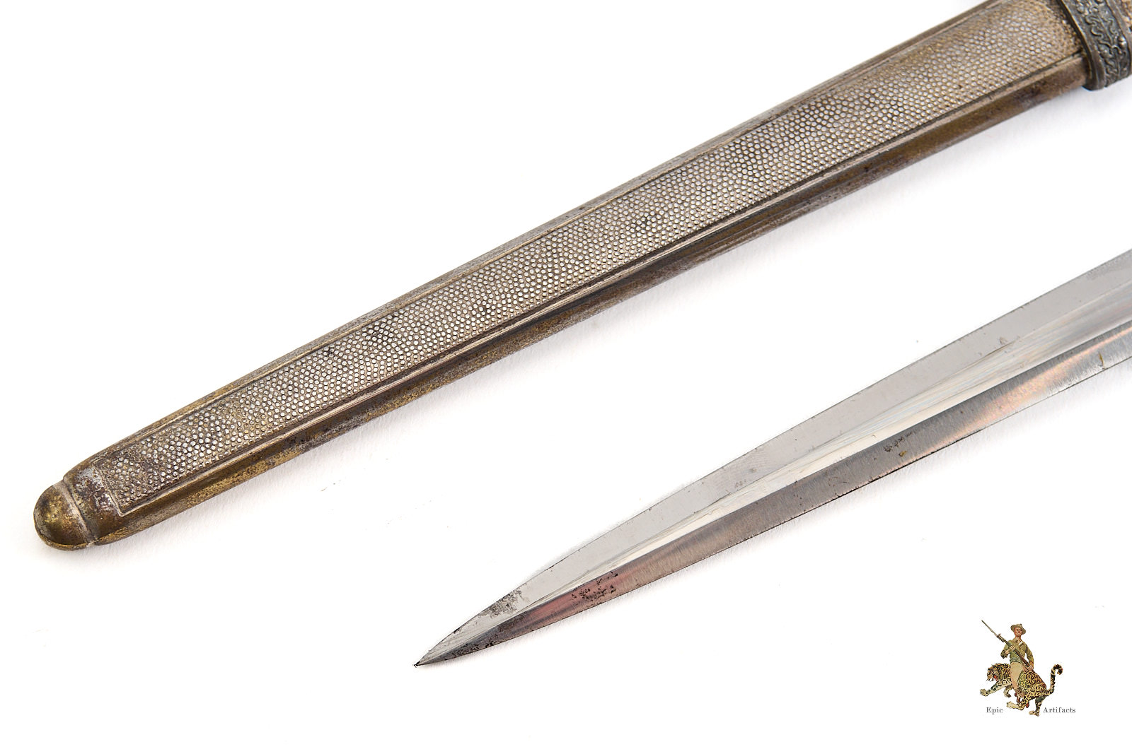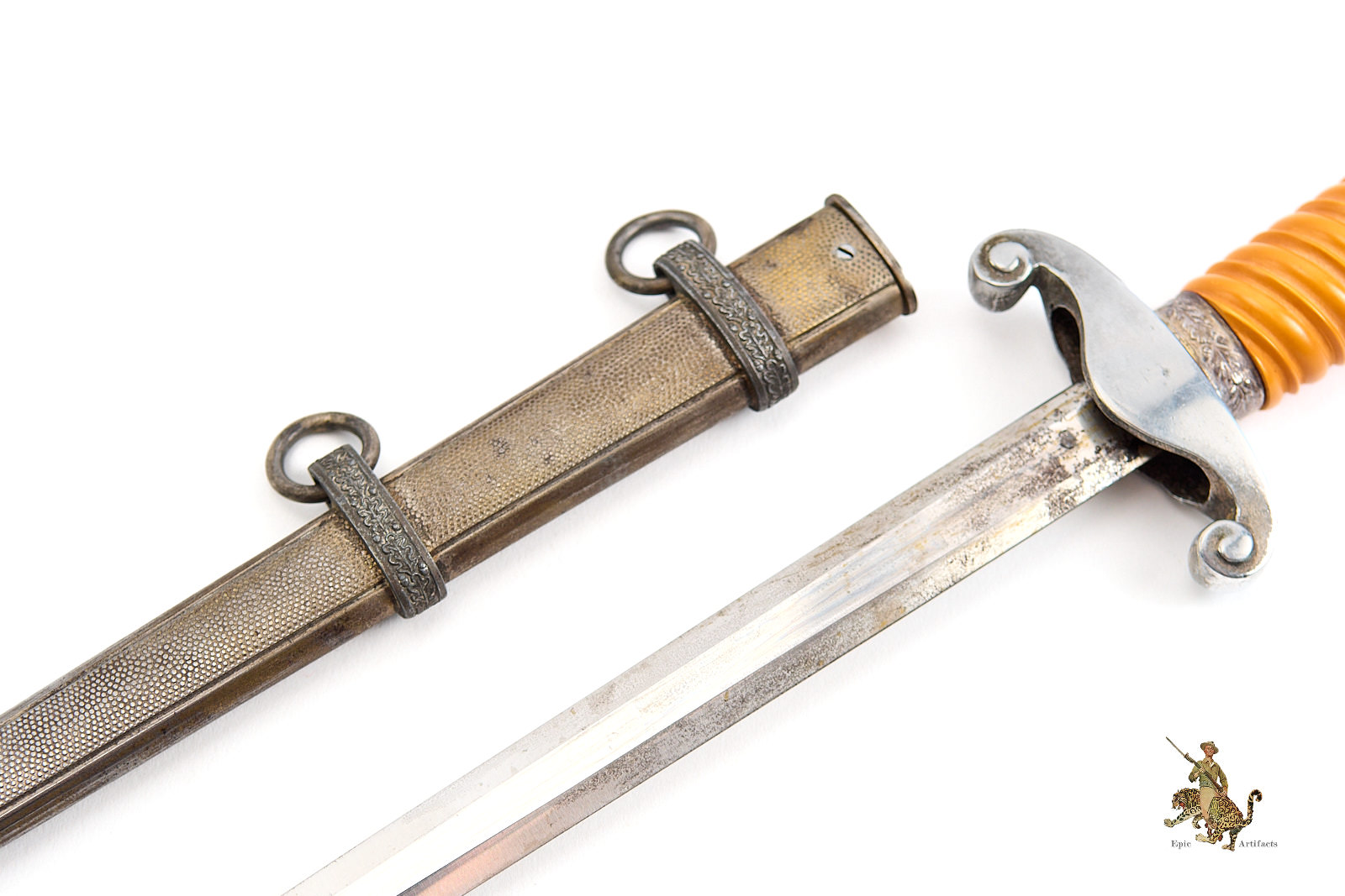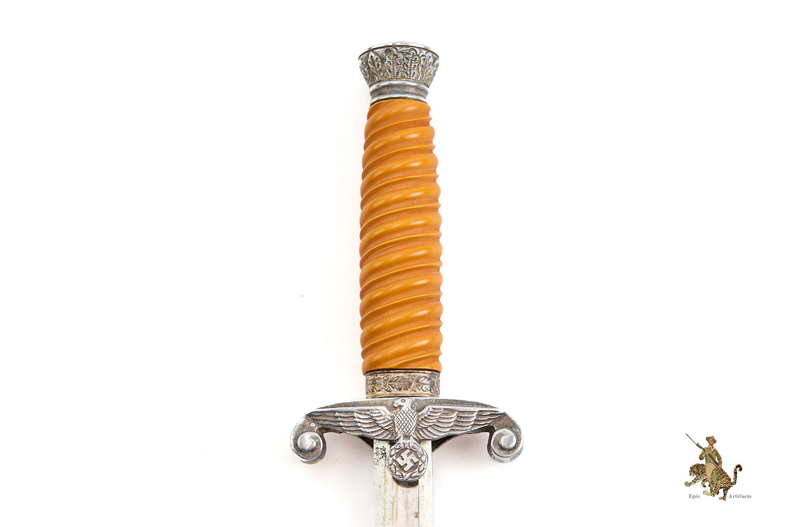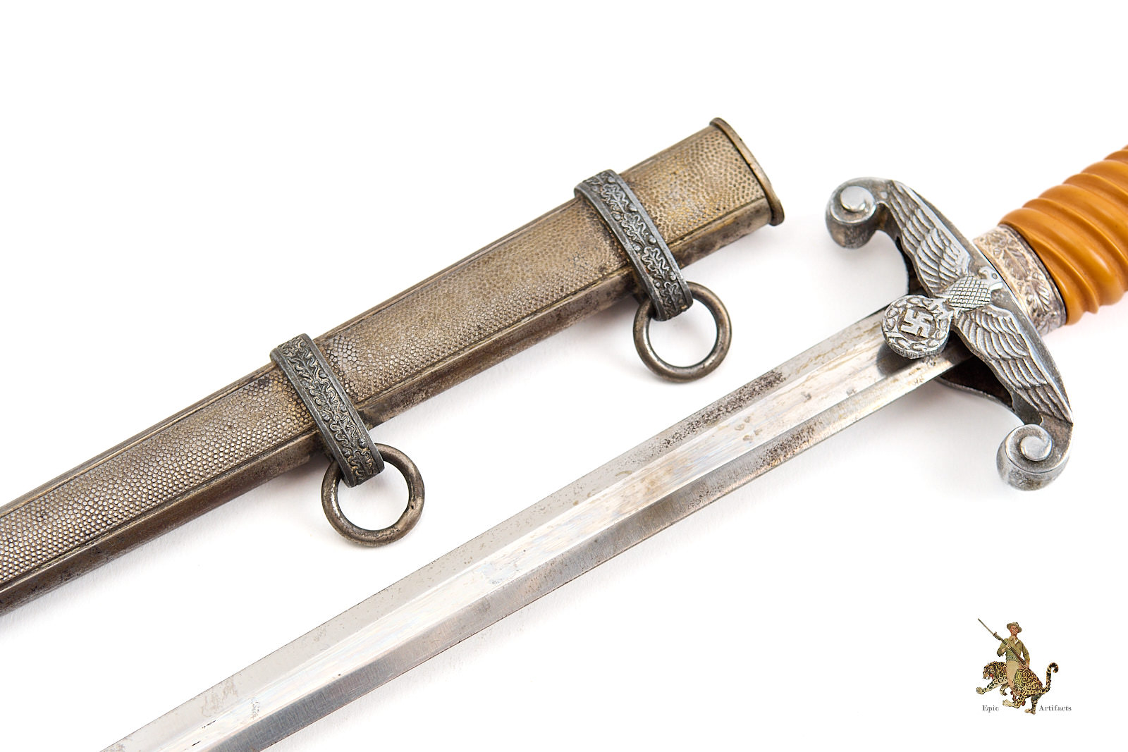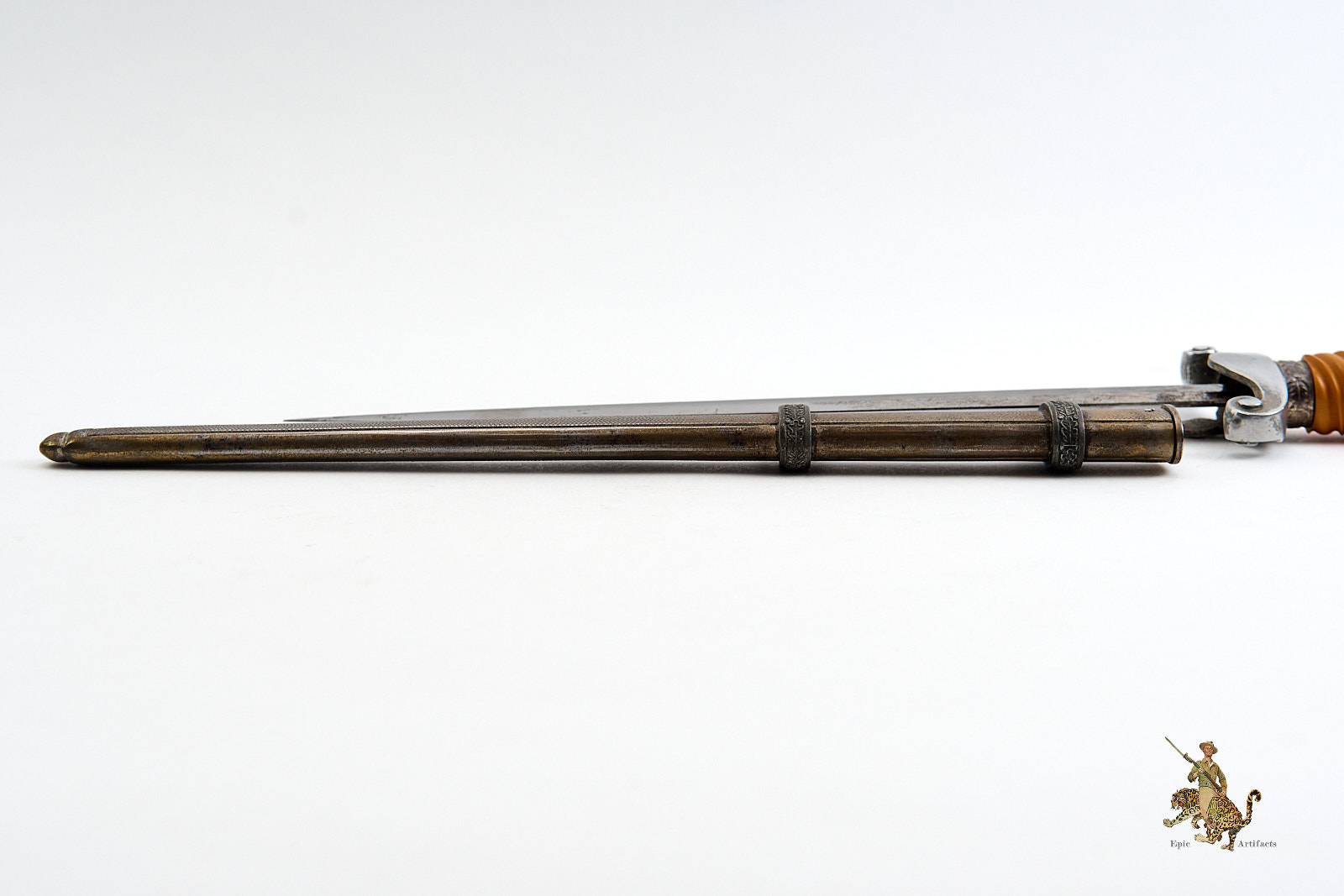 Historical Description: After WWI, the German military, known as the Reichswehr, was restricted to a relatively small force. Hitler changed this in 1935, reintroducing universal military conscription, and creating a new German Armed Forces- the Wehrmacht. Within the Wehrmacht, the German Army was known as the Heer, and a new dagger was designed and introduced for the officers of this new German Army in May 1935. As with all German Army officer uniforms and accoutrements, they were not issued; rather, the officer had to purchase them. These were ceremonial and decorative pieces of regalia, that were worn on occasions that did not call for carrying a sword. The overall pattern and design of the dagger remained consistent throughout the production run, but the large number of individual manufacturers created a wide variety in detail, especially regarding the handle fittings. There were approximately 42 different manufacturers of the blades. There were construction changes over time as well. Early German Army daggers generally featured plated brass alloy handle fittings. Later, zinc was used. Wartime type scabbards were generally unplated, with a gray finish. Production of German Army daggers ceased around 1943. The German Army was a huge organization, and large numbers of these daggers were produced. But there were many specific variants that were produced in low numbers, especially the highest quality, luxury type pieces for well-heeled officers. Some daggers were personalized, and customized, and are unique. The striking and attractive design of the German Army dagger was well-received by officers at the time, and these are very sought-after by collectors today.