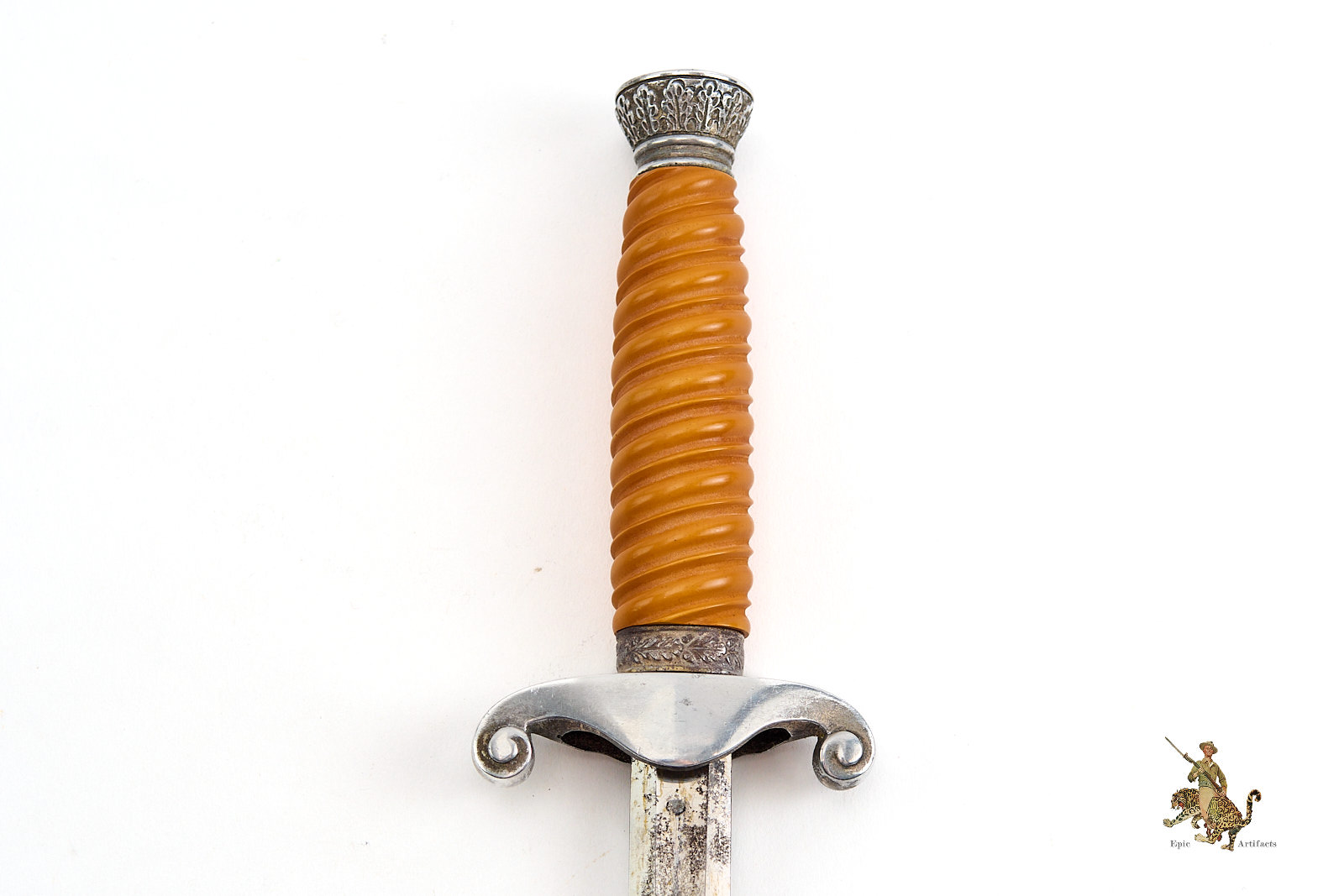 Product Description:  This Heer Officer Dagger is a fine example exhibiting attractive cross-graining to the unmarked blade, with minor runner marks and light corrosion near the guard. The trylon grip displays a pleasing mid-pumpkin tone, complemented by a well-preserved guard and pommel showing only light wear and subtle oxidation consistent with age. Overall, the dagger presents in excellent condition, reflecting careful handling and preservation.