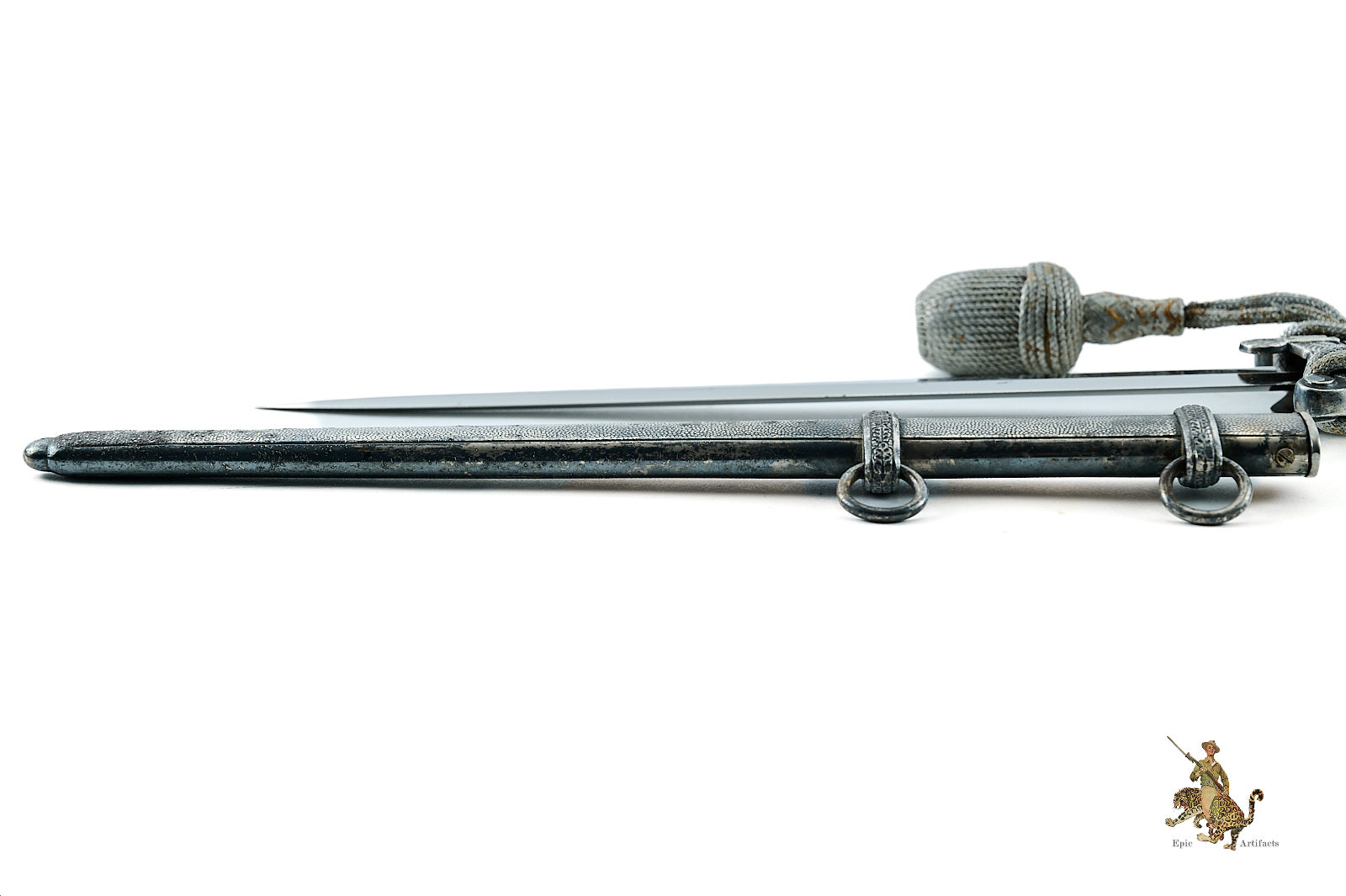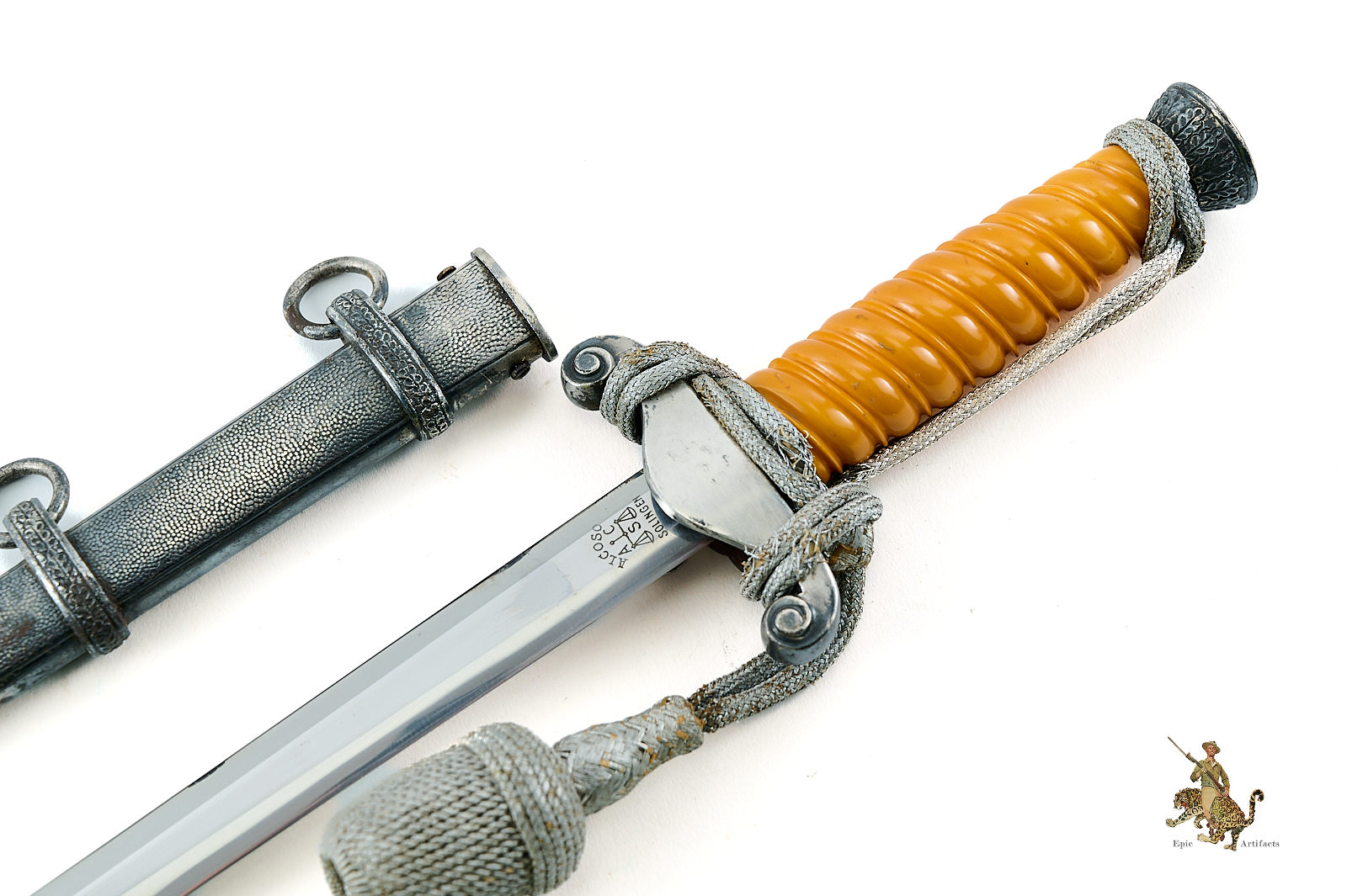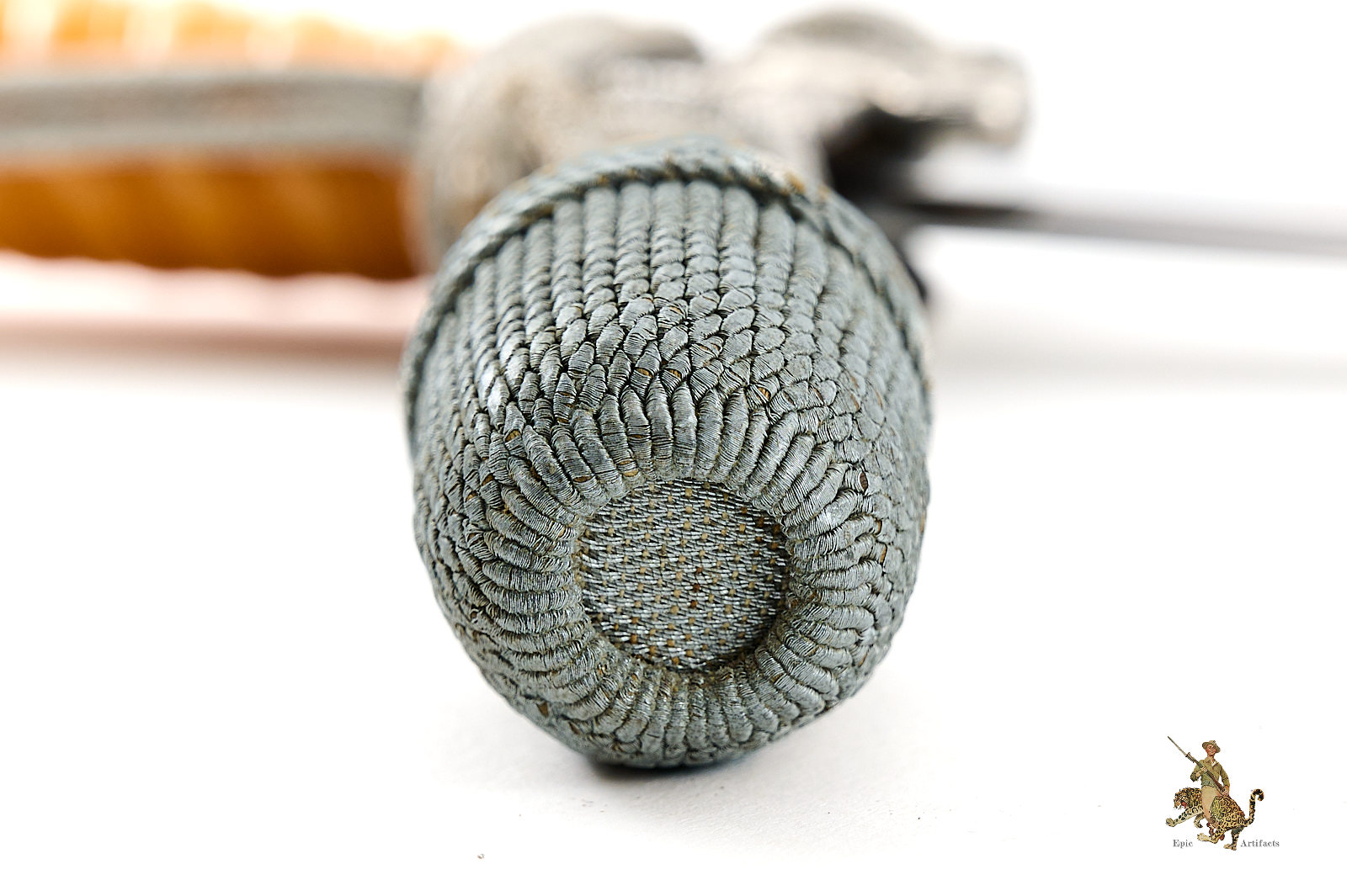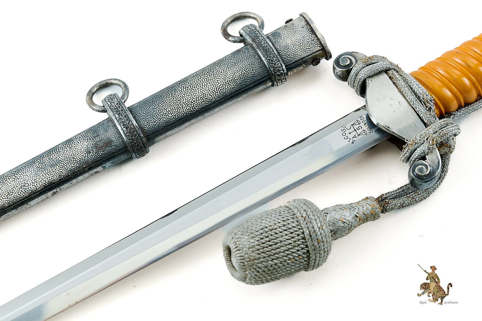 Historical Description: After WWI, the German military, known as the Reichswehr, was restricted to a relatively small force. Hitler changed this in 1935, reintroducing universal military conscription, and creating a new German Armed Forces- the Wehrmacht. Within the Wehrmacht, the German Army was known as the Heer, and a new dagger was designed and introduced for the officers of this new German Army in May 1935. As with all German Army officer uniforms and accoutrements, they were not issued; rather, the officer had to purchase them. These were ceremonial and decorative pieces of regalia, that were worn on occasions that did not call for carrying a sword. The overall pattern and design of the dagger remained consistent throughout the production run, but the large number of individual manufacturers created a wide variety in detail, especially regarding the handle fittings. There were approximately 42 different manufacturers of the blades. There were construction changes over time as well. Early German Army daggers generally featured plated brass alloy handle fittings. Later, zinc was used. Wartime type scabbards were generally unplated, with a gray finish. Production of German Army daggers ceased around 1943. The German Army was a huge organization, and large numbers of these daggers were produced. But there were many specific variants that were produced in low numbers, especially the highest quality, luxury type pieces for well-heeled officers. Some daggers were personalized, and customized, and are unique. The striking and attractive design of the German Army dagger was well-received by officers at the time, and these are very sought-after by collectors today.