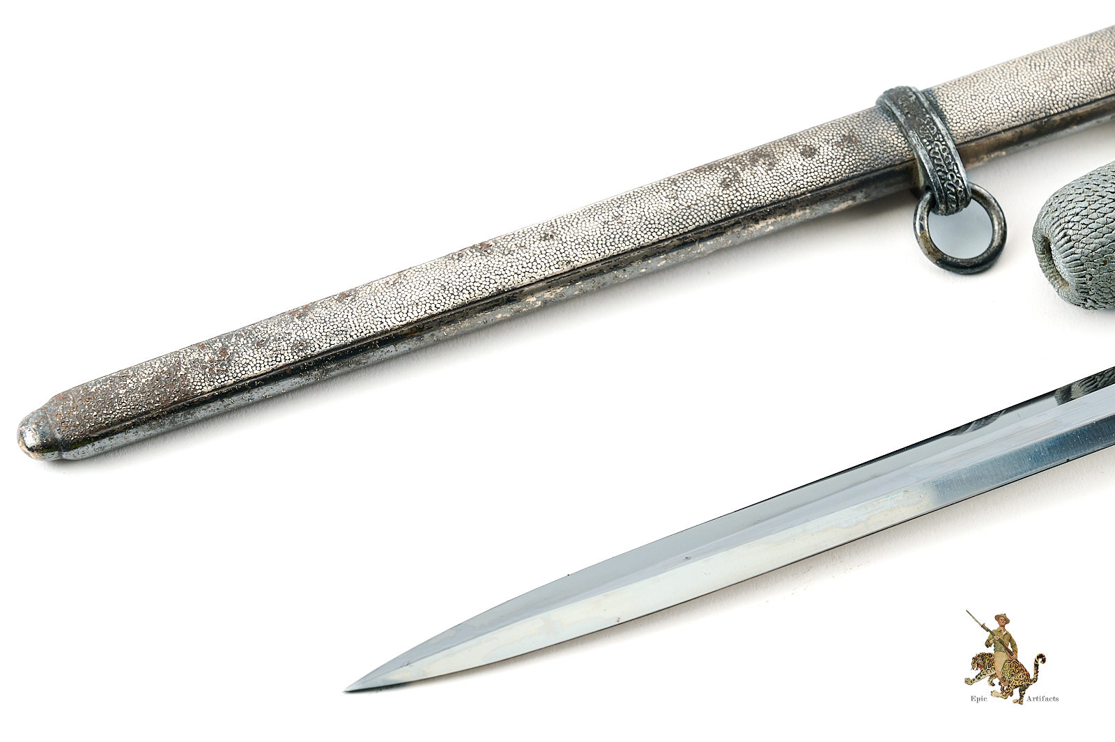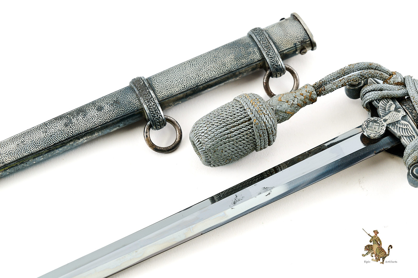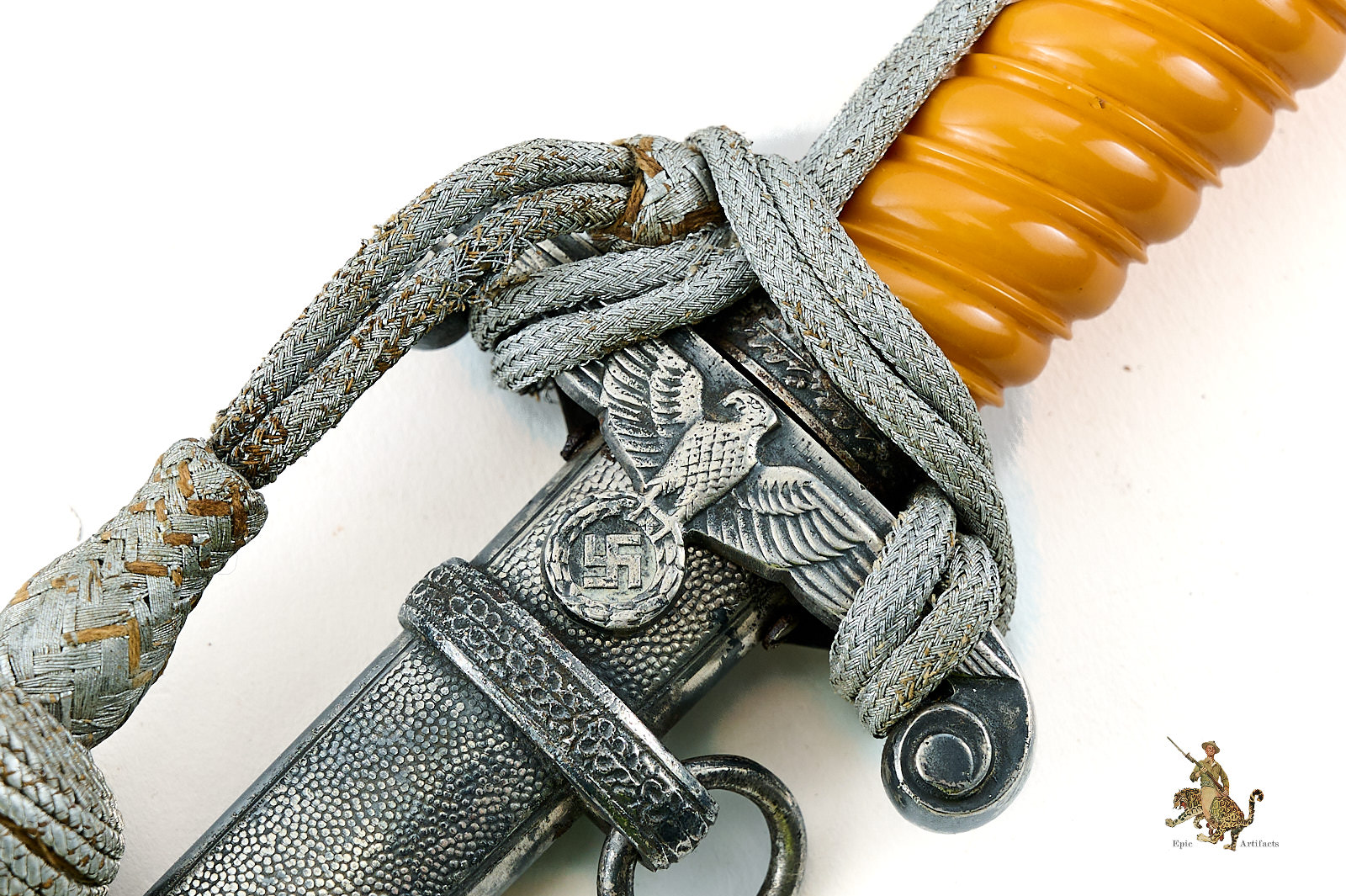 Historical Description: After WWI, the German military, known as the Reichswehr, was restricted to a relatively small force. Hitler changed this in 1935, reintroducing universal military conscription, and creating a new German Armed Forces- the Wehrmacht. Within the Wehrmacht, the German Army was known as the Heer, and a new dagger was designed and introduced for the officers of this new German Army in May 1935. As with all German Army officer uniforms and accoutrements, they were not issued; rather, the officer had to purchase them. These were ceremonial and decorative pieces of regalia, that were worn on occasions that did not call for carrying a sword. The overall pattern and design of the dagger remained consistent throughout the production run, but the large number of individual manufacturers created a wide variety in detail, especially regarding the handle fittings. There were approximately 42 different manufacturers of the blades. There were construction changes over time as well. Early German Army daggers generally featured plated brass alloy handle fittings. Later, zinc was used. Wartime type scabbards were generally unplated, with a gray finish. Production of German Army daggers ceased around 1943. The German Army was a huge organization, and large numbers of these daggers were produced. But there were many specific variants that were produced in low numbers, especially the highest quality, luxury type pieces for well-heeled officers. Some daggers were personalized, and customized, and are unique. The striking and attractive design of the German Army dagger was well-received by officers at the time, and these are very sought-after by collectors today.