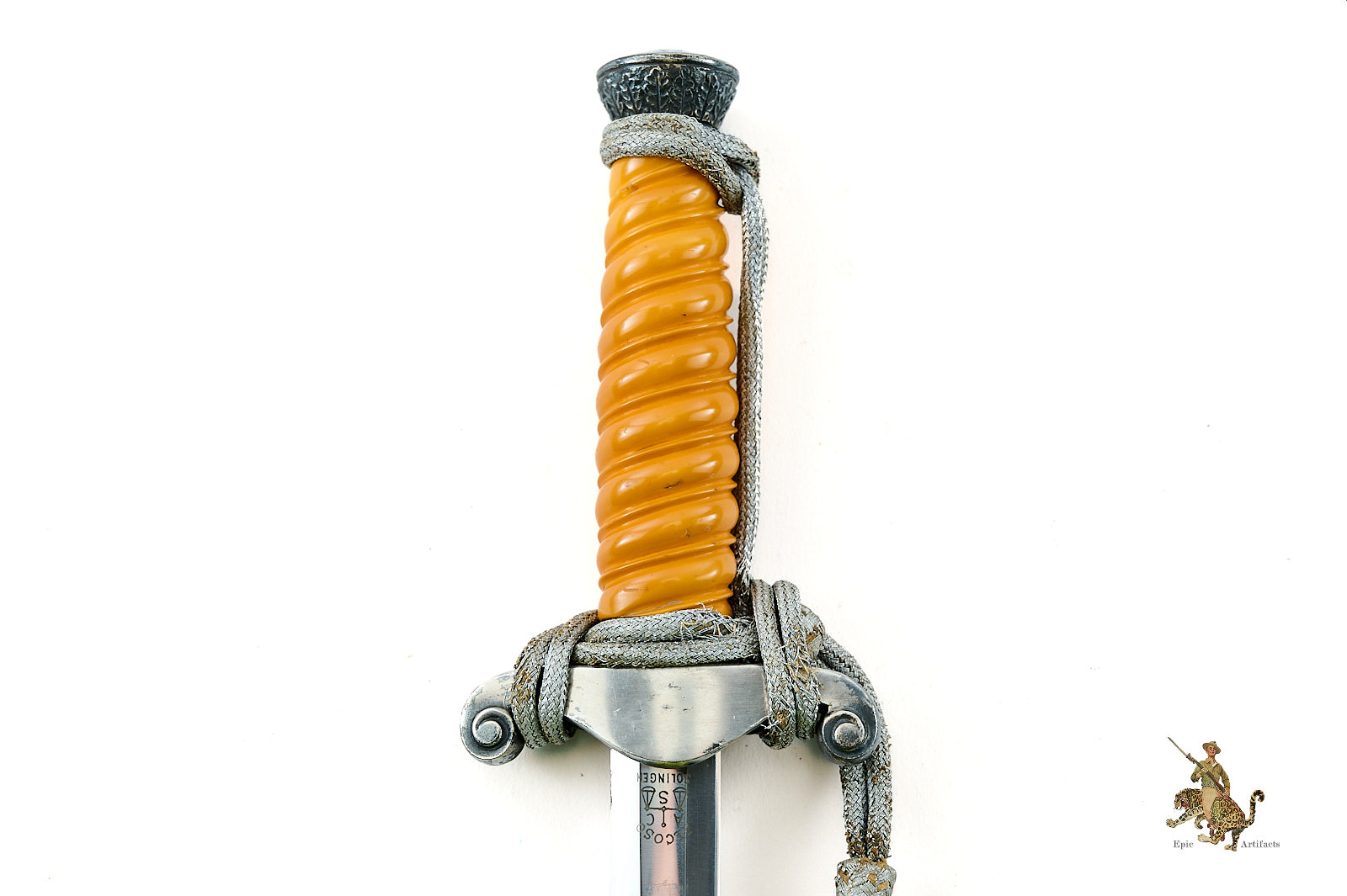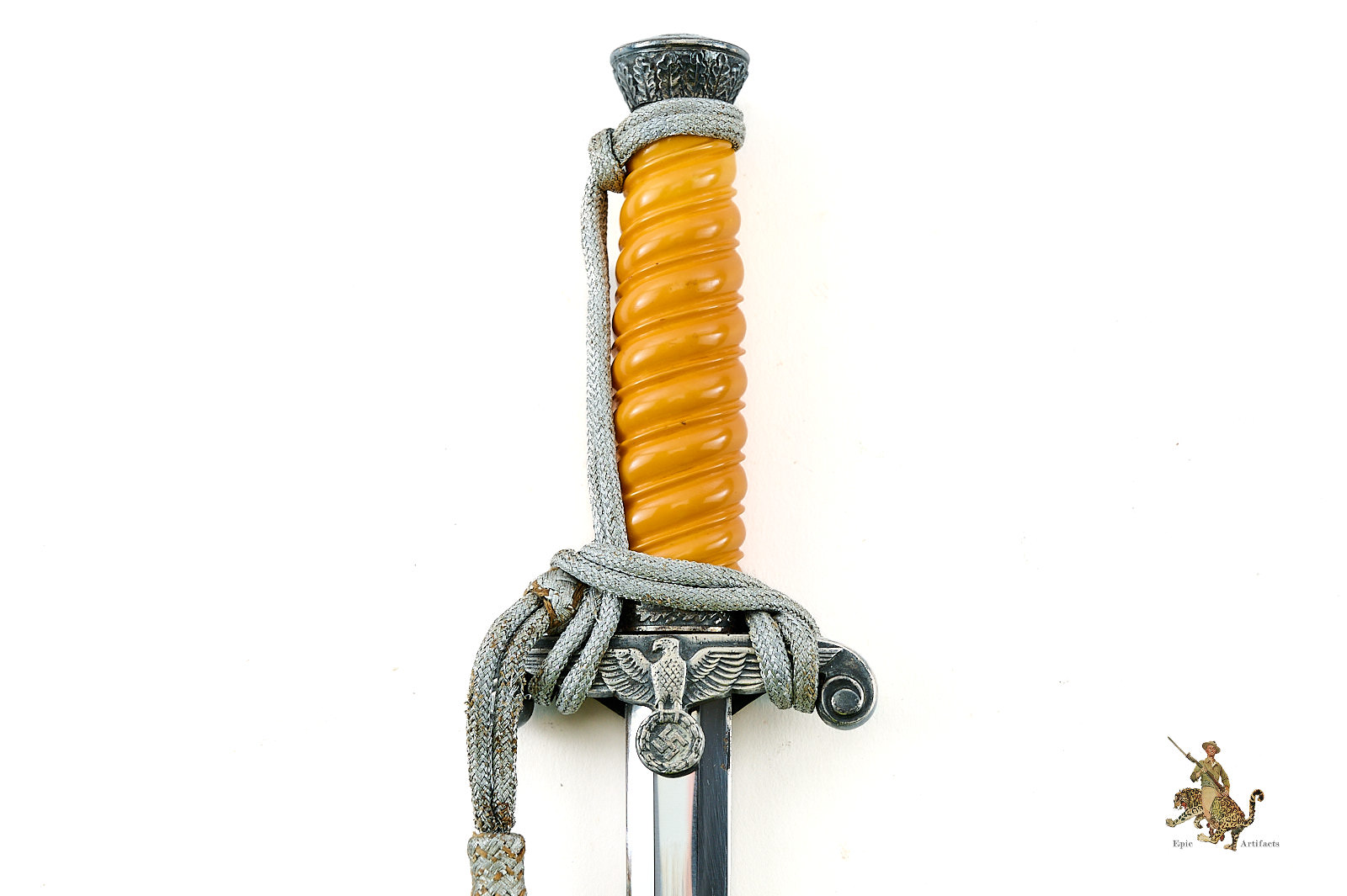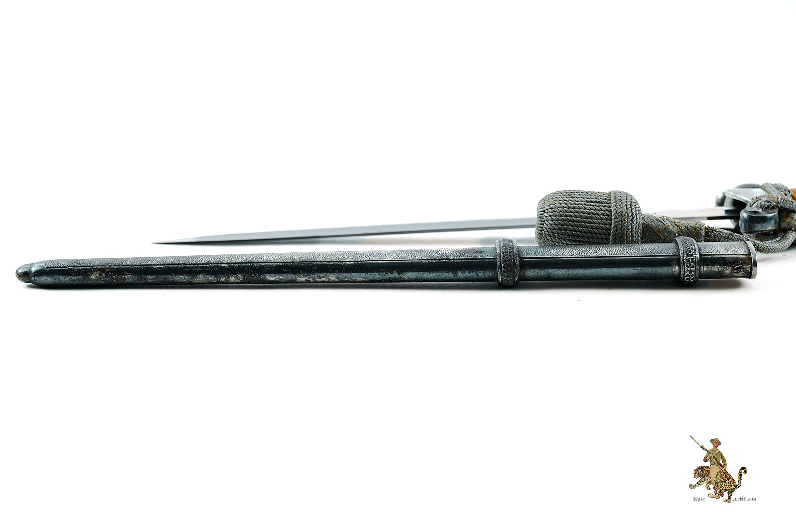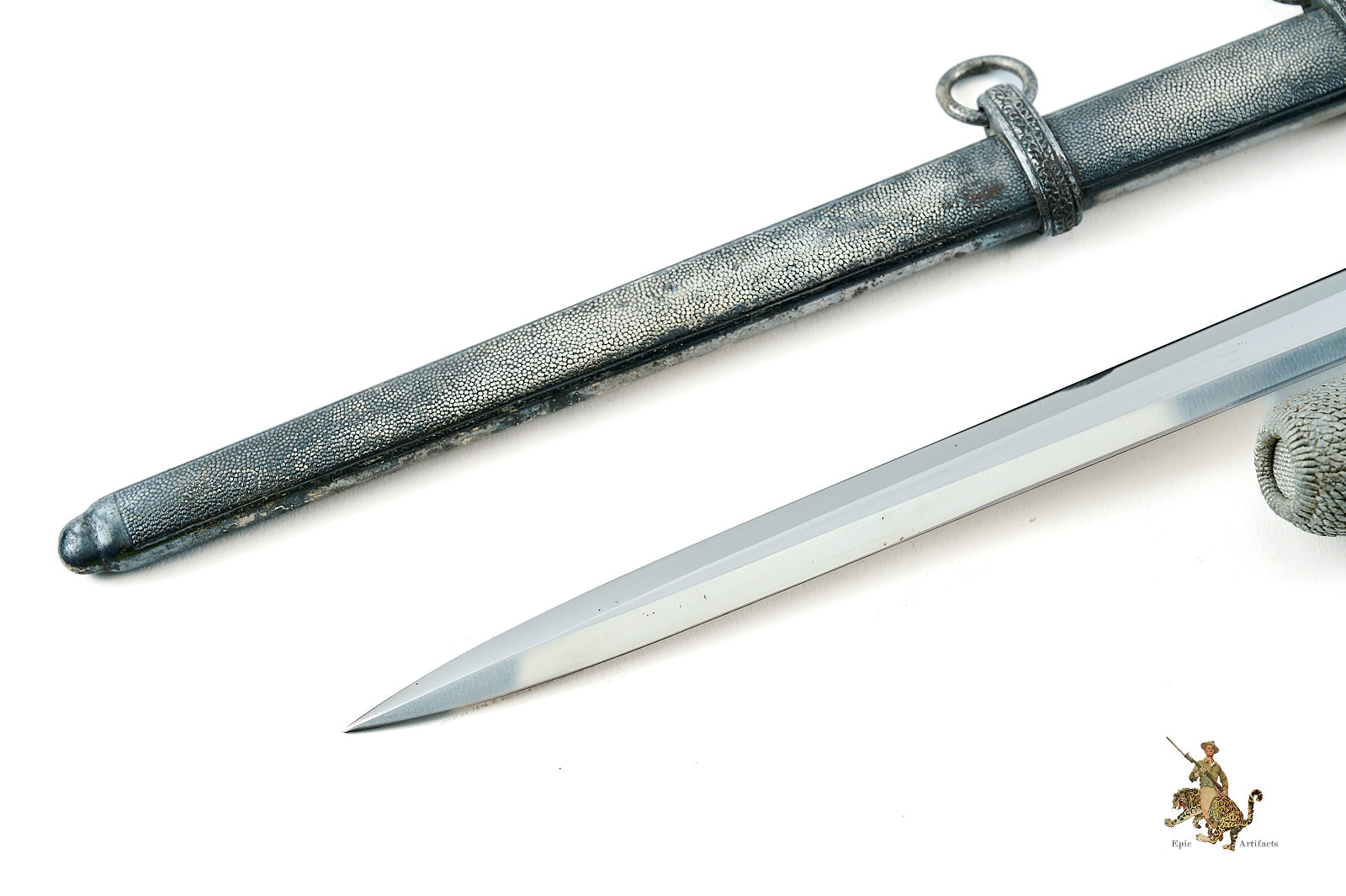 Historical Description: After WWI, the German military, known as the Reichswehr, was restricted to a relatively small force. Hitler changed this in 1935, reintroducing universal military conscription, and creating a new German Armed Forces- the Wehrmacht. Within the Wehrmacht, the German Army was known as the Heer, and a new dagger was designed and introduced for the officers of this new German Army in May 1935. As with all German Army officer uniforms and accoutrements, they were not issued; rather, the officer had to purchase them. These were ceremonial and decorative pieces of regalia, that were worn on occasions that did not call for carrying a sword. The overall pattern and design of the dagger remained consistent throughout the production run, but the large number of individual manufacturers created a wide variety in detail, especially regarding the handle fittings. There were approximately 42 different manufacturers of the blades. There were construction changes over time as well. Early German Army daggers generally featured plated brass alloy handle fittings. Later, zinc was used. Wartime type scabbards were generally unplated, with a gray finish. Production of German Army daggers ceased around 1943. The German Army was a huge organization, and large numbers of these daggers were produced. But there were many specific variants that were produced in low numbers, especially the highest quality, luxury type pieces for well-heeled officers. Some daggers were personalized, and customized, and are unique. The striking and attractive design of the German Army dagger was well-received by officers at the time, and these are very sought-after by collectors today.