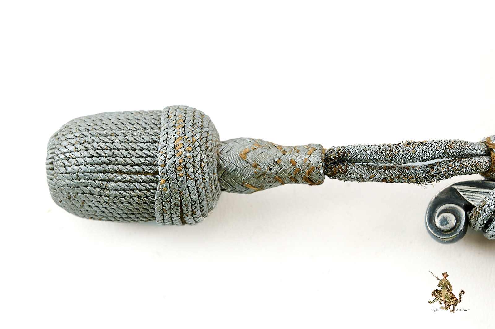 The dagger is complete with its original portepee, which displays period wear and some fraying, enhancing the authenticity and visual character of the piece.