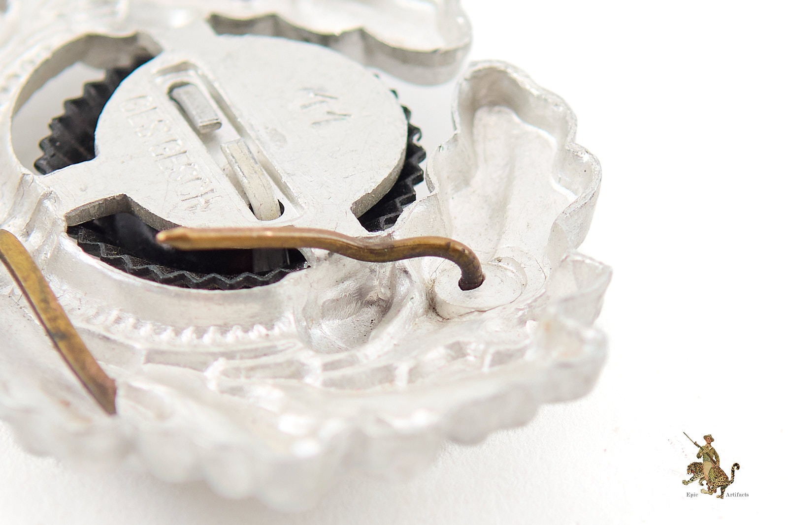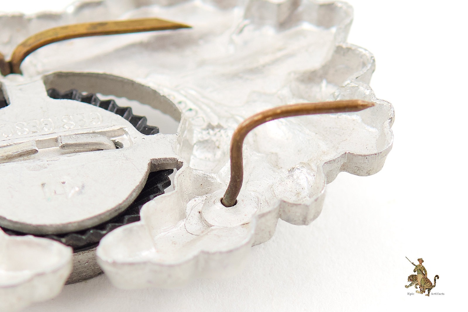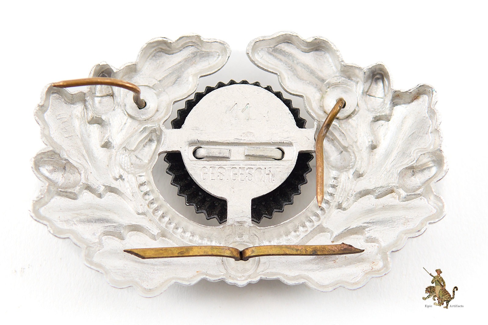Product Description: This Heer Officer Visor Cockade Insignia is a nice original Wehrmacht officer’s visor cap cockade, die-struck in aluminum with a crisp maker’s mark “11” to the reverse. This finely detailed example features the classic oak-leaf wreath design with a vivid red felt center, symbolic of national loyalty and military tradition. Retaining all four original prongs in perfect working order, the piece remains in excellent+ condition, with clean lines, minimal handling wear, and strong original finish. A superb example of mid-war German officer regalia, notable for its quality construction and preservation.