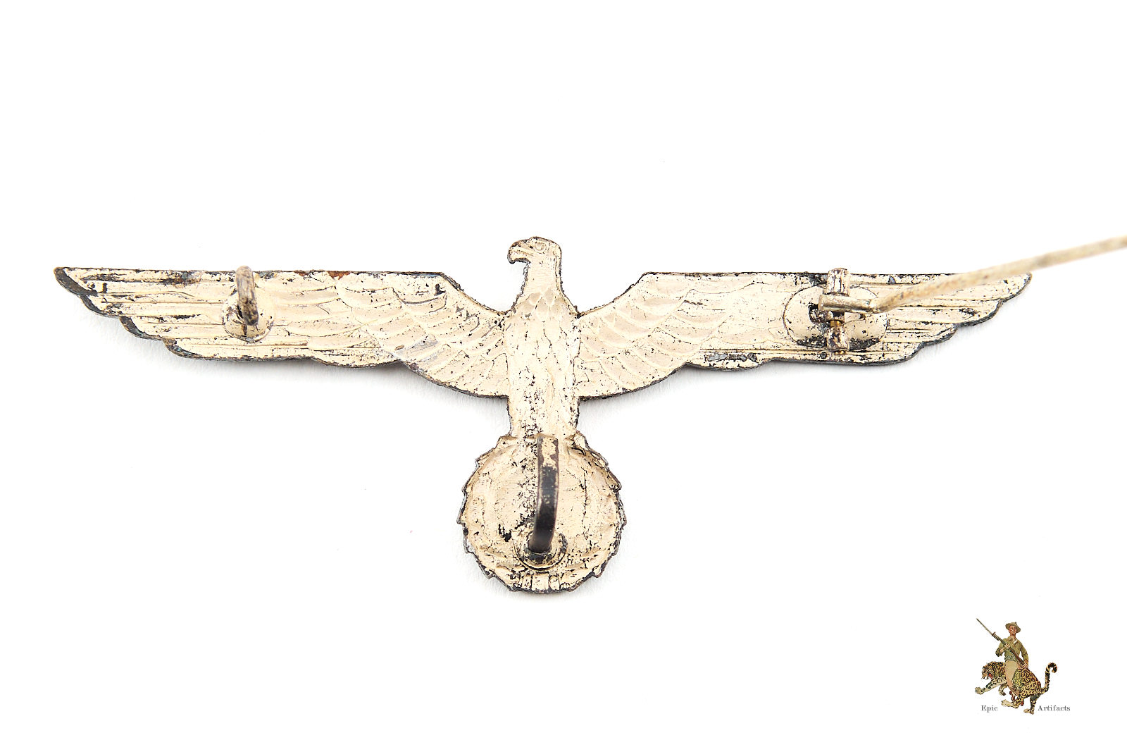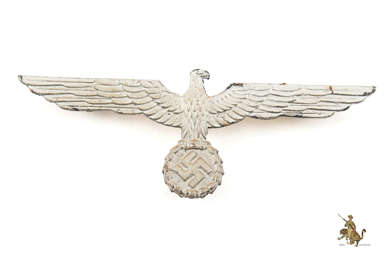 Historical Description: The German Armed Forces (Wehrmacht), as formed in 1935, and as they existed until the end of World War 2, consisted of the Army (Heer), the Air Force (Luftwaffe) and the Navy (Kriegsmarine). The Waffen-SS fell under the command of the Wehrmacht during the war. Each of these branches of service had a unique eagle design that was worn on both the formal dress and parade uniforms, and the field uniforms, of the members of that branch. These eagles were worn on soft headgear, including service and field caps, as well as on the uniform jacket. In the Heer, the Luftwaffe, and the Kriegsmarine, this eagle was worn on the chest of the tunic; collectors have termed these “breast eagles.” The Heer and the Luftwaffe generally used the same eagle style, though variations in color of the eagle or the backing distinguish between the two. The Luftwaffe used their own flying eagle emblem. The Waffen-SS sleeve eagle (and cap eagle) had wings that came to a distinctive tapered point. The cap, breast and sleeve eagles used by the various military branches were manufactured in many variations. There were machine-woven and machine embroidered versions, usually used by officers and NCOs. Hand-embroidered bullion wire eagles were typically for officers. There were metal eagles, for caps, or for uniforms that were intended to have detachable insignia. There were even eagles embroidered on camouflage fabric, intended for use on special field uniforms. There were also eagles in specific colors for use on tropical uniforms. Some of these eagles were mass-produced and are still common today. Others were, and are, very rare.