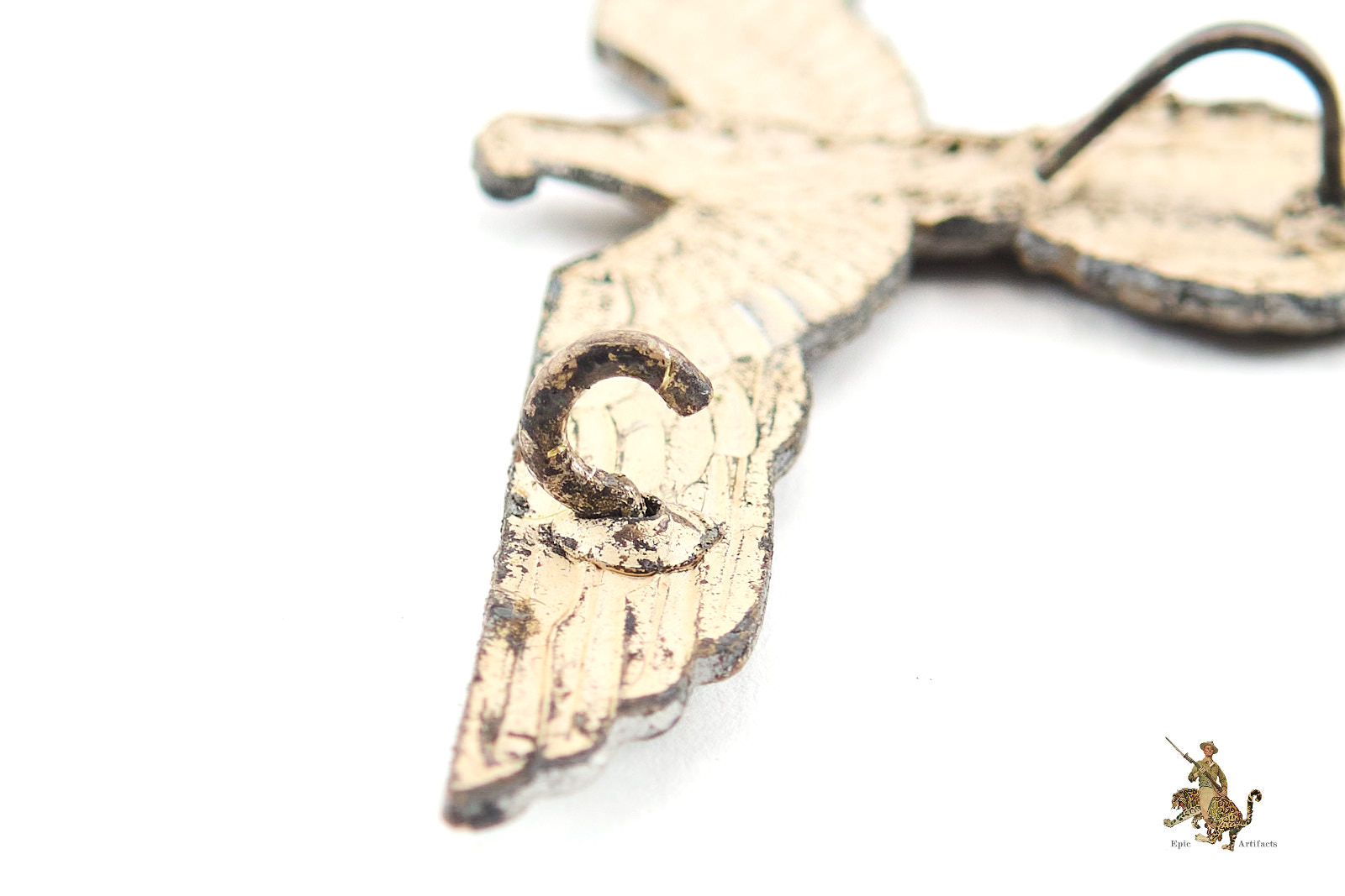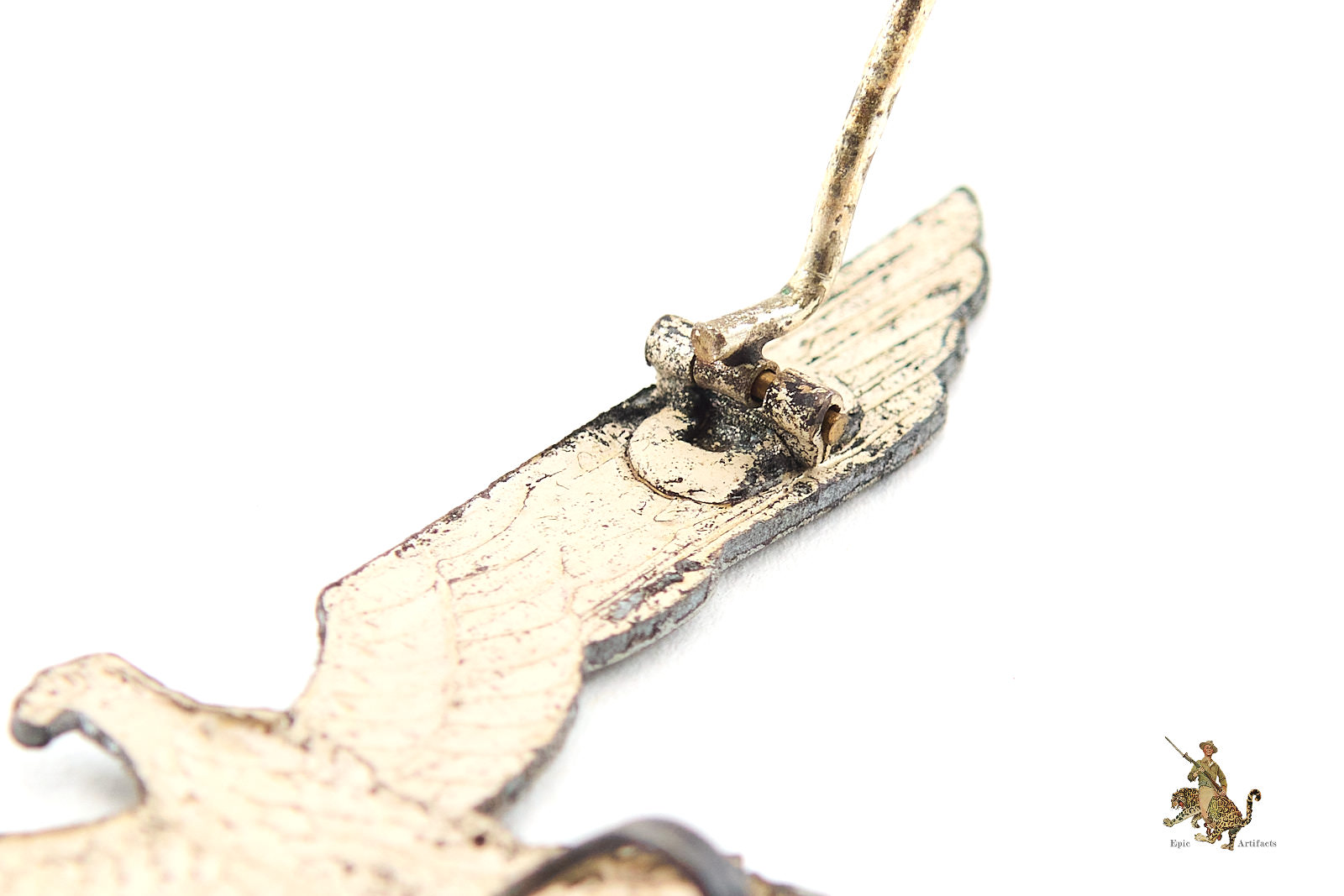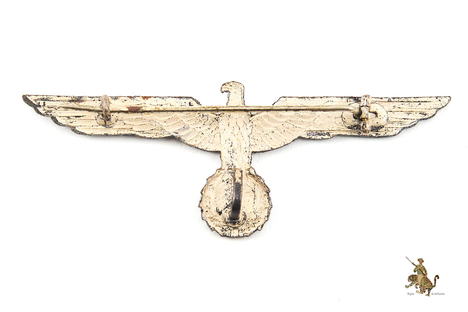 The reverse retains its original hinge and round-wire “C” catch, both fully functional, and importantly still includes the lower securing tab—an element frequently lost on worn examples. Though unmarked, the workmanship aligns closely with recognized wartime production standards. An appealing, complete, and highly collectible Heer Officer Breast Eagle – Summer, offered here in excellent condition.