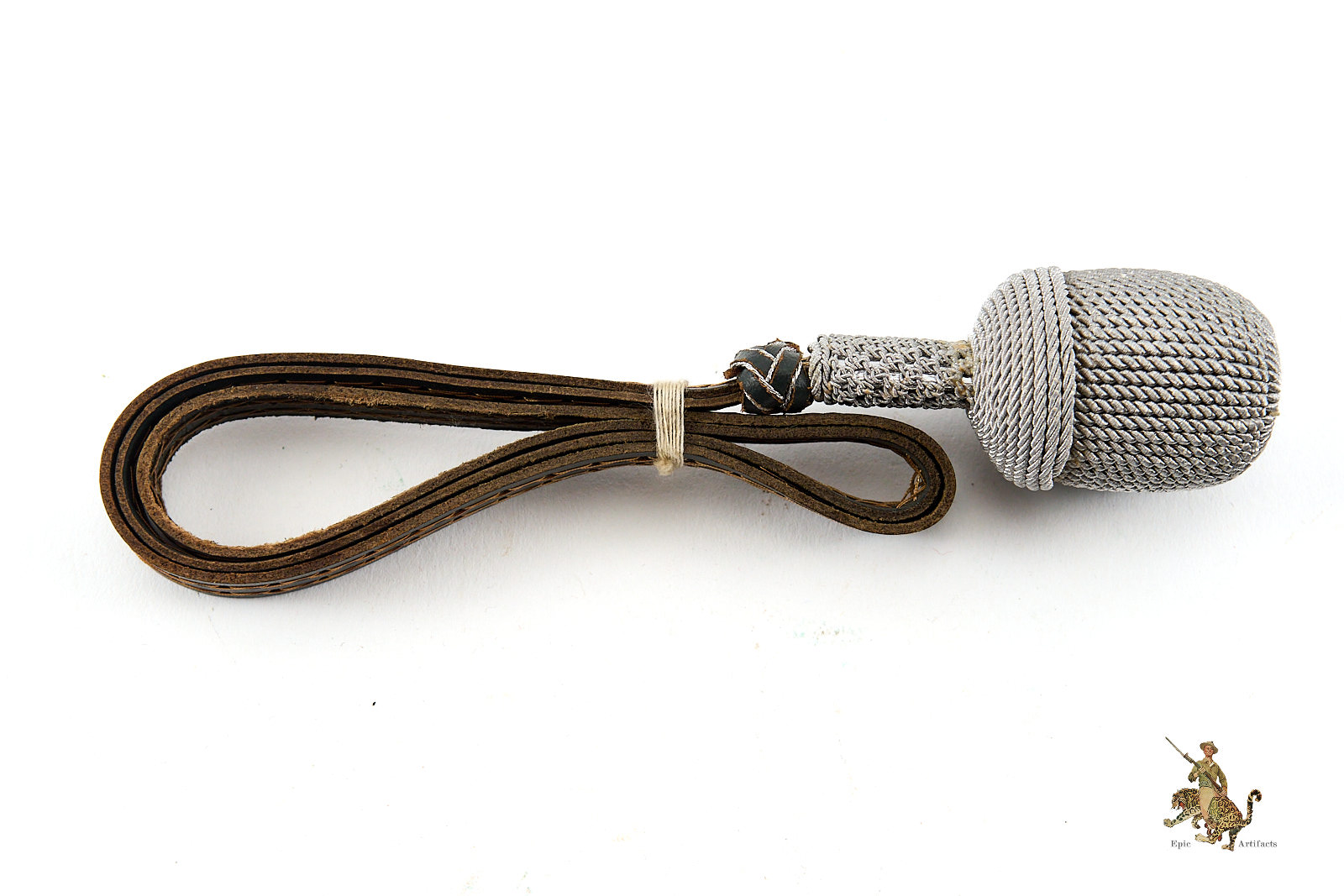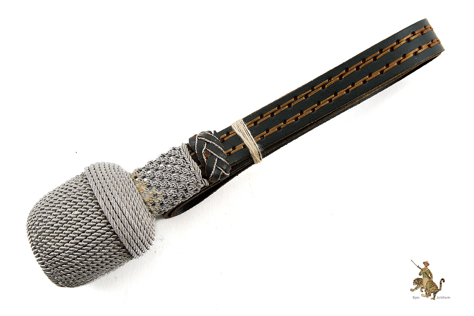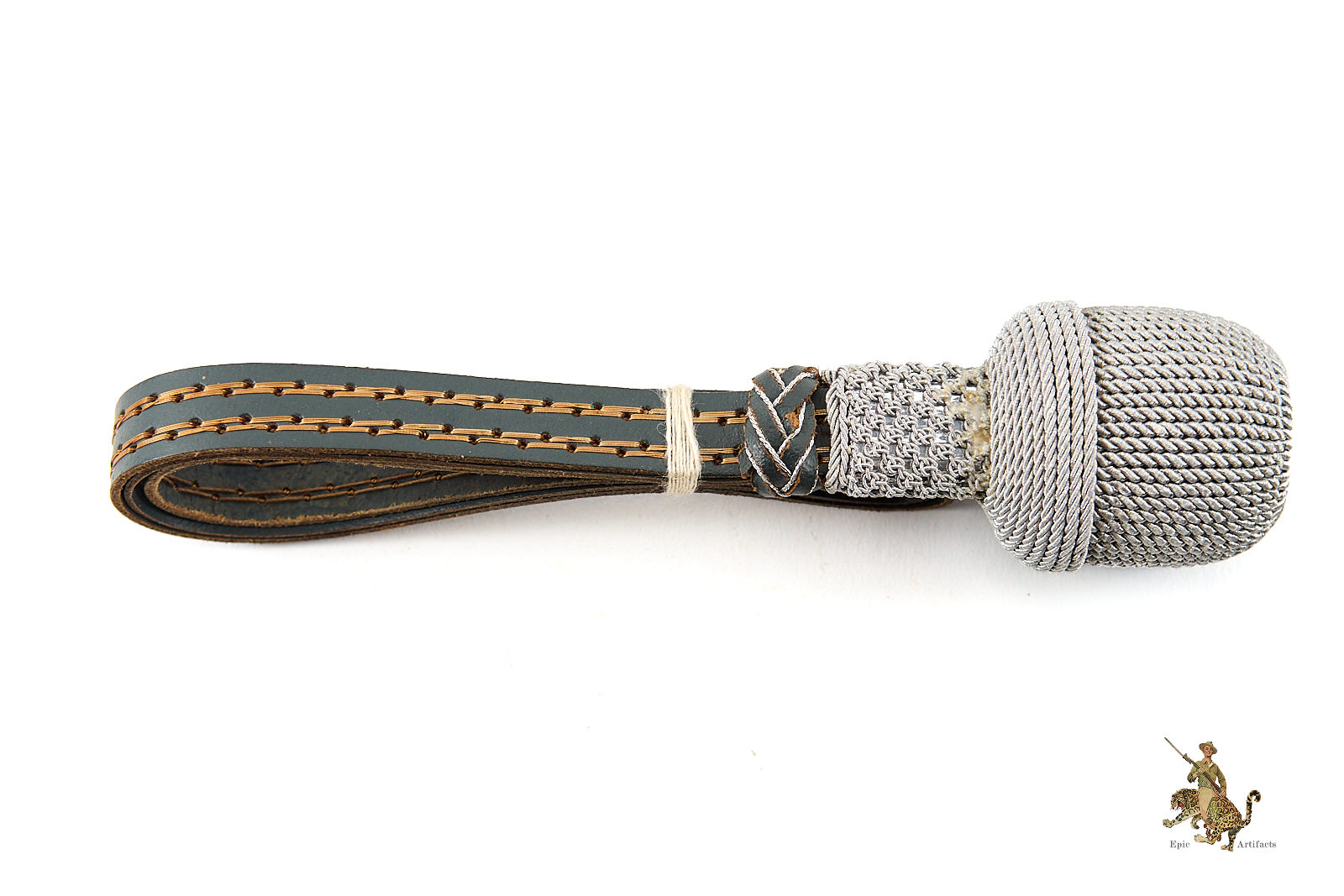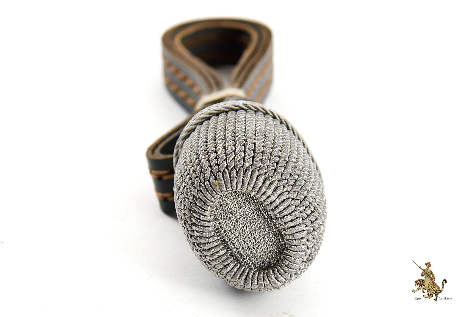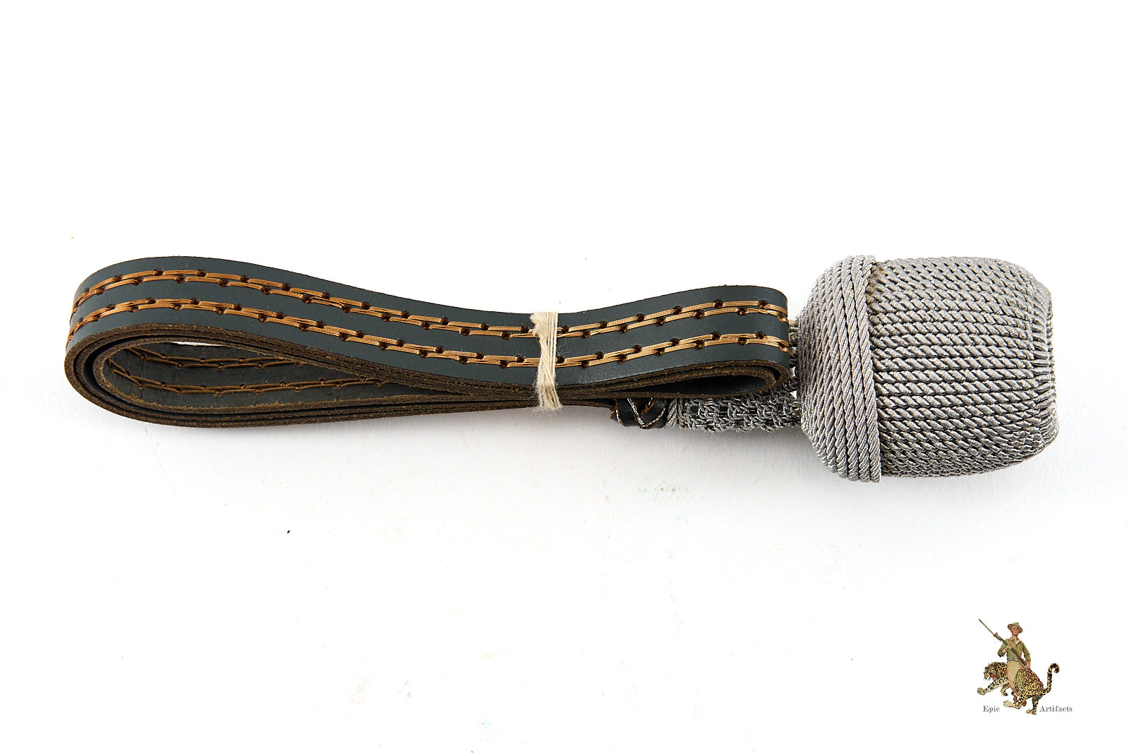 Product Description: Heer Officer’s Sword Portepee – Troddel – Small Version, featuring silver acorn and silver & gray leather slide, paired with dark gray leather strap with toned cellulose thread. This Heer Officer’s Sword Portepee – Troddel – Small Version is in near mint condition, showing minimal signs of wear. Colors remain vibrant with no fraying, making it an excellent and hard-to-find piece for collectors of WWII German militaria or edged weapon accessories.