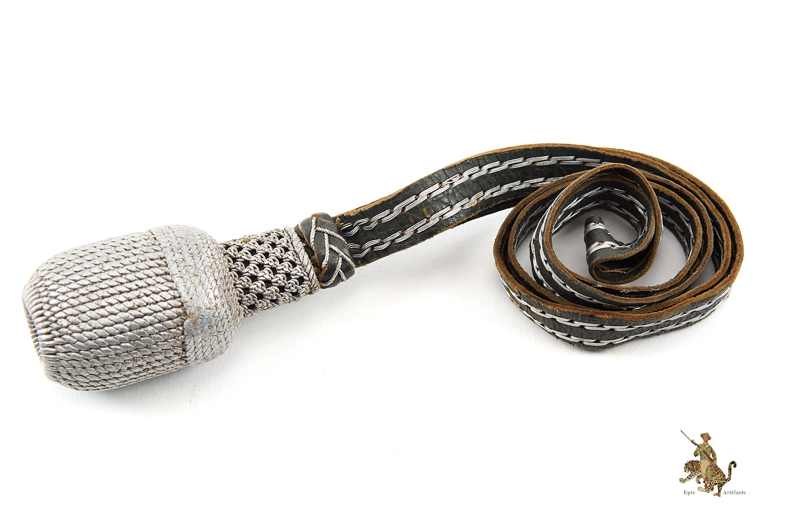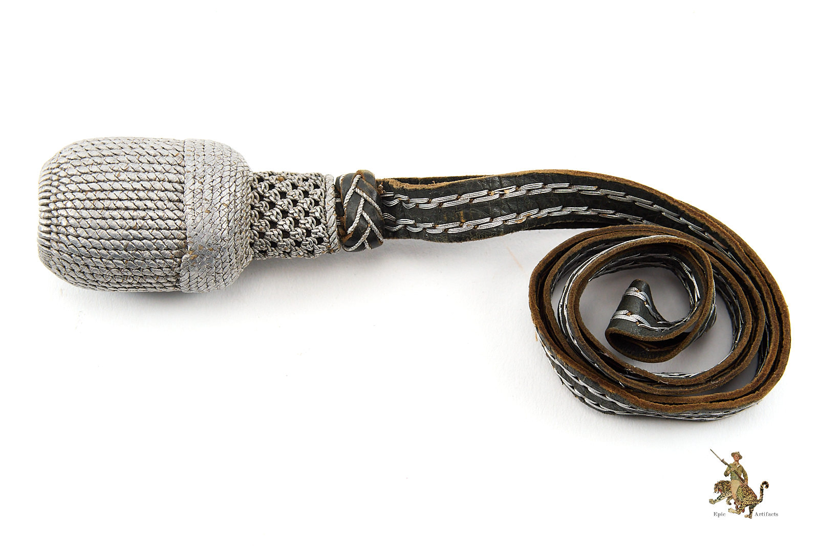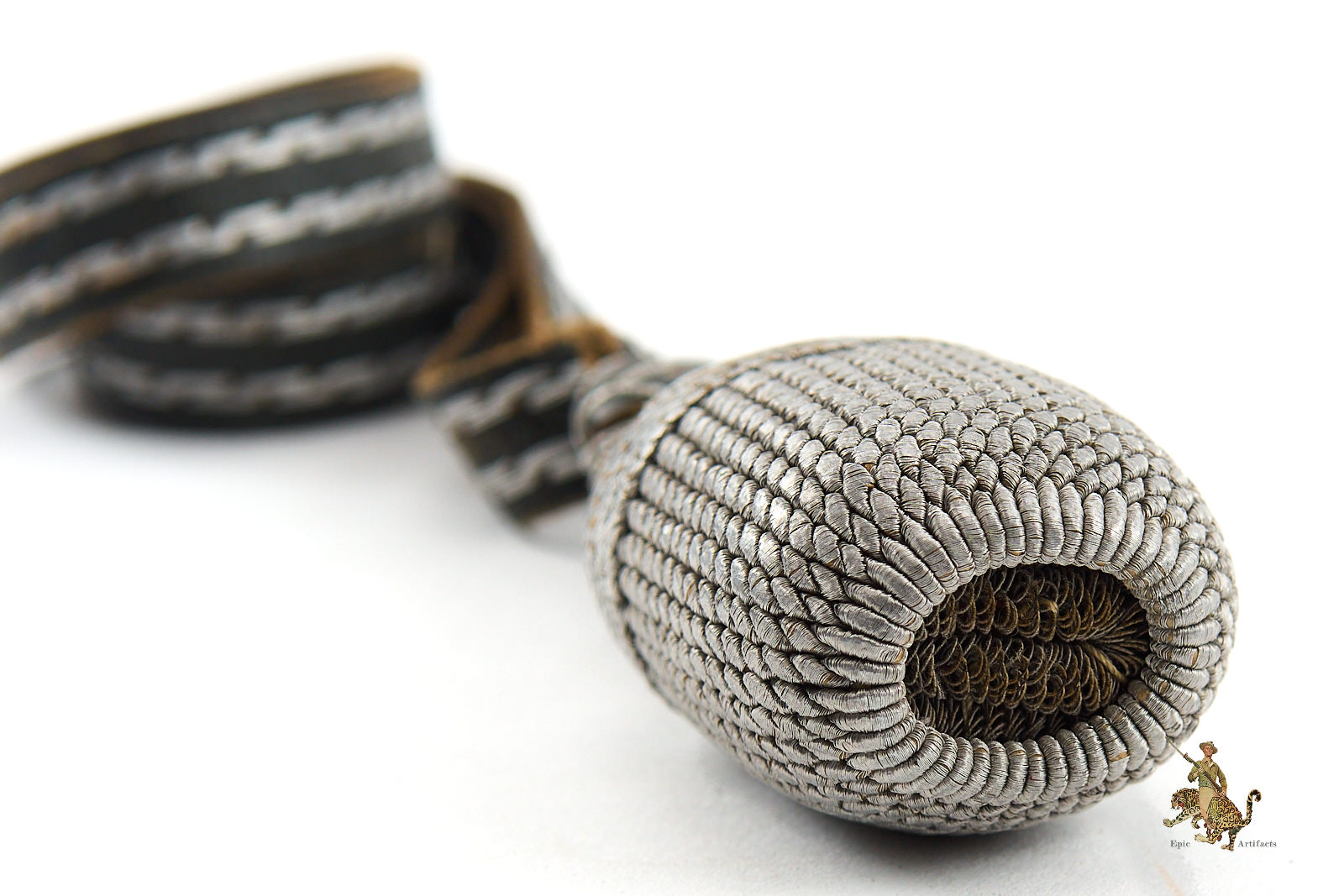 Product Description: Heer Officer’s Sword Portepee – Troddel – Small Version, featuring silver acorn and silver & gray leather slide, paired with dark gray and silver leather strap. This Heer Officer’s Sword Portepee – Troddel – Small Version is in near mint condition, showing minimal signs of wear. Colors remain vibrant with no fraying, making it an excellent and hard-to-find piece for collectors of WWII German militaria or edged weapon accessories.